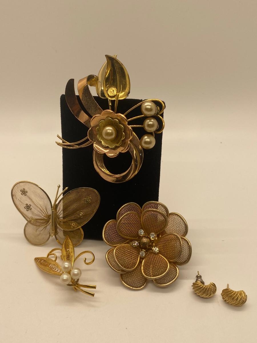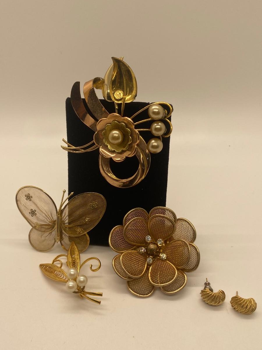 LOT 17: Fun Vintage Goldtone Brooches and a pair of pierced earrings