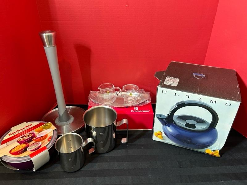 Kettle, sugar & cream set, measuring cups, prep bowls