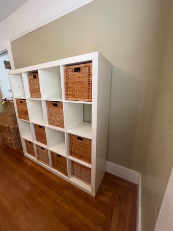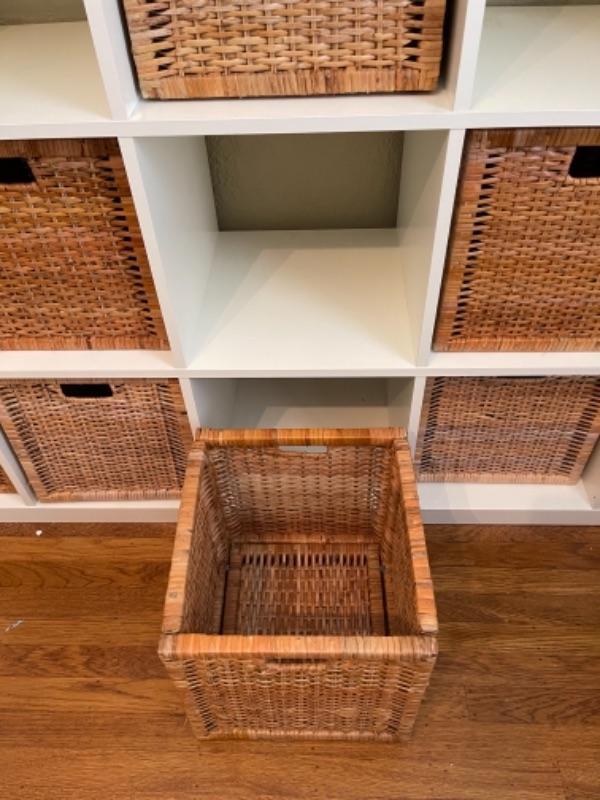 Lot 72BR. One book shelf with 10 baskets“”Ikea“”59”L x 15-1/4”D x 50”T (shelf); 12-1/2”L x 12-1/2”H x 13-1/2”D (baskets)--$90