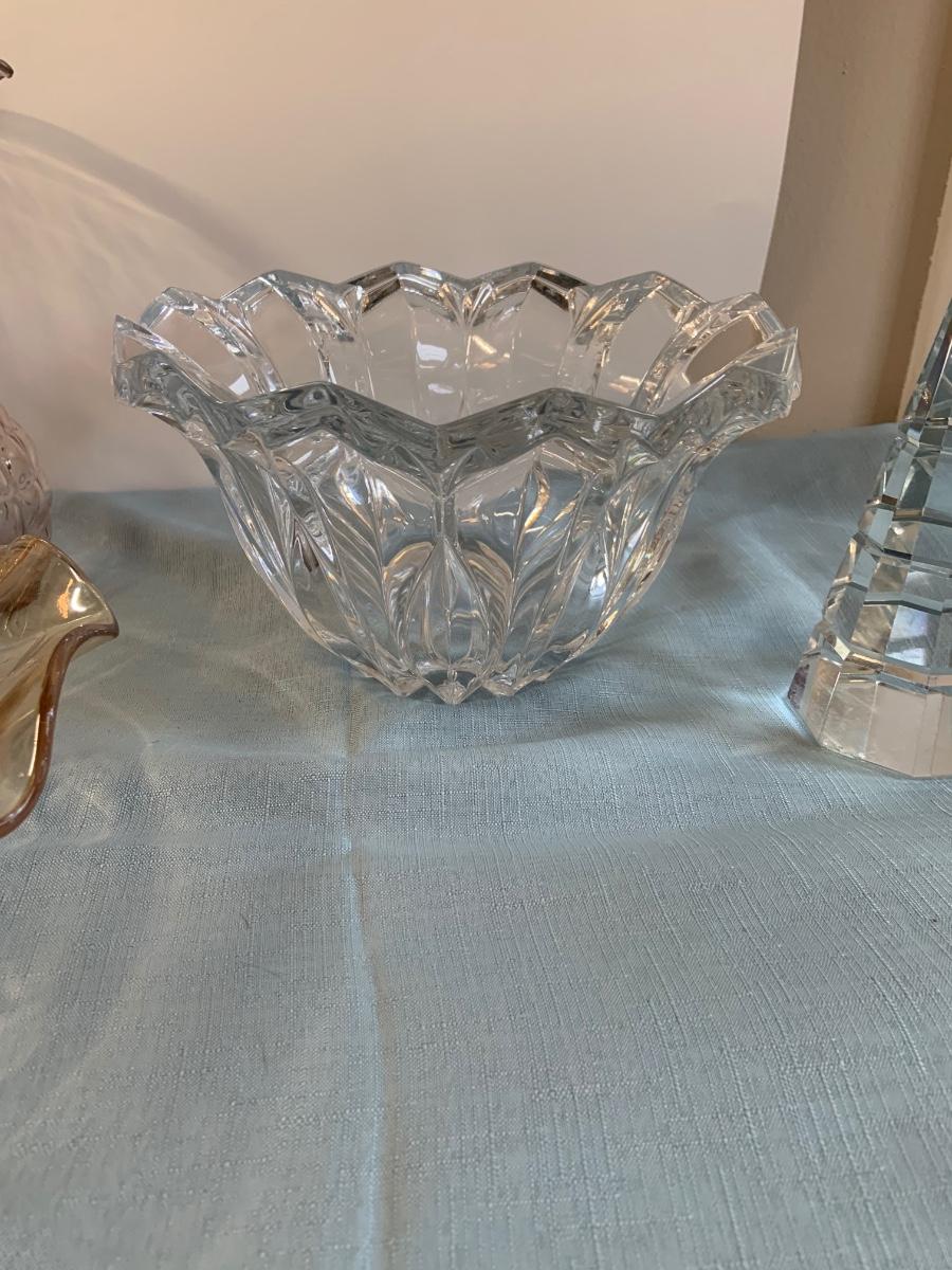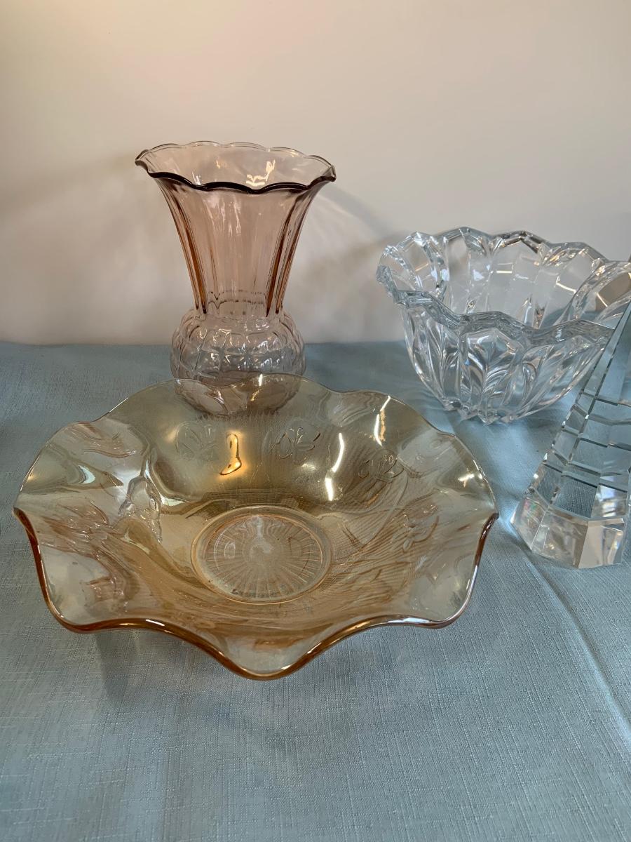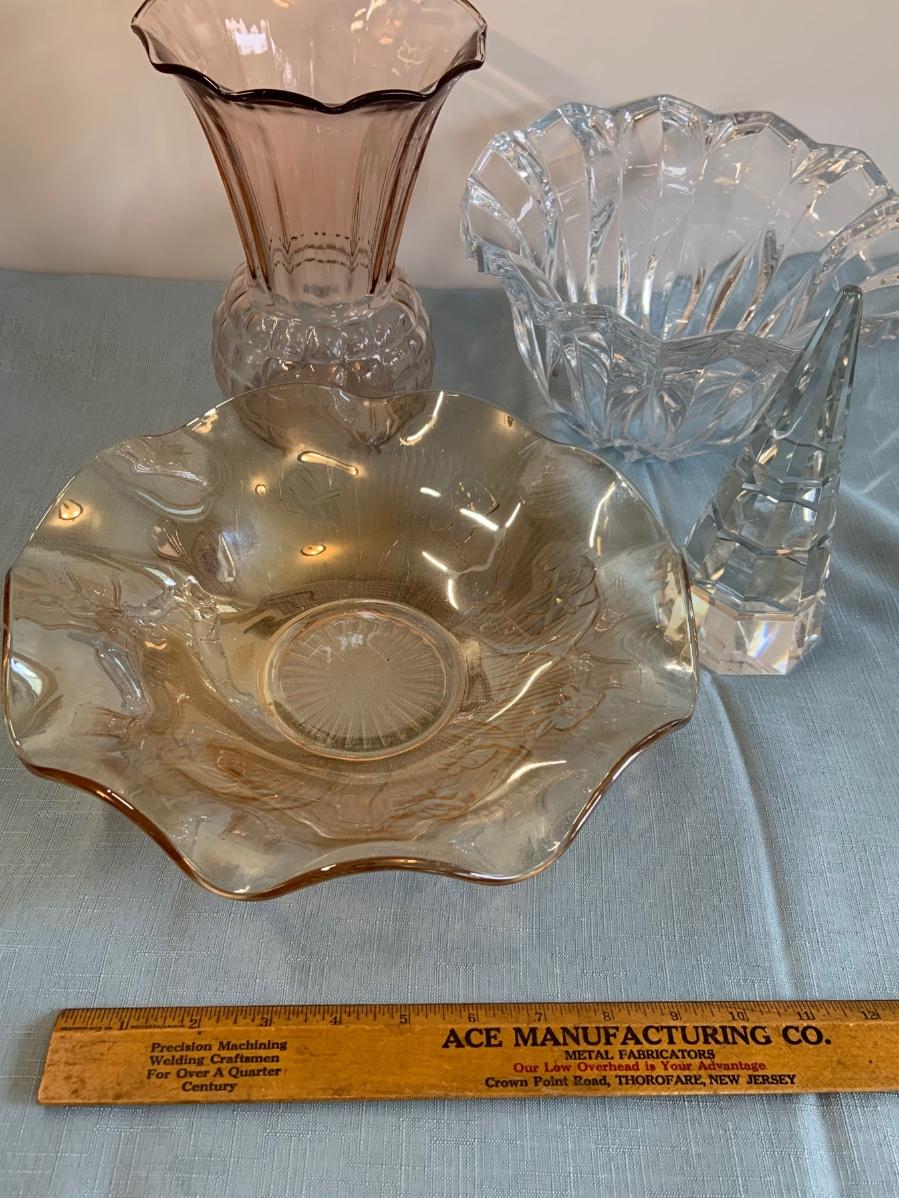 Lot 72G: Cut and Etched Glass Bowls, Glass Vase and Crystal Tree
