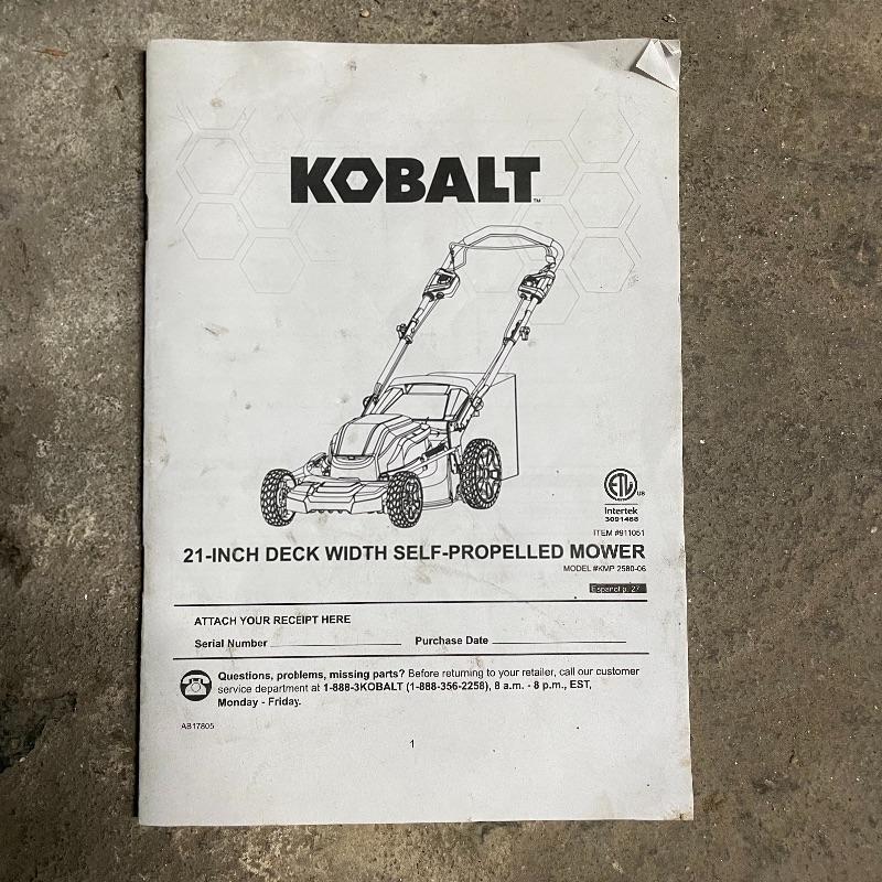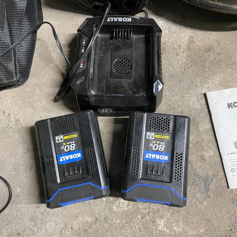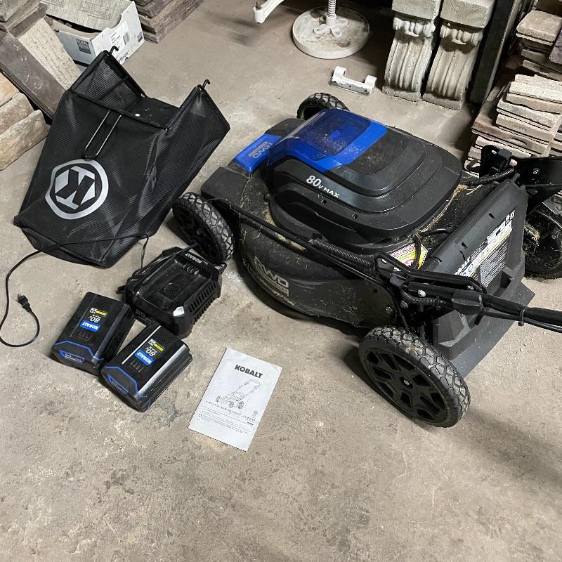 21” Deck, battery powered lawn mower by Kobalt. Lawn Mower states it’s self propelled, and is complete with two batteries, charger and grass catcher bag. Mower blades turned and self propelled when tested. Piece appears to be in great shape. Local Pick up only.
