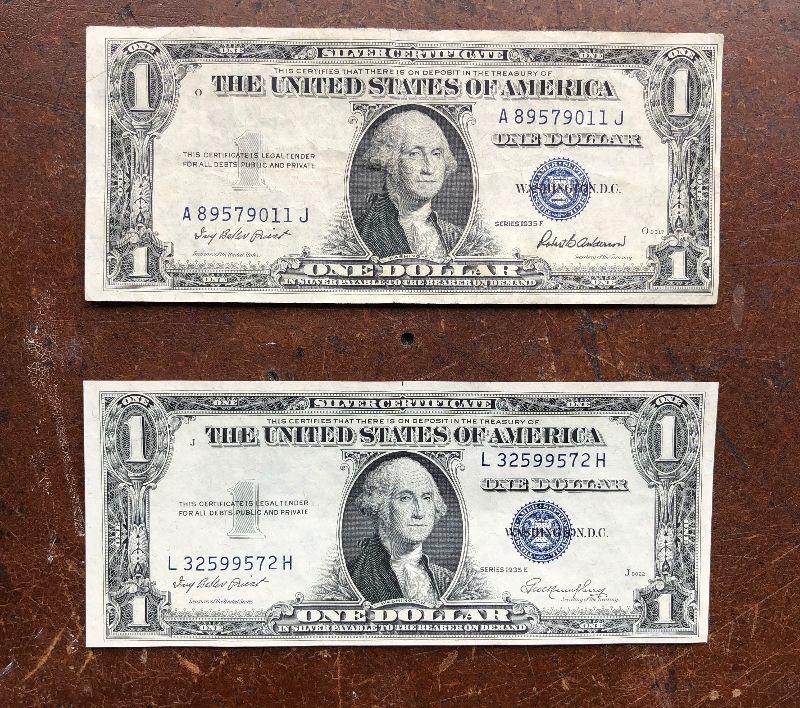 Lot 73, 2 1935 Series E US Silver Certificates $1 Dollar