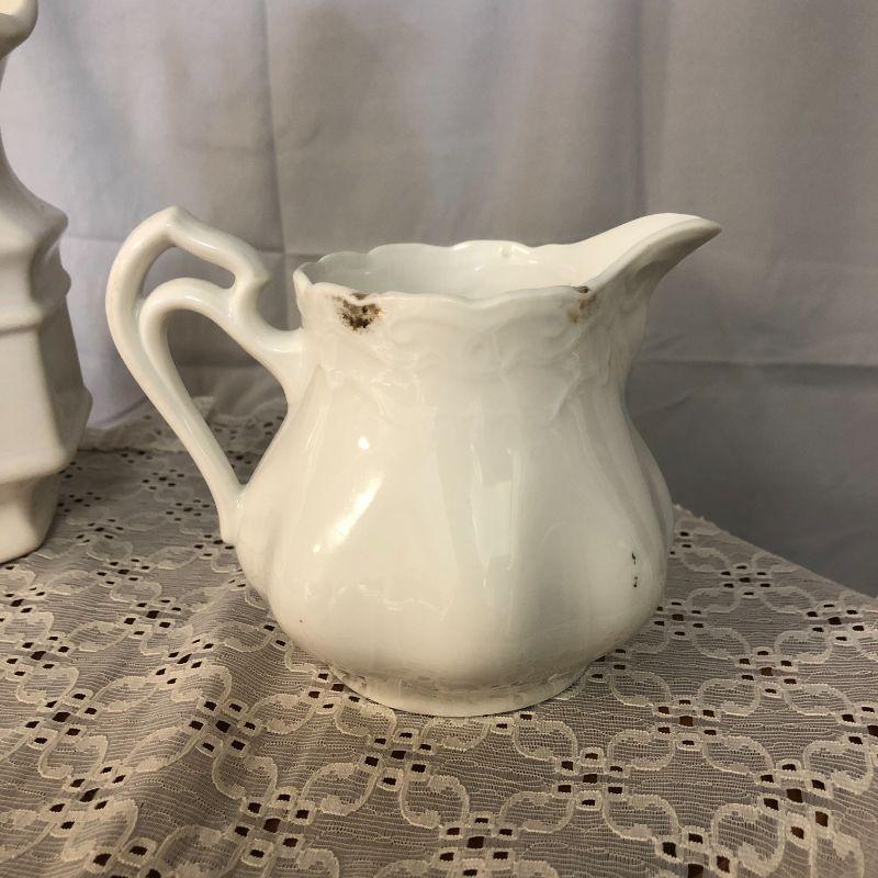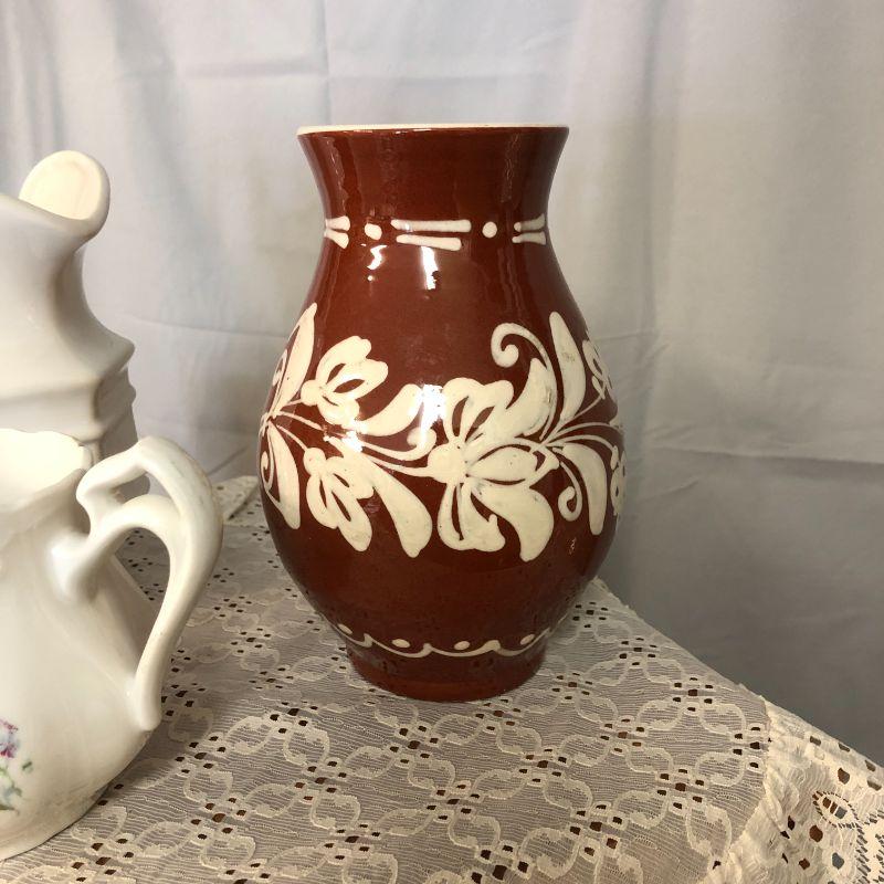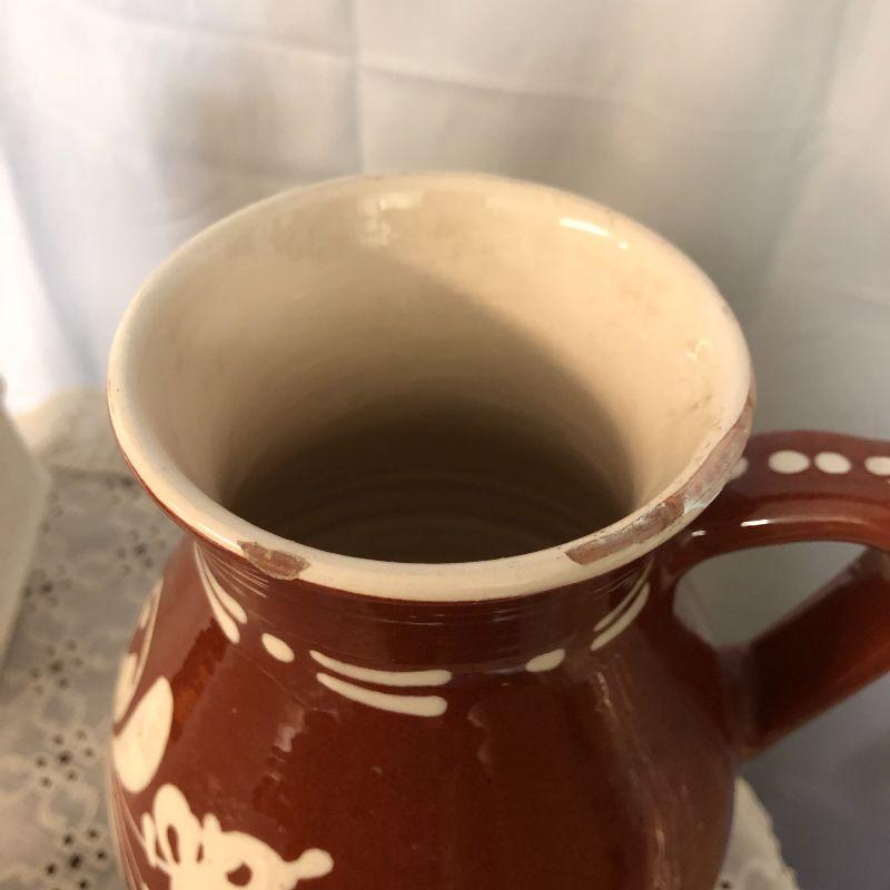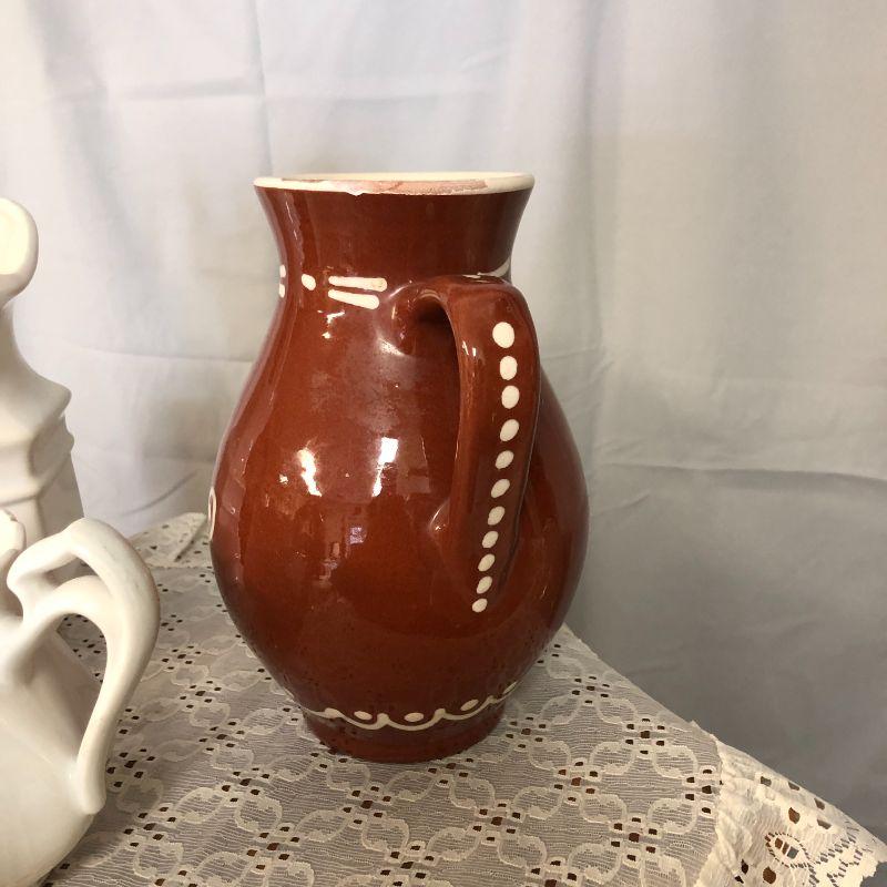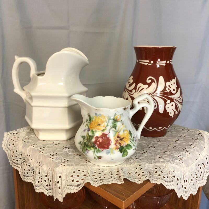 The brown and white one is made in Hungary and stands about 7.25" tall. The only issue is some paint chipping along the rim as seen in the pictures. The small pitcher has some paint wear and is unmarked. It stands about 4.25" tall. The white pitcher is by Haeger and in excellent condition. It stands 7" tall.
