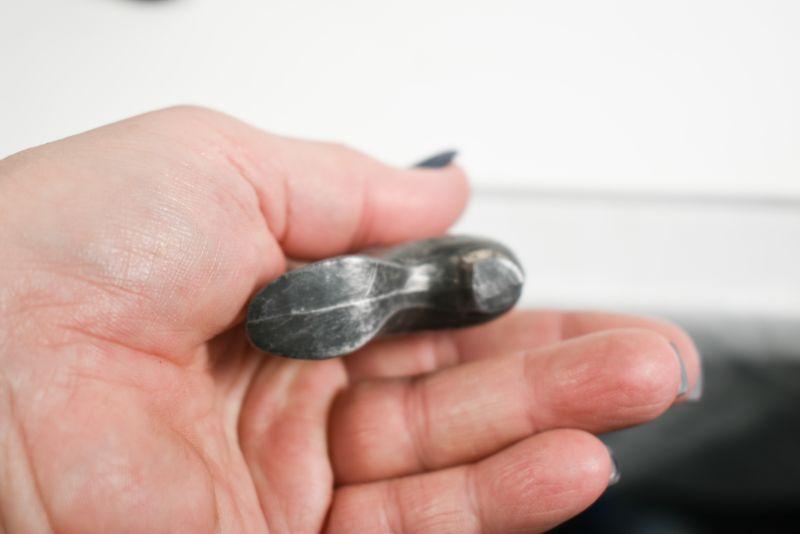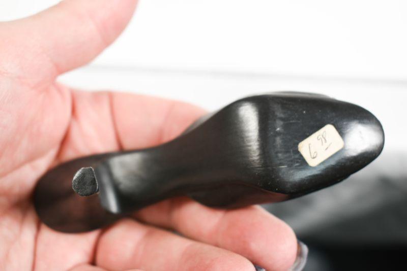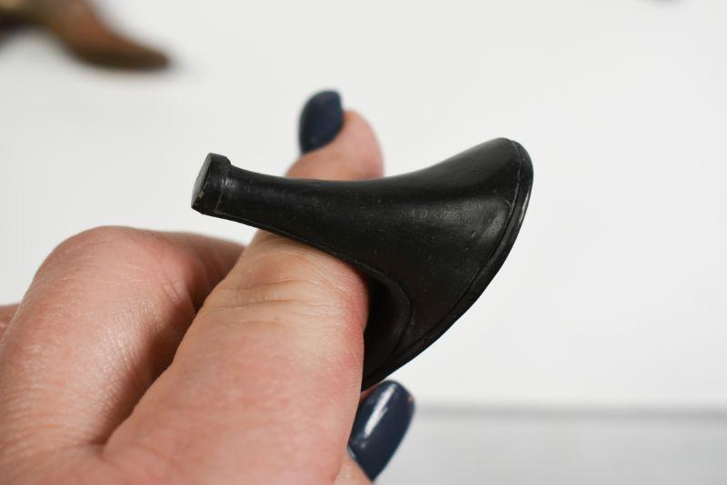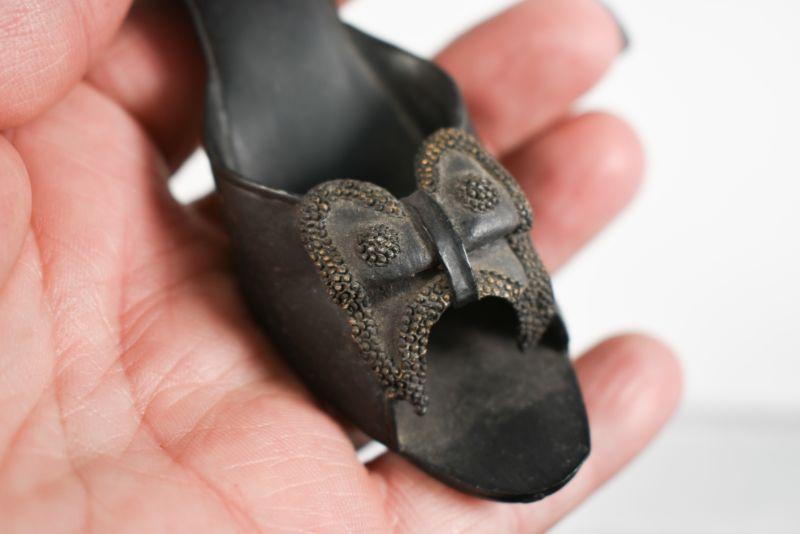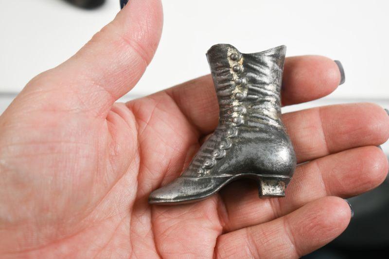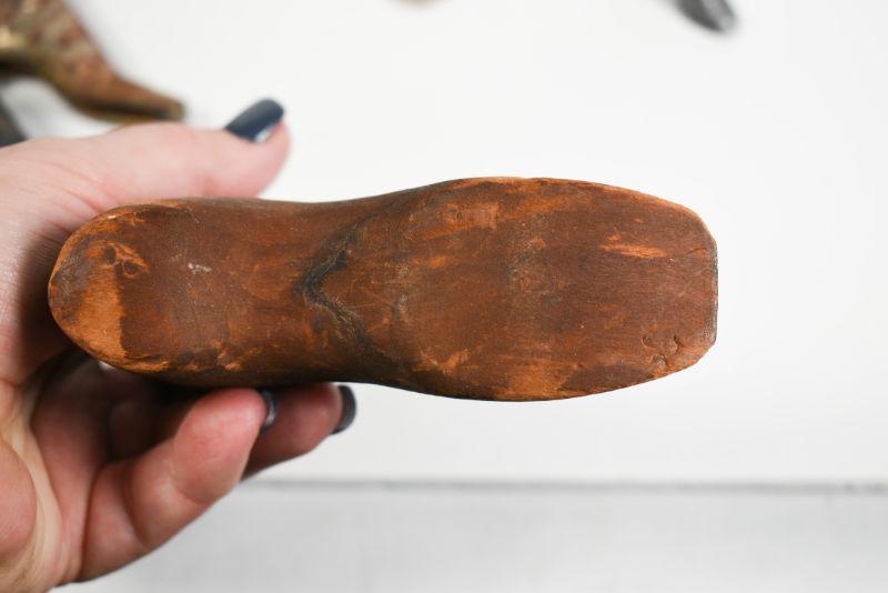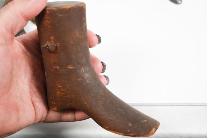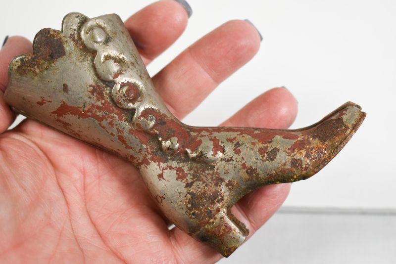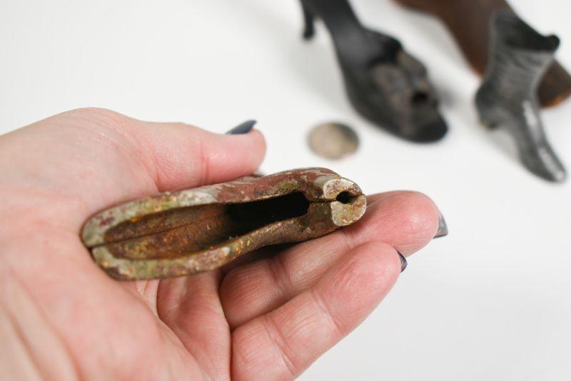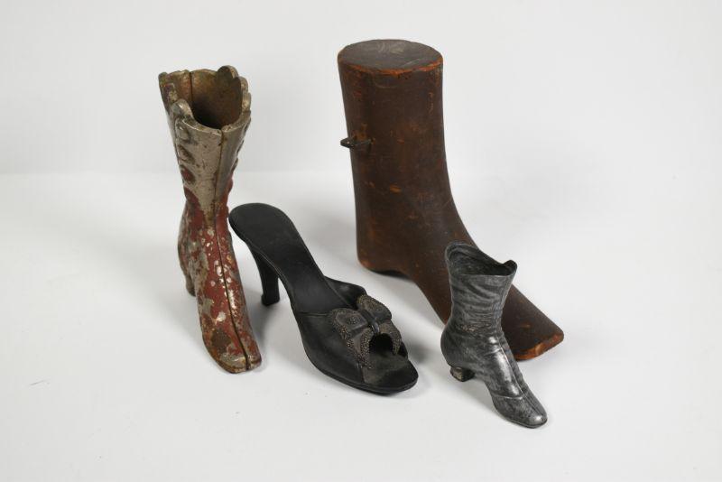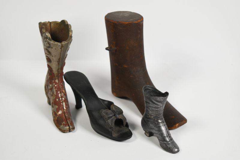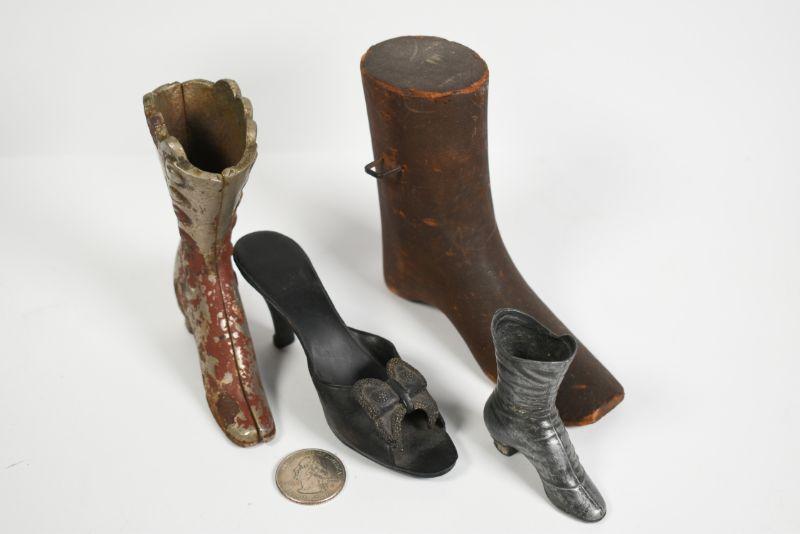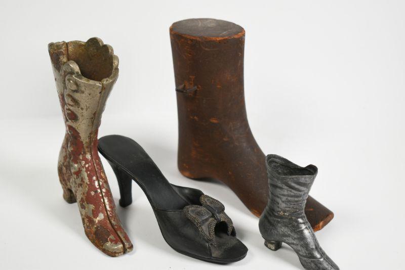 Cast iron high heel boot shows rust and paint loss, small wooden slipper, a child's wooden shoe form, and a small metal boot. **Please read Terms and Conditions before placing a bid. Pick up is Sunday, December 22 from 11am to 3pm or Monday, December 23 from 4pm-7pm in Mantua, NJ. All sales are final. All sales are as is, where is. Please review all photos. Props are not included. Measurements are approximate.