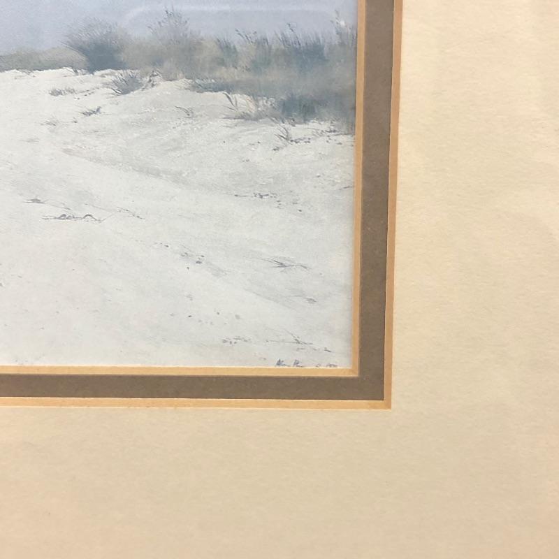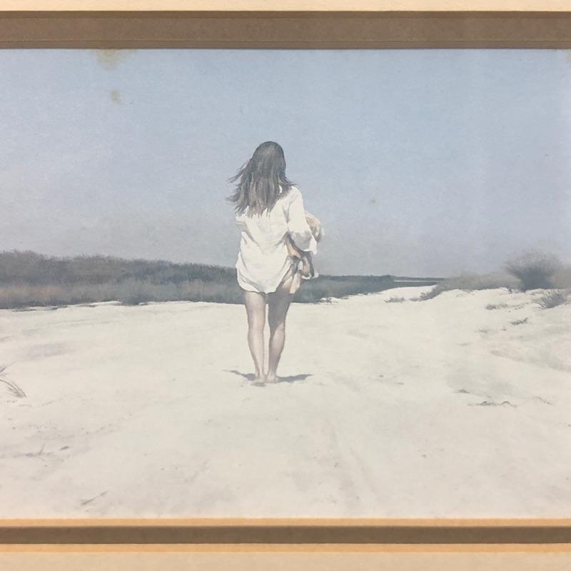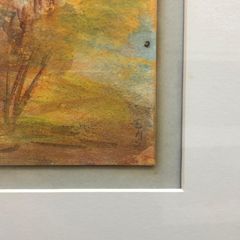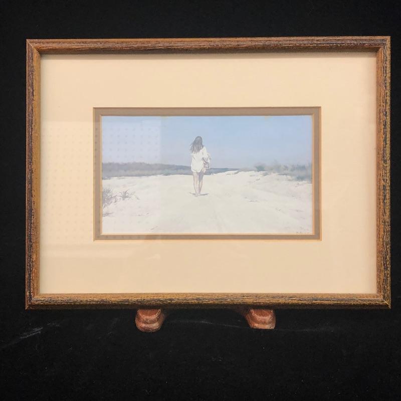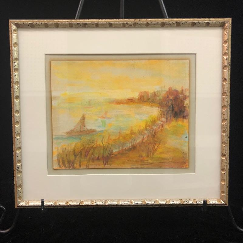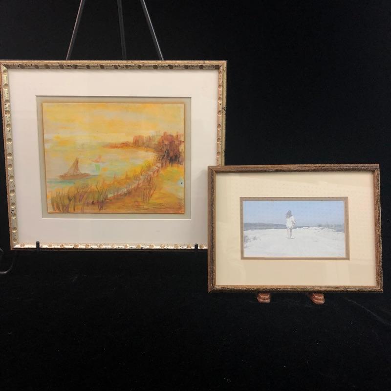 This lot includes two framed pieces, each depicting a waterscape scene. The first piece is a framed and signed EMS. It is a painting of a coastal scene and sailboat painted in warm tones. Looks like an original painting. The other piece is a framed printed card of a painting illustrating a woman walking in the sand. The darker scene measures approximately 15" x 13" and the smaller one is approximately 11.25” x 8.5”. Shipping available. Please call UPS with dimensions at 828-252-6930 for a shipping quote prior to bidding.