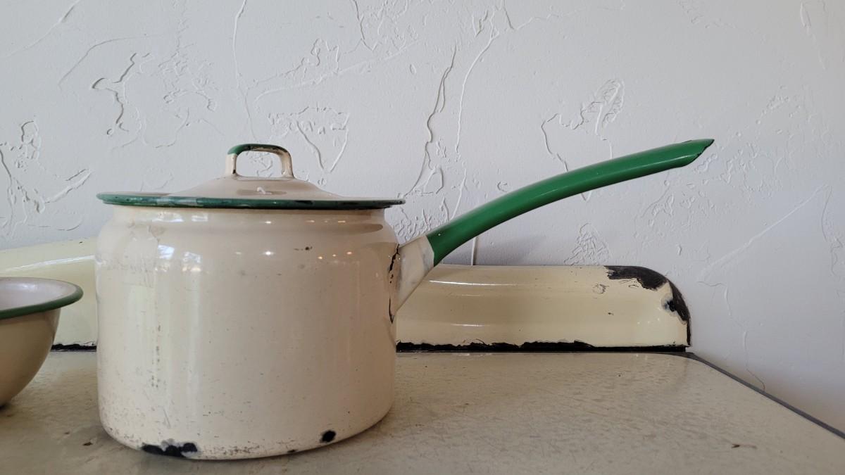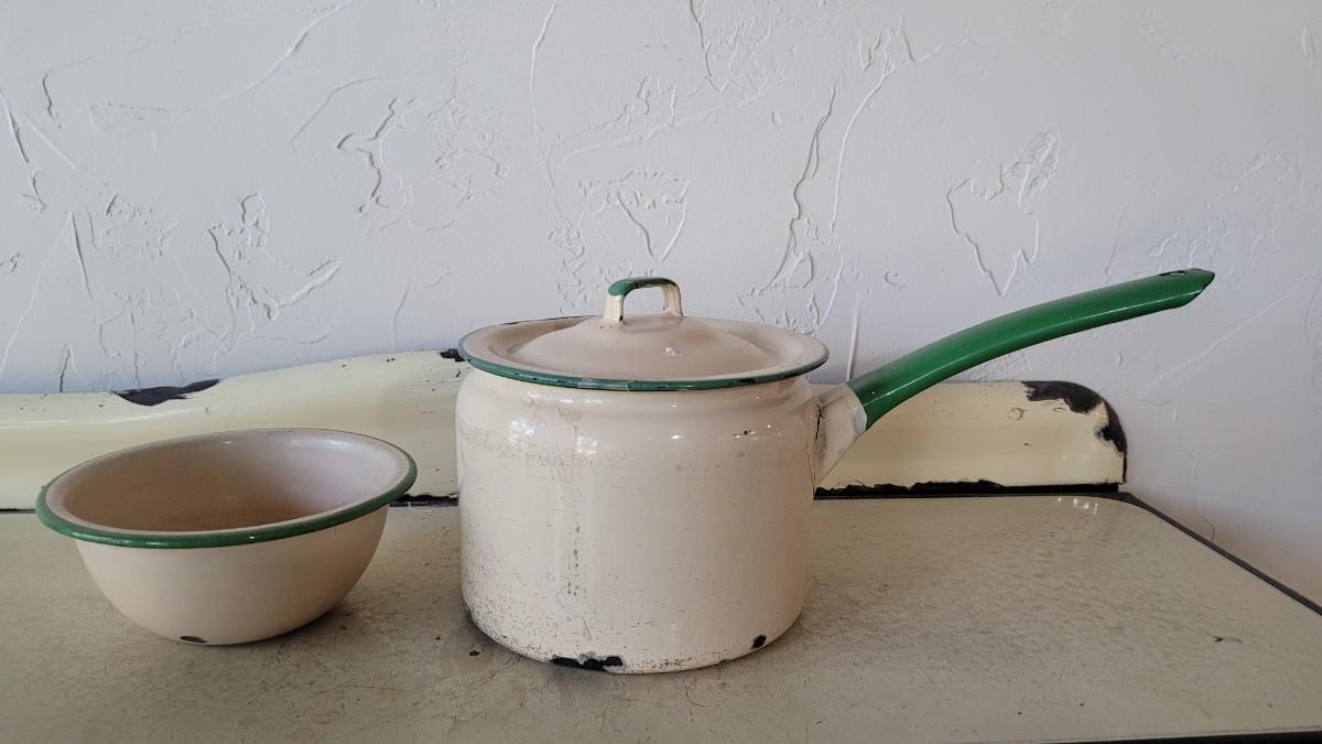 Lot 73: Vintage Green Enamel Pot with Lid and Bowl