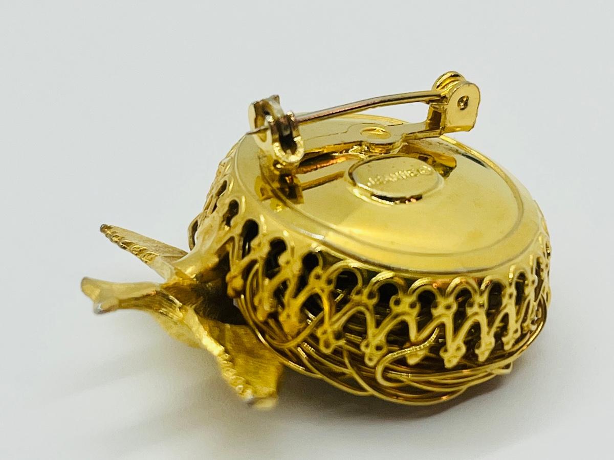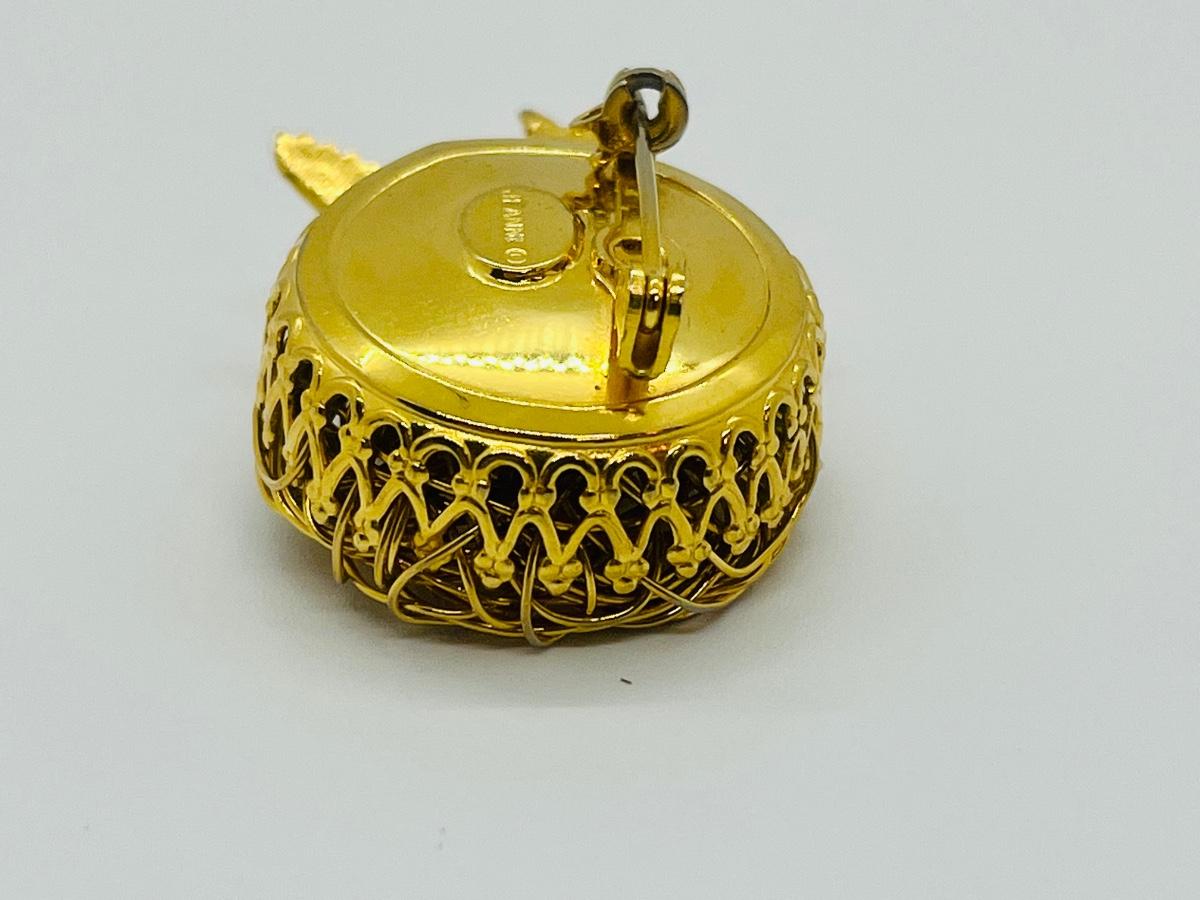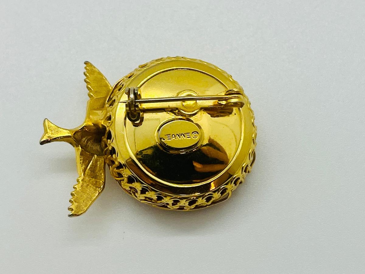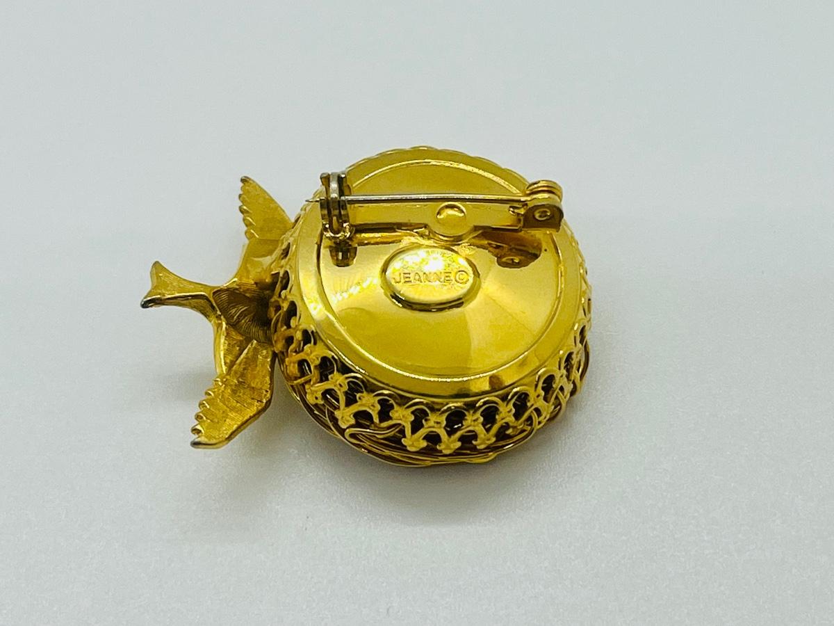 For bird lovers, nice little bird nest with bird and 3 eggs. Gold tone, the brooch is 1 3/8" side to side. The nest is woven of twisted gold tone metal wire and has 3 little eggs made of pearls. The back is marked Jeanne, no damage. Pre-owned , very good condition! The pictures show condition, measurements if taken, and what is included in the lot. Due to the large amount that we photograph and the time frame, we are not always able to take measurements. All items unless noted, are pre-owned and have been used, and are untested. Thank you
