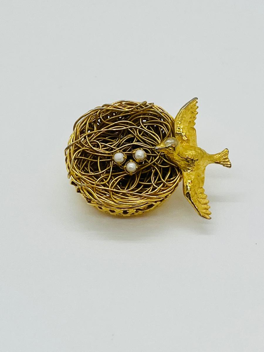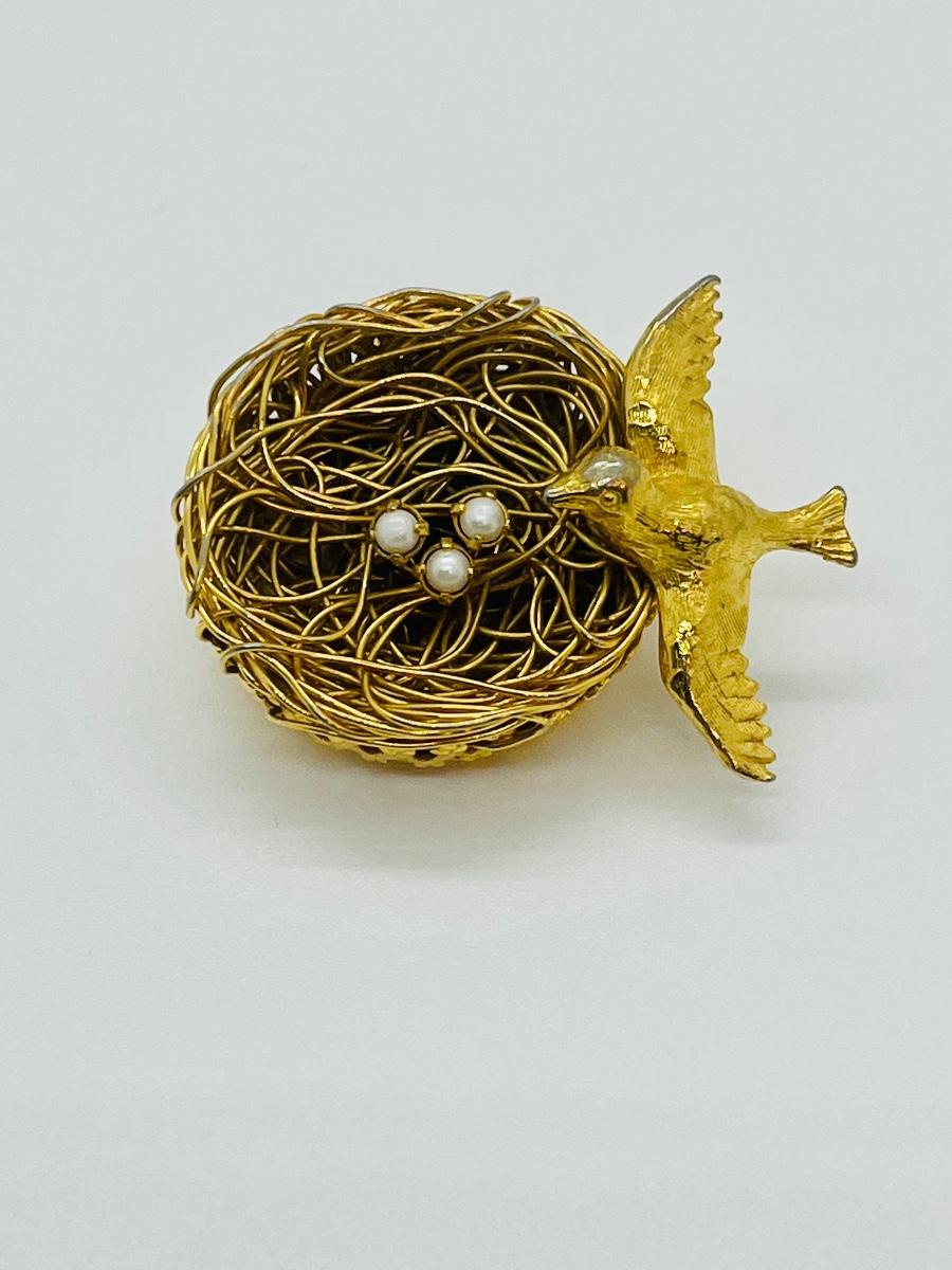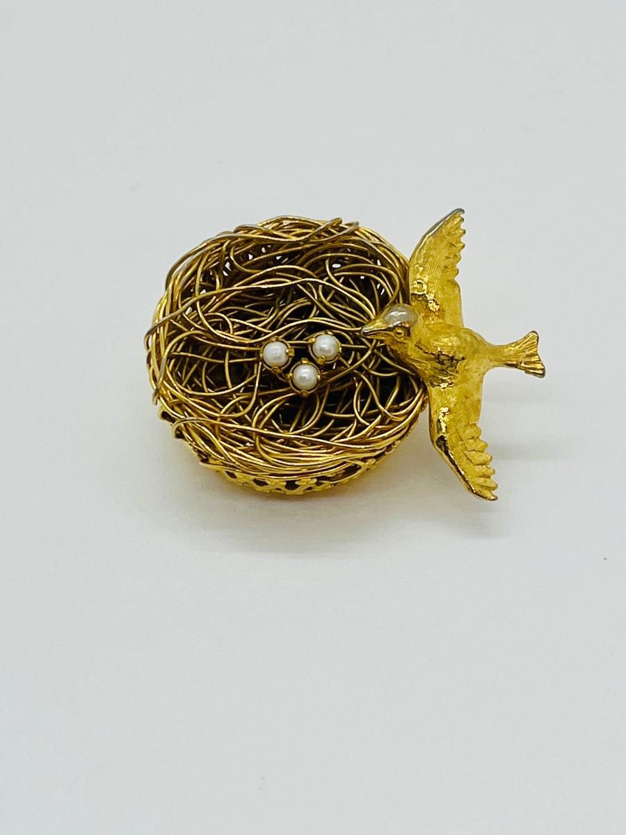 Lot 73: Vintage 3D Brooch Birdnest w/ Seed Pearl Eggs by Jeanne