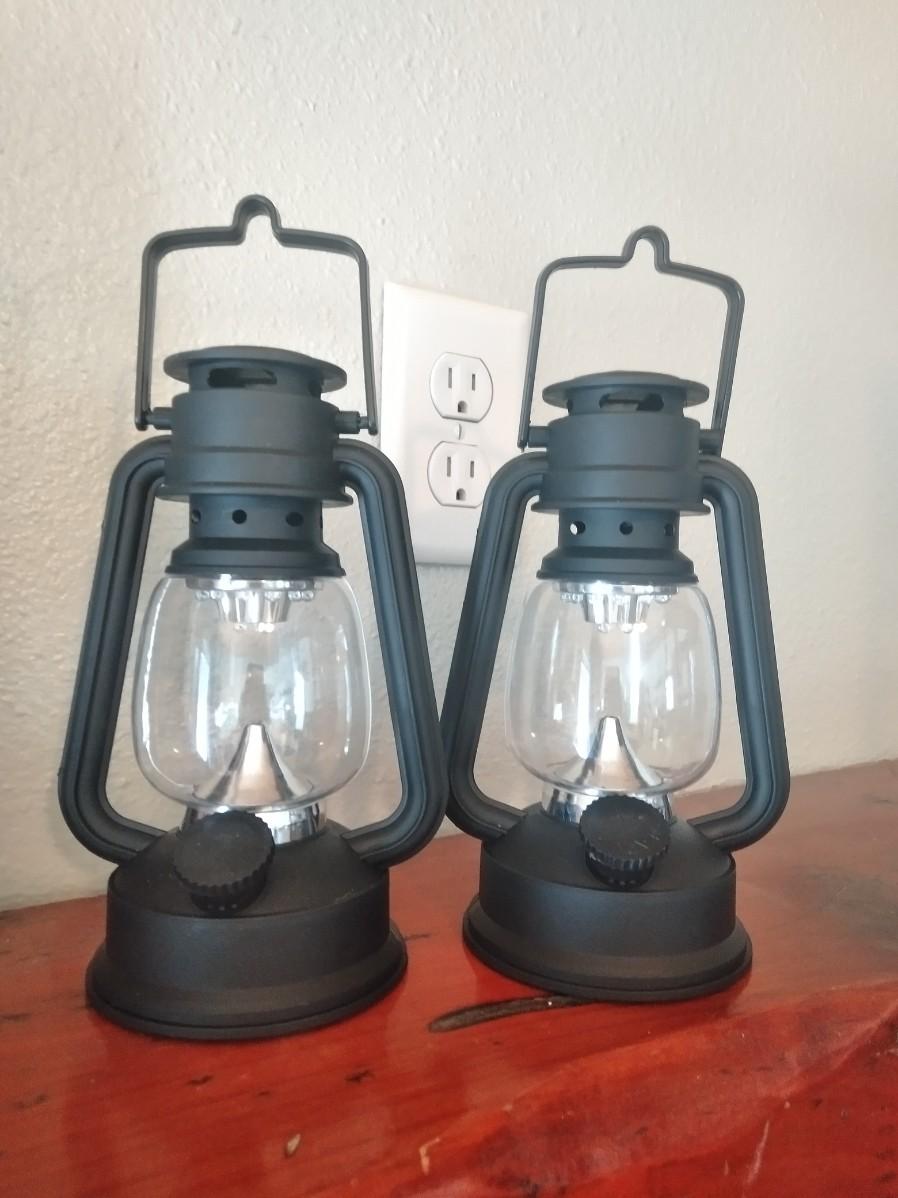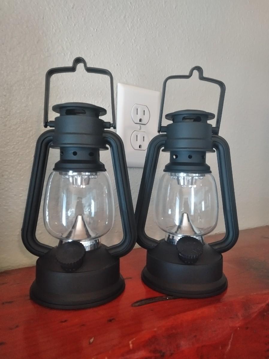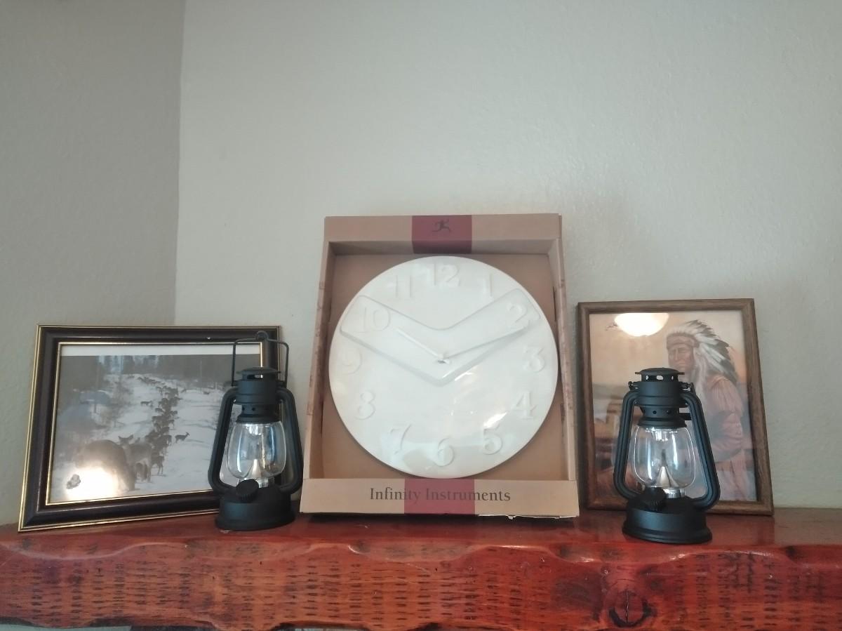2 PLASTIC BATTERY OPERATED LANTERNS, NEW WALL MOUNTED CLOCK, 2 FRAMED PICTURES
