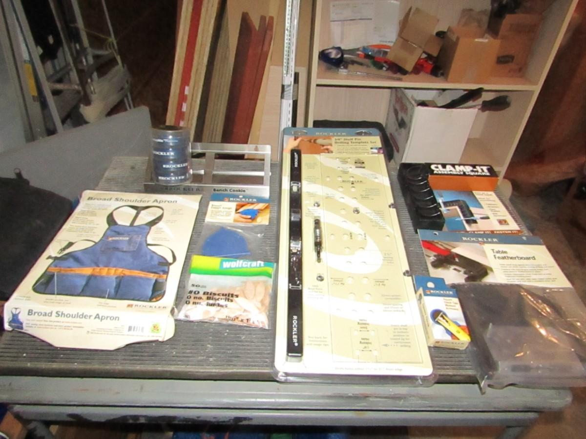 BROAD SHOULDER APRON, BISCUIT CUTTER GAUGE AND BISCUITS, BENCH COOKIES AND HOLDER, 1/4" SHELF PIN DRILLING TEMPLATE SET, TABLE FEATHERBOARD, SQUARE CHECK TAPE MEASURE ACCESSORY, CLAMP-IT