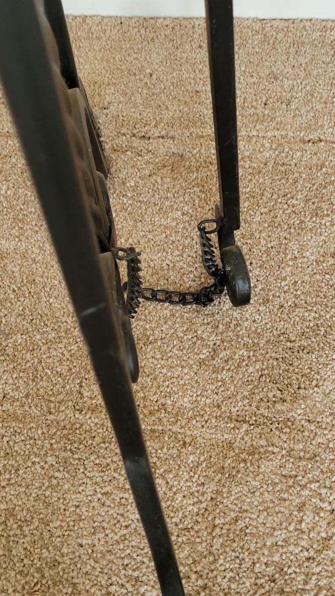 Folds flat for easy storage. Has a chain that keeps the swinging leg from over extending.