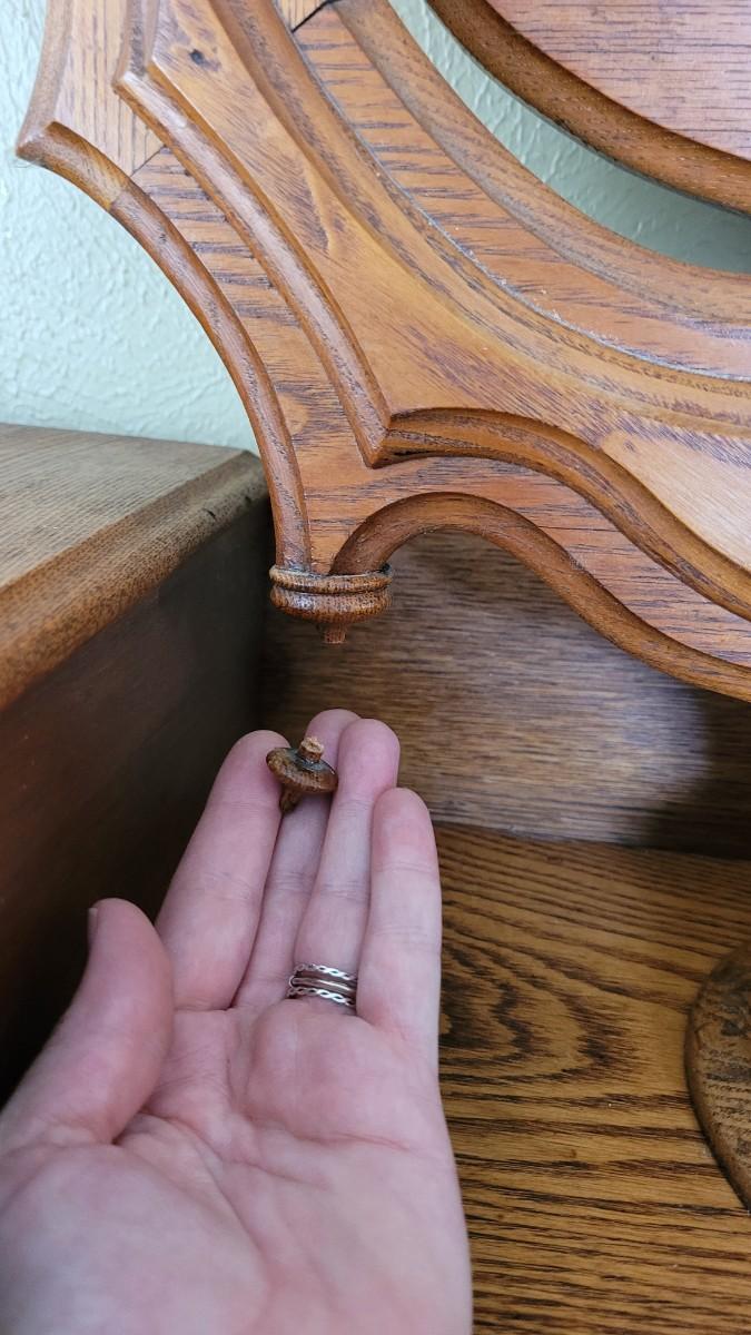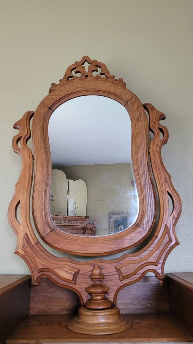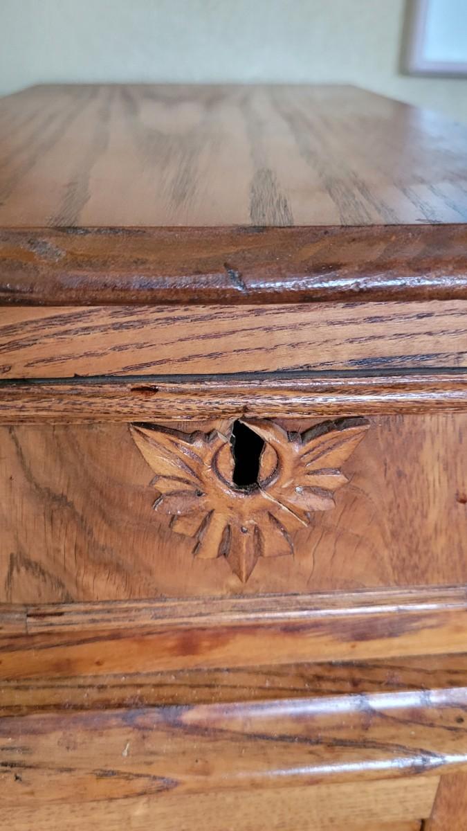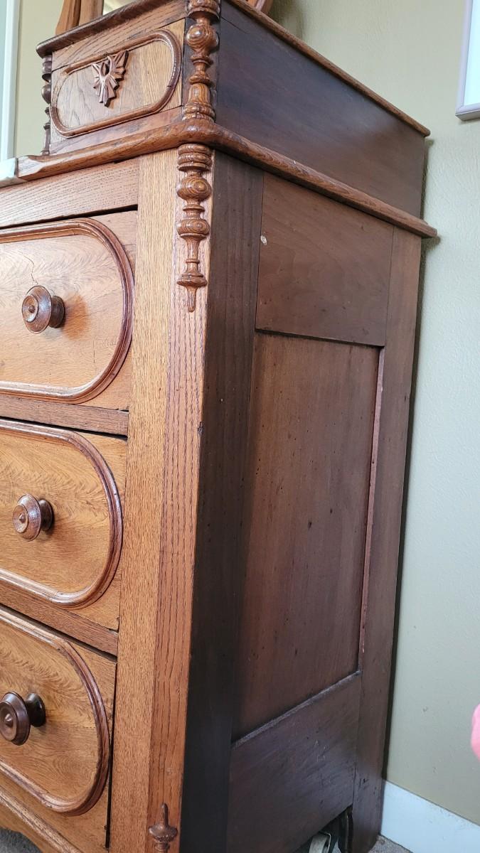 One of the top drawers is locked and doesn't open due to the lock being broken. There is also a small piece that has broken off the mirror, it is present and ready to be reattached. Has 4 original casters/wheels. The mirror and it's base lift out of the top of the dresser. In over all great condition.