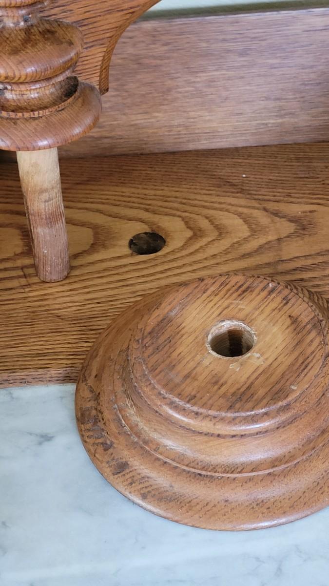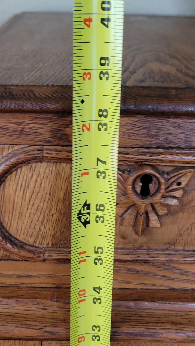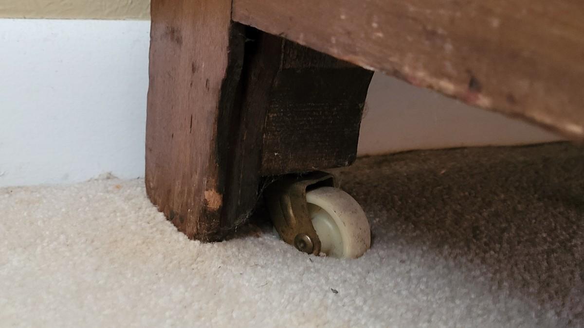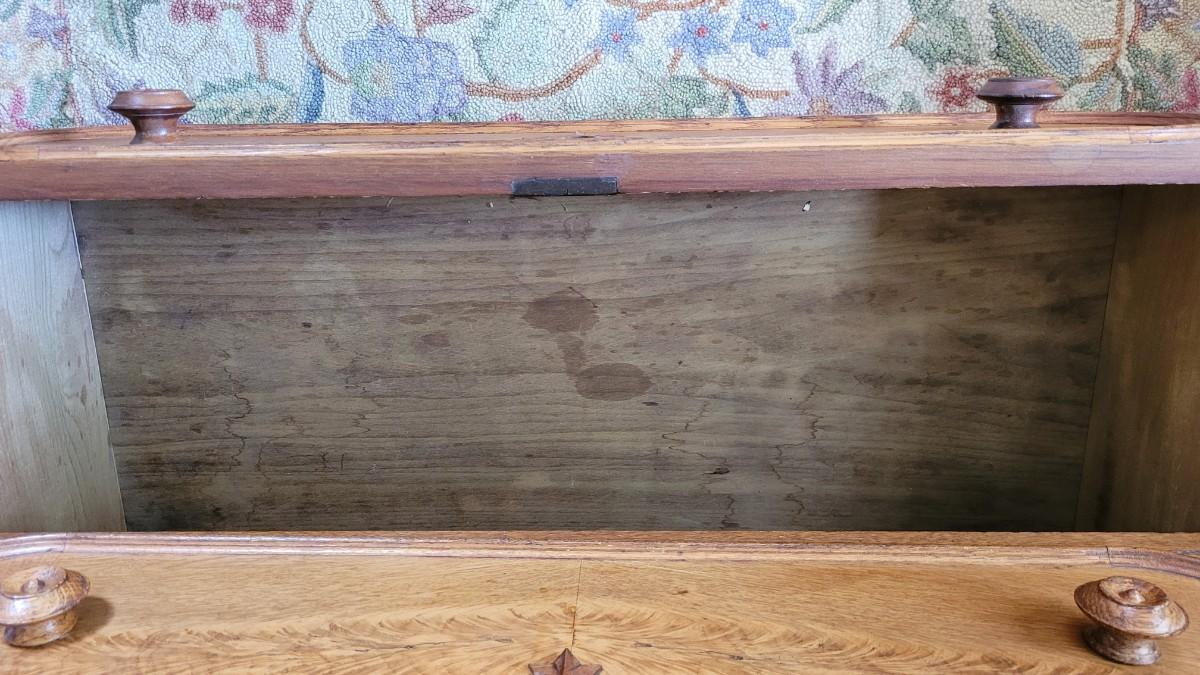 One of the top drawers is locked and doesn't open due to the lock being broken. There is also a small piece that has broken off the mirror, it is present and ready to be reattached. Has 4 original casters/wheels. The mirror and it's base lift out of the top of the dresser. In over all great condition.