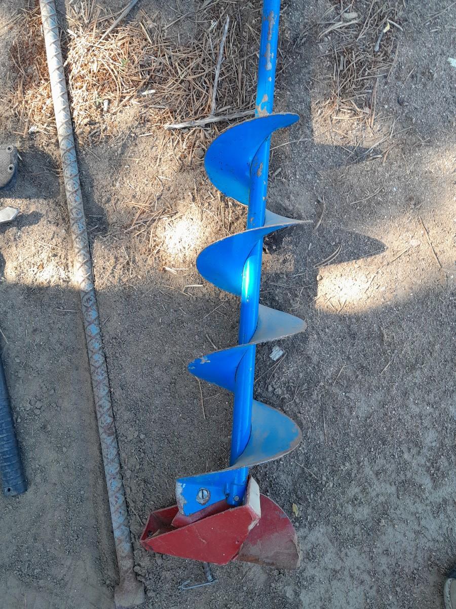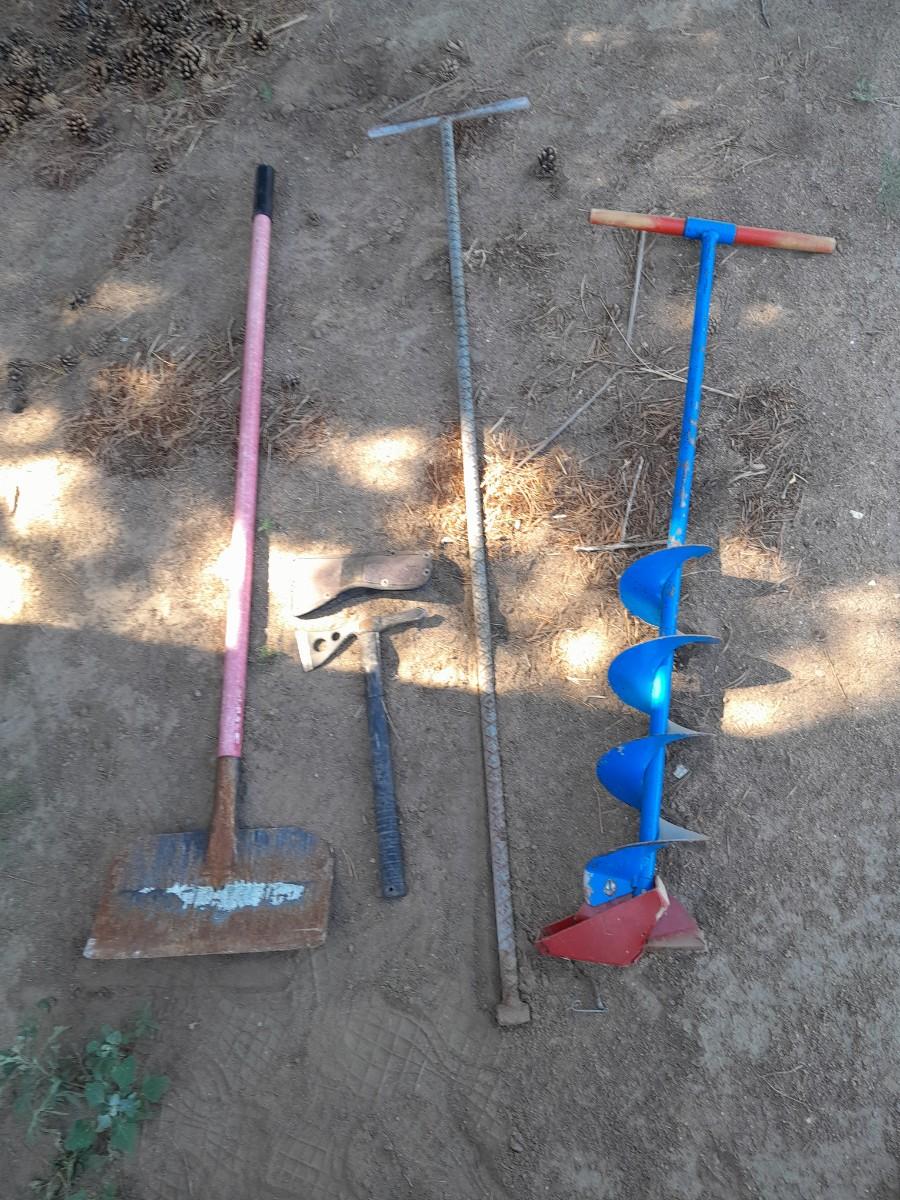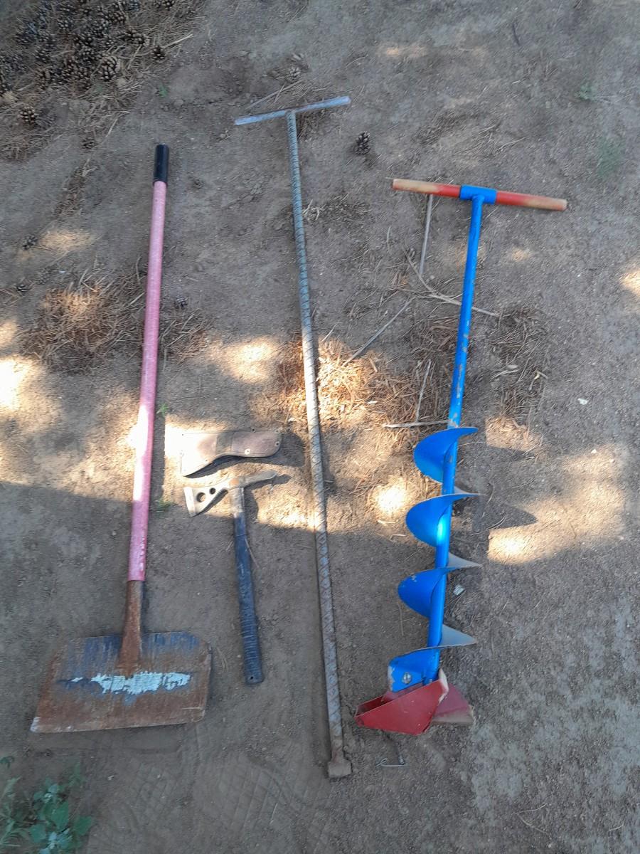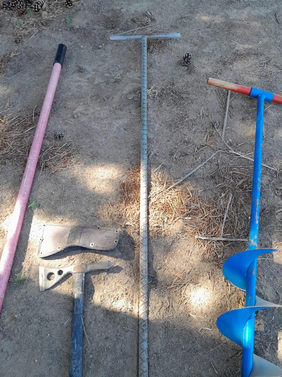 DUAL HANDLED AUGER, REBAR WATER VALVE TOOL, HATCHET AND SCRAPER.