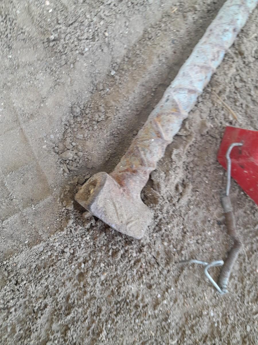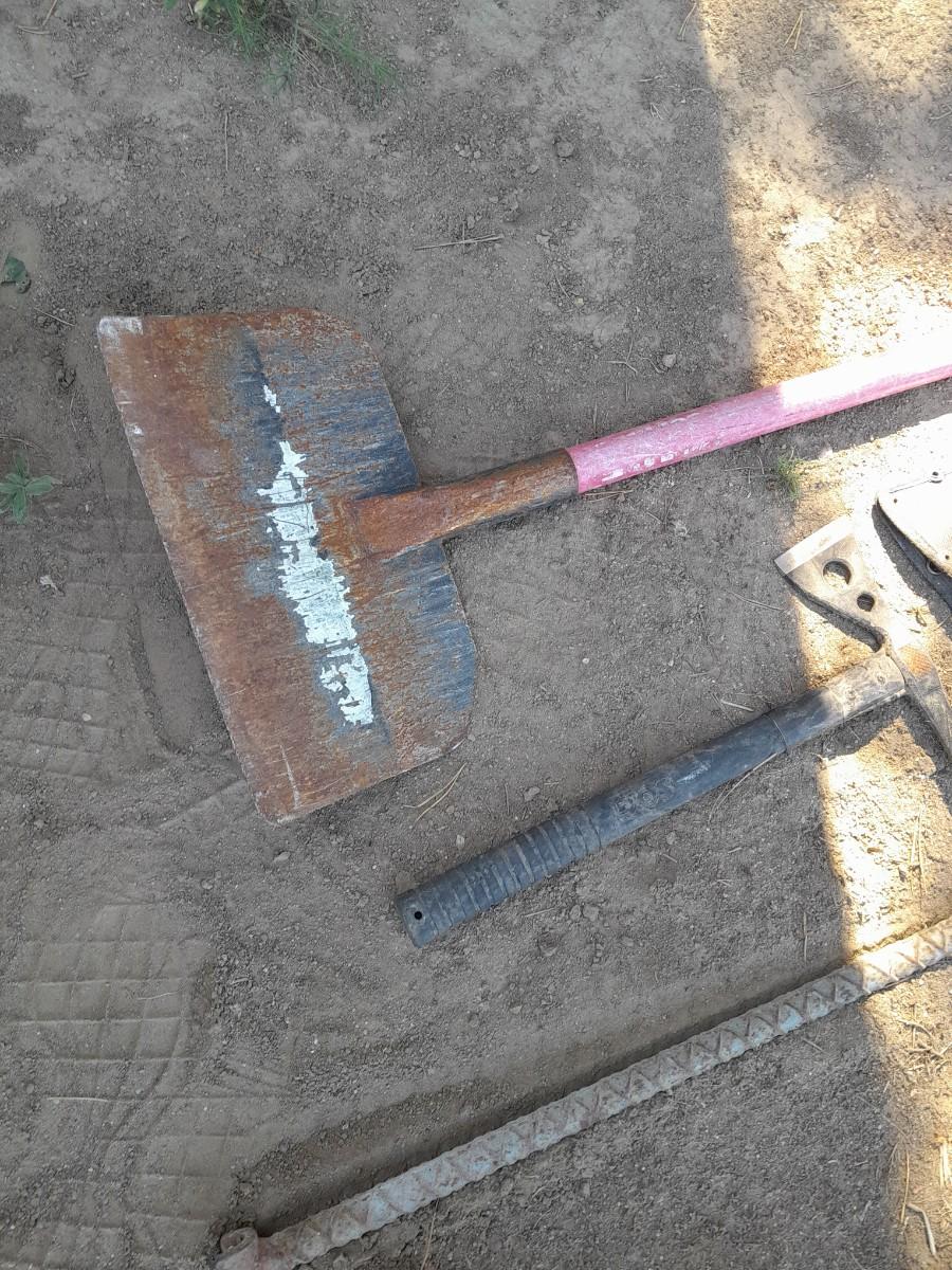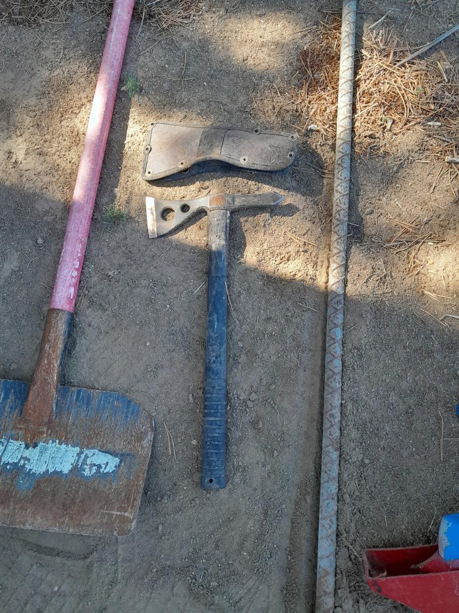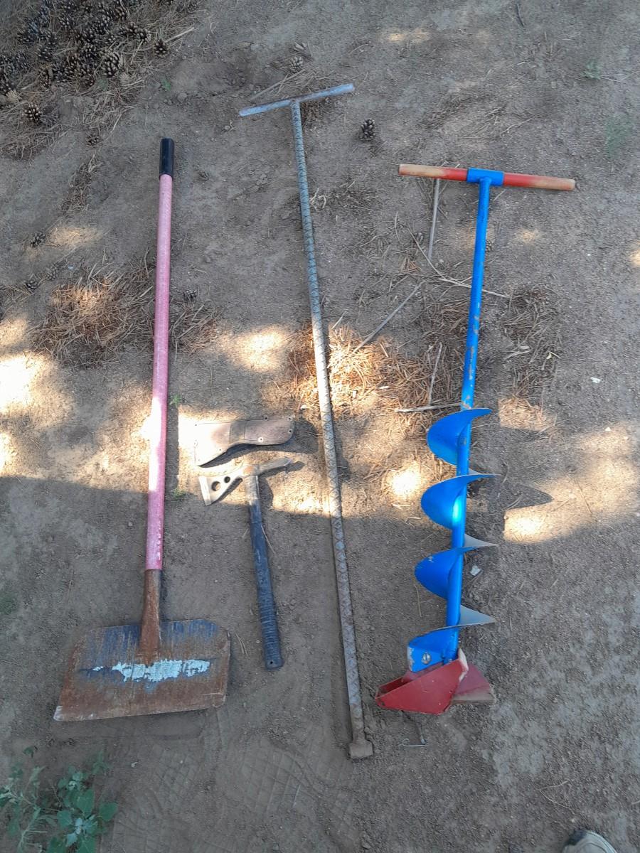 DUAL HANDLED AUGER, REBAR WATER VALVE TOOL, HATCHET AND SCRAPER.