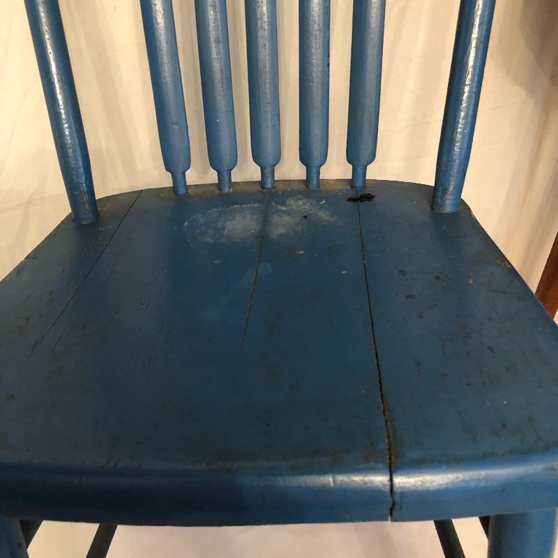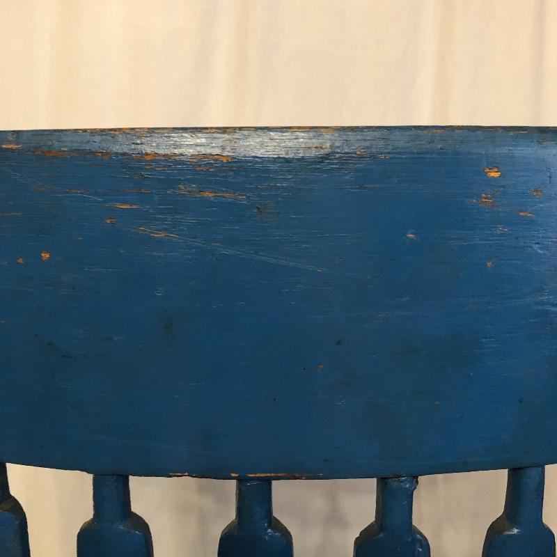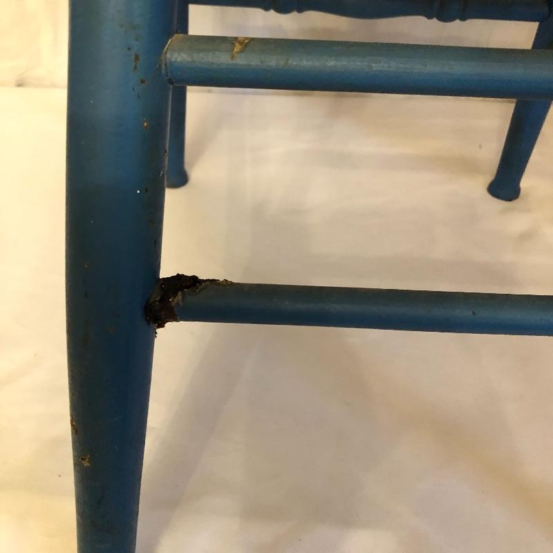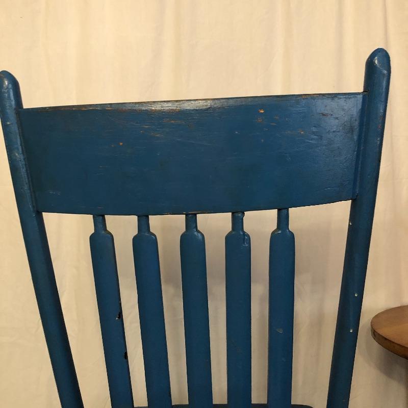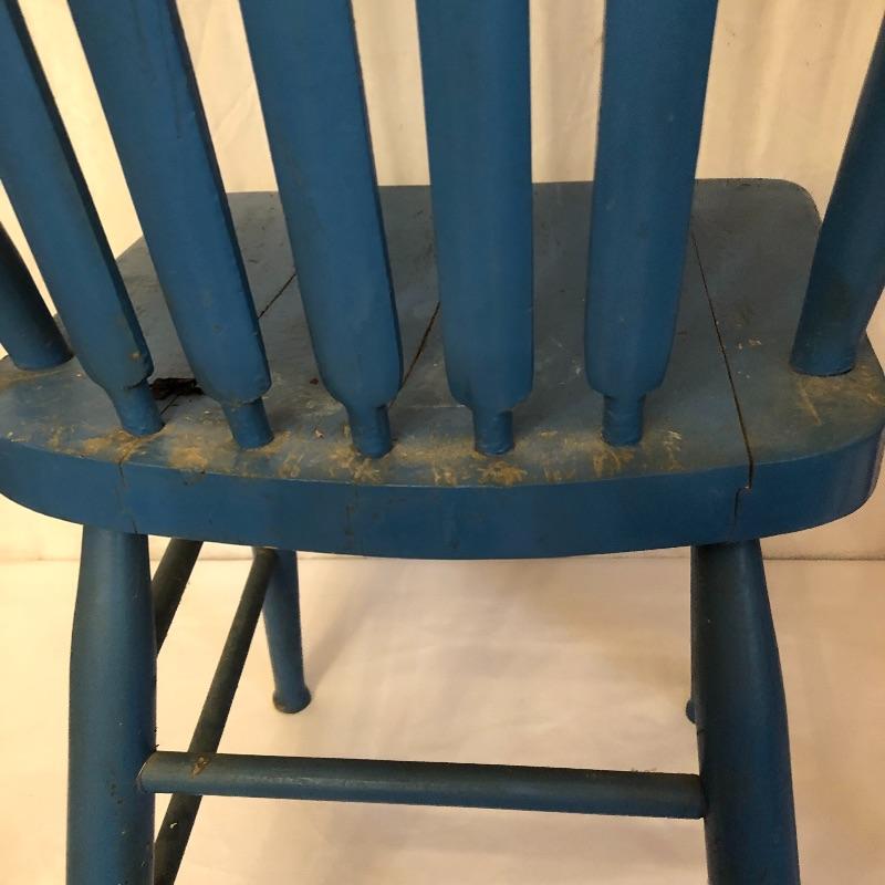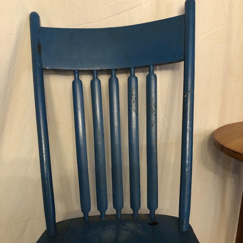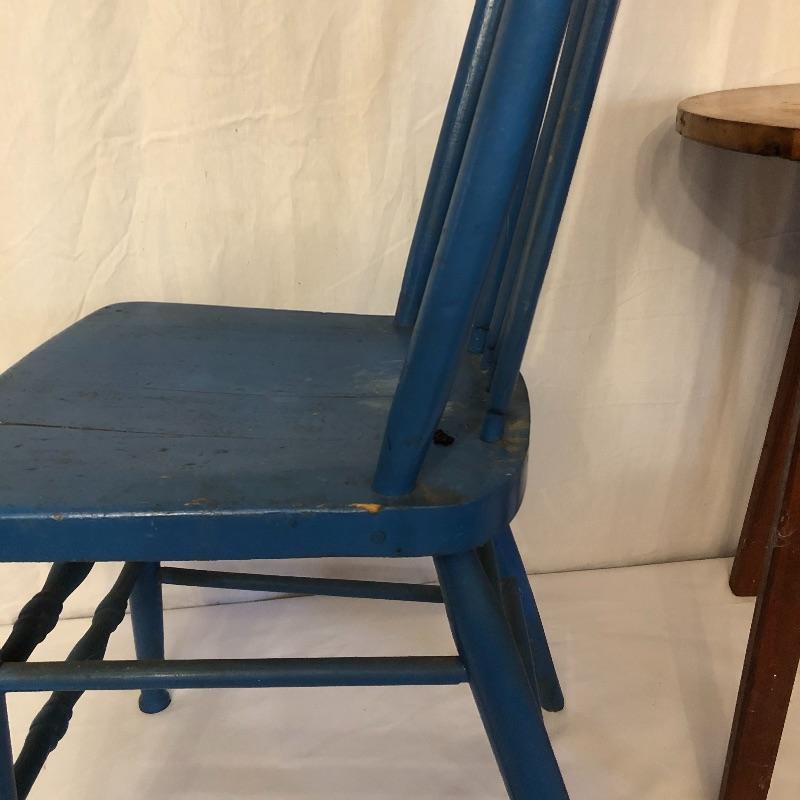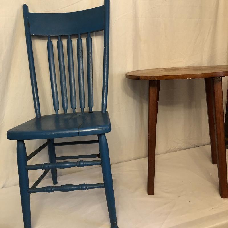 The blue chair measures approximately 39.5” tall with the seat being 18” high and 16” deep. The table top measures 24” in diameter and is 24.5” tall. The four legs on the table look to be reattached with hinges. Please note Pics of cracks and scratches. Local pick up only.