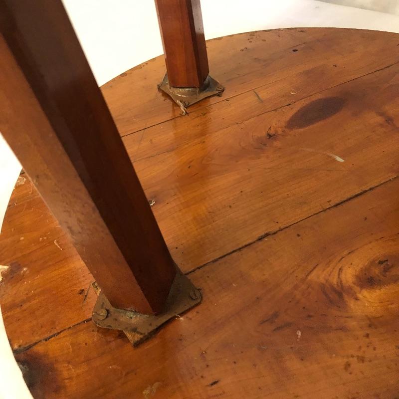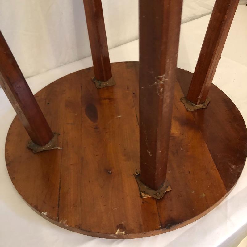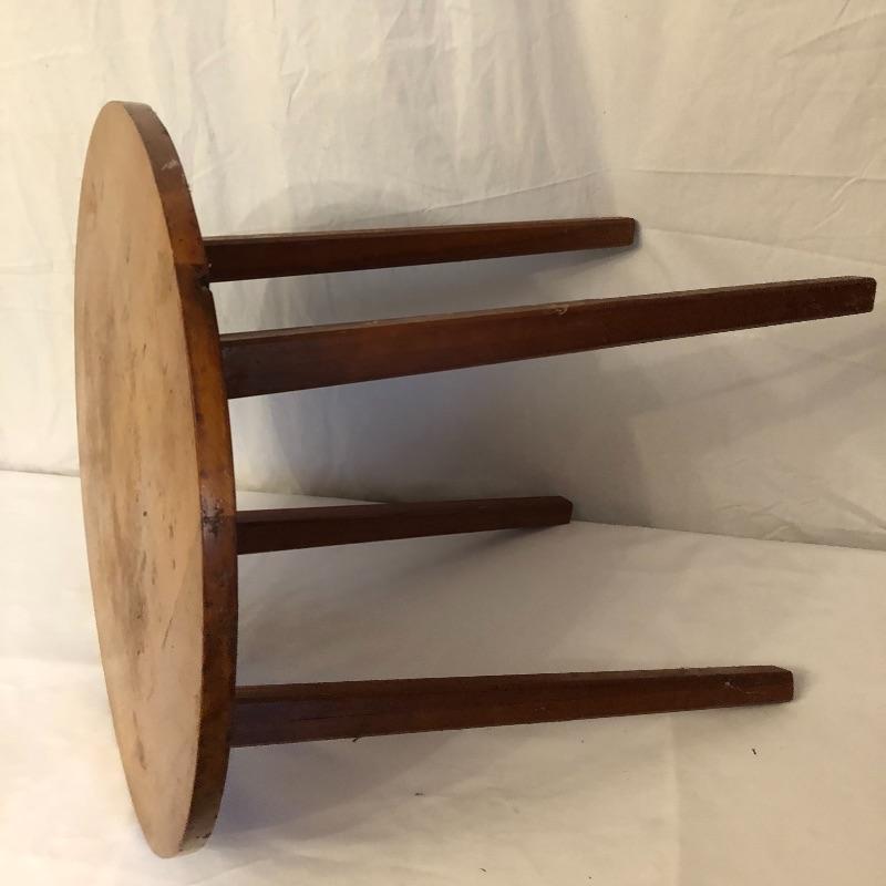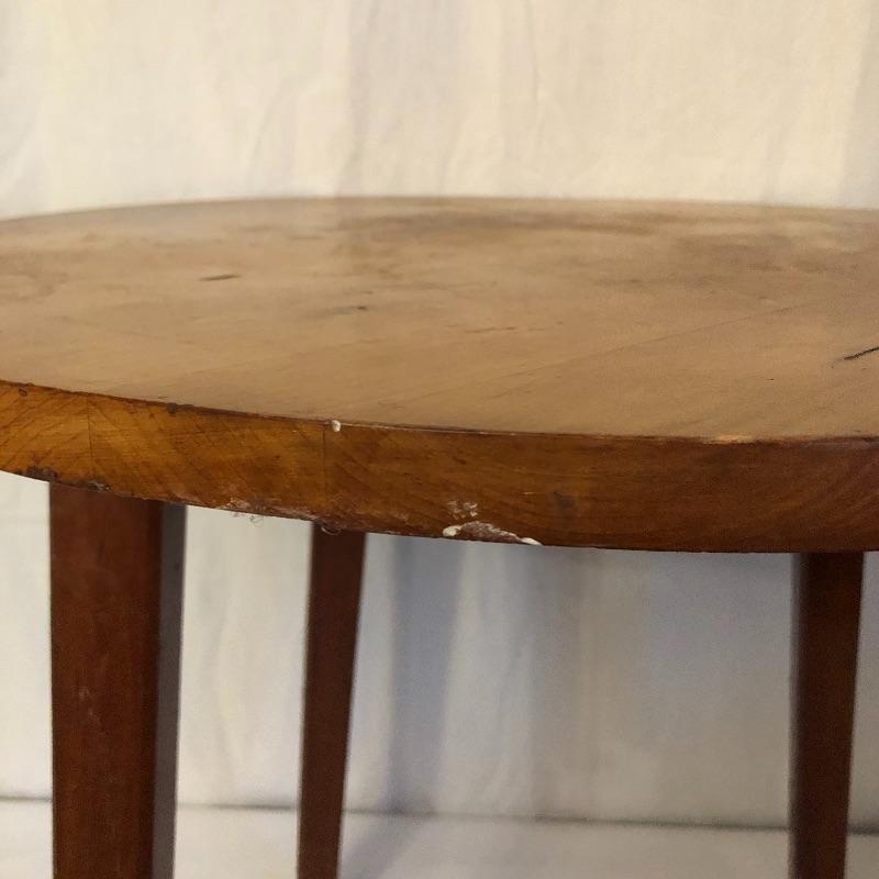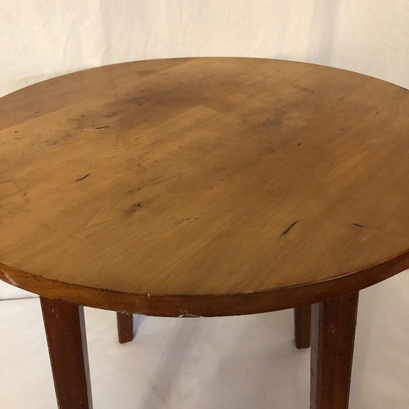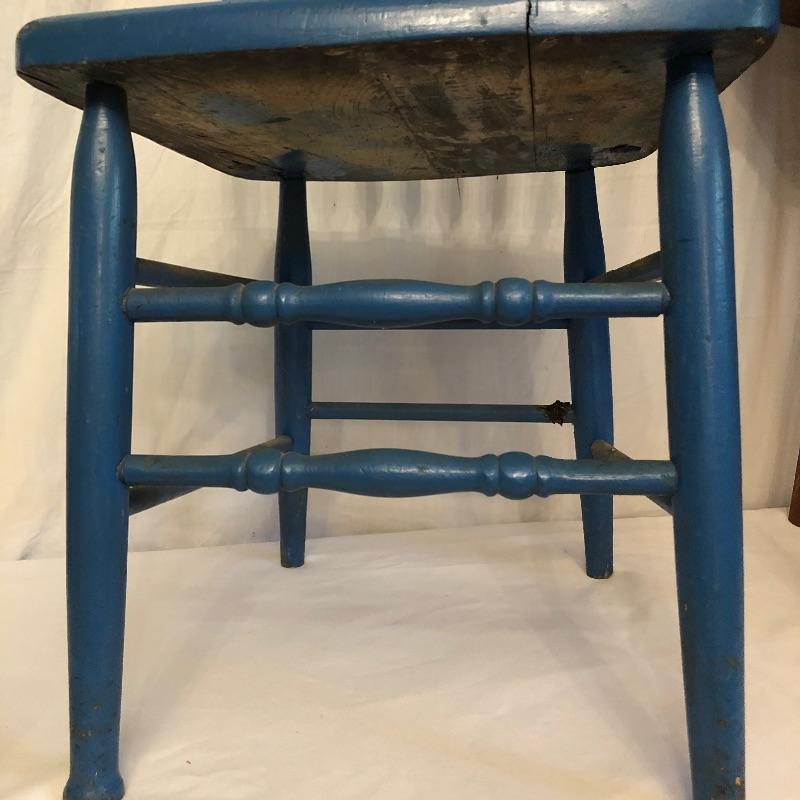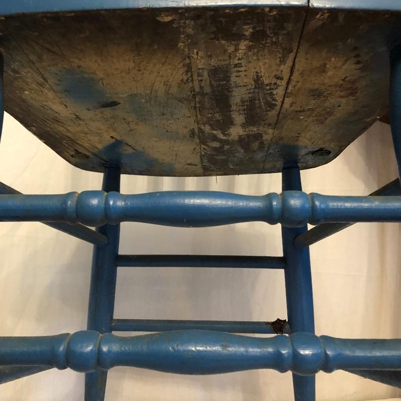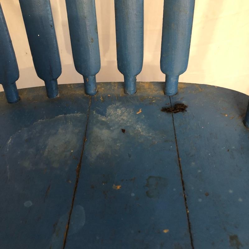 The blue chair measures approximately 39.5” tall with the seat being 18” high and 16” deep. The table top measures 24” in diameter and is 24.5” tall. The four legs on the table look to be reattached with hinges. Please note Pics of cracks and scratches. Local pick up only.