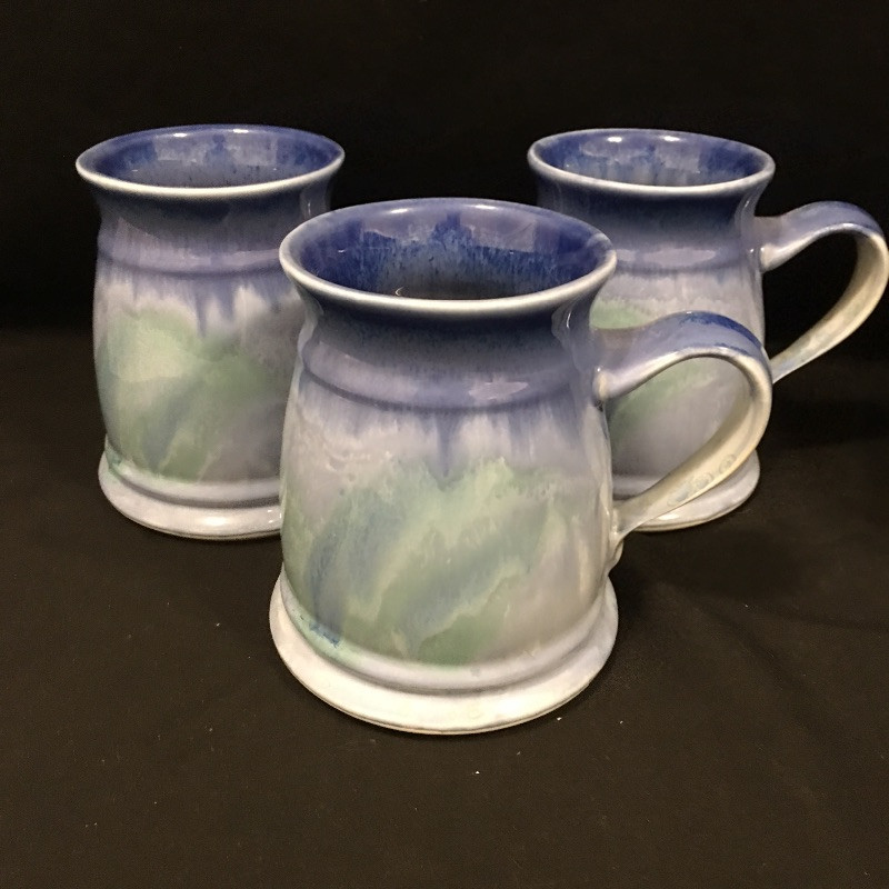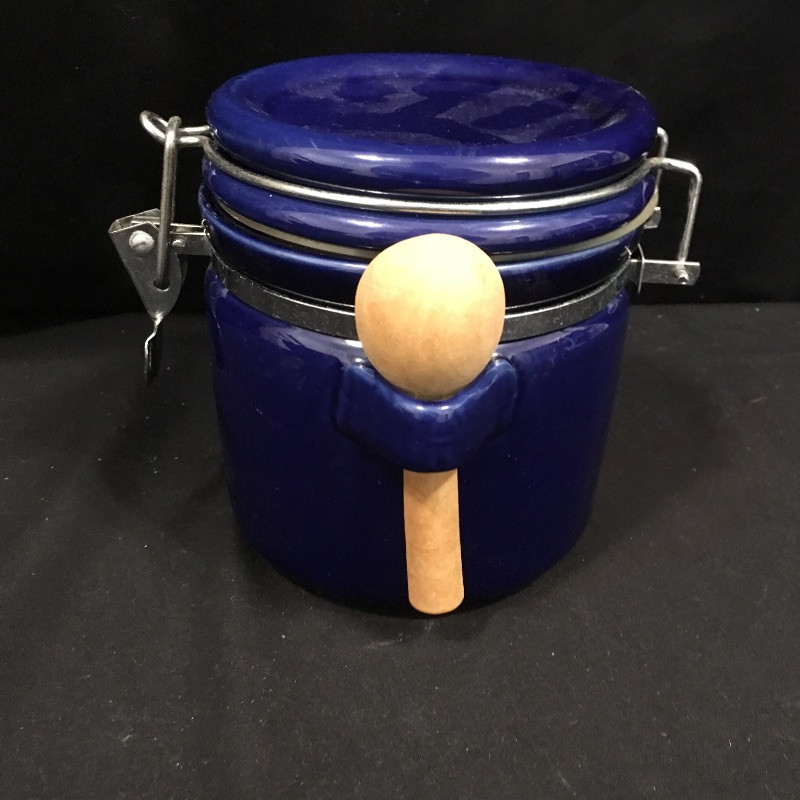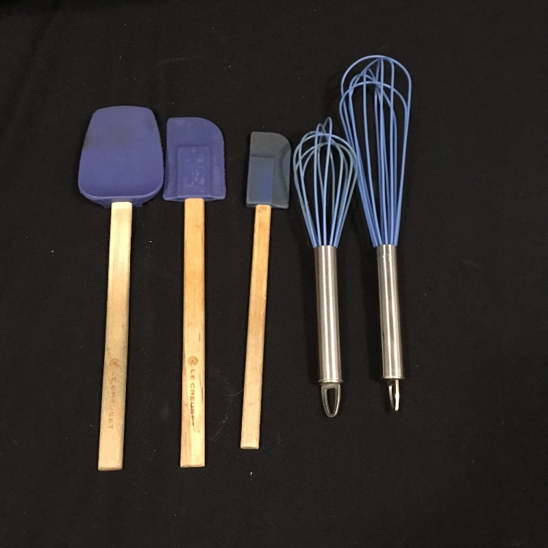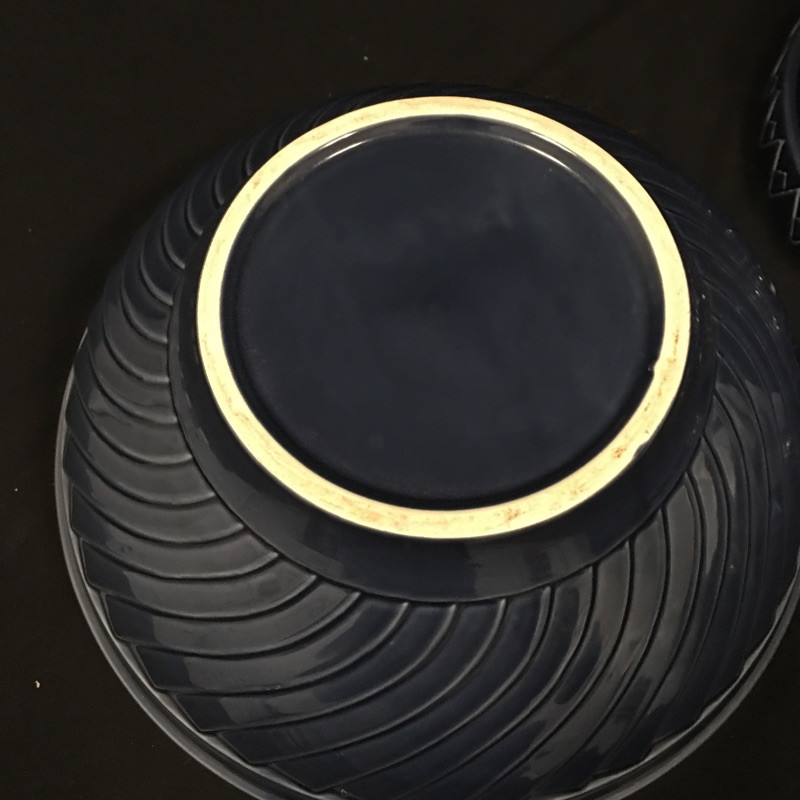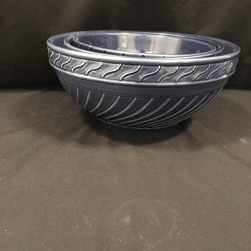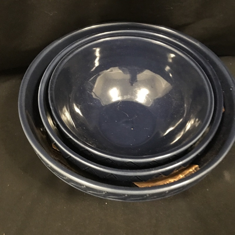 This bundle of blue lot includes three mugs, three nesting bowls, four plastic glasses, canister and kitchen utensils. Largest bowl measures 11”D x 5.25” tall. Local Pickup Only.