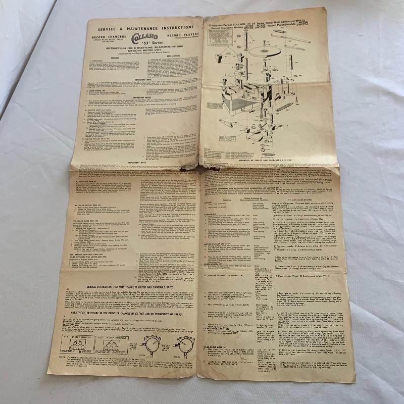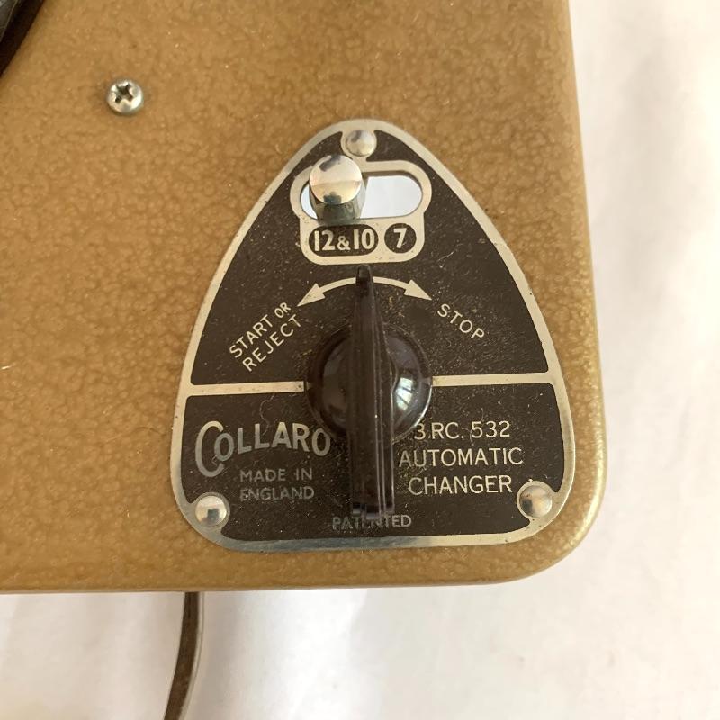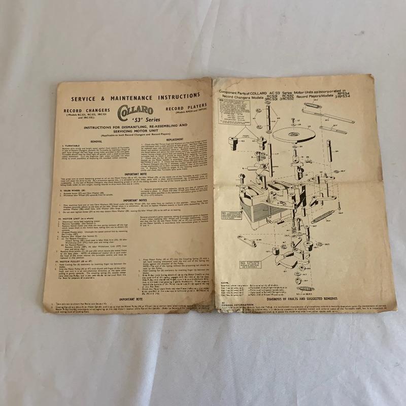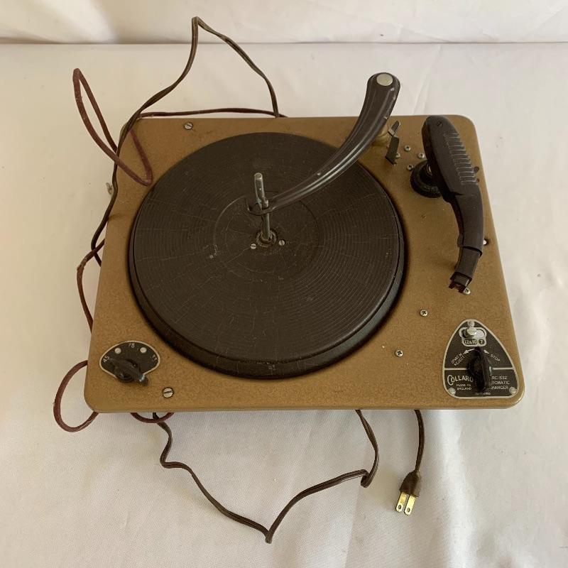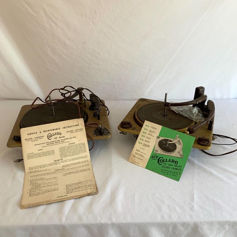 This lot includes two Collaro turntables. One is a four-speed Collaro High Fidelity RC 456. Does not appear to power on when plugged in. The other is a three-speed RC 532 Automatic Record Changer. It comes with Service and Maintenance Instructions. It powers on and spins when plugged in.
