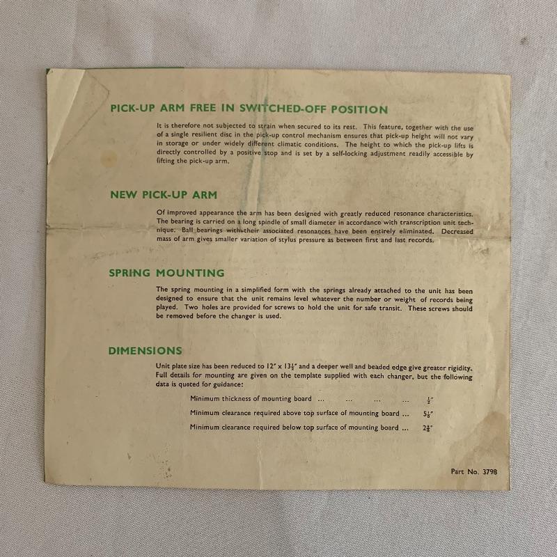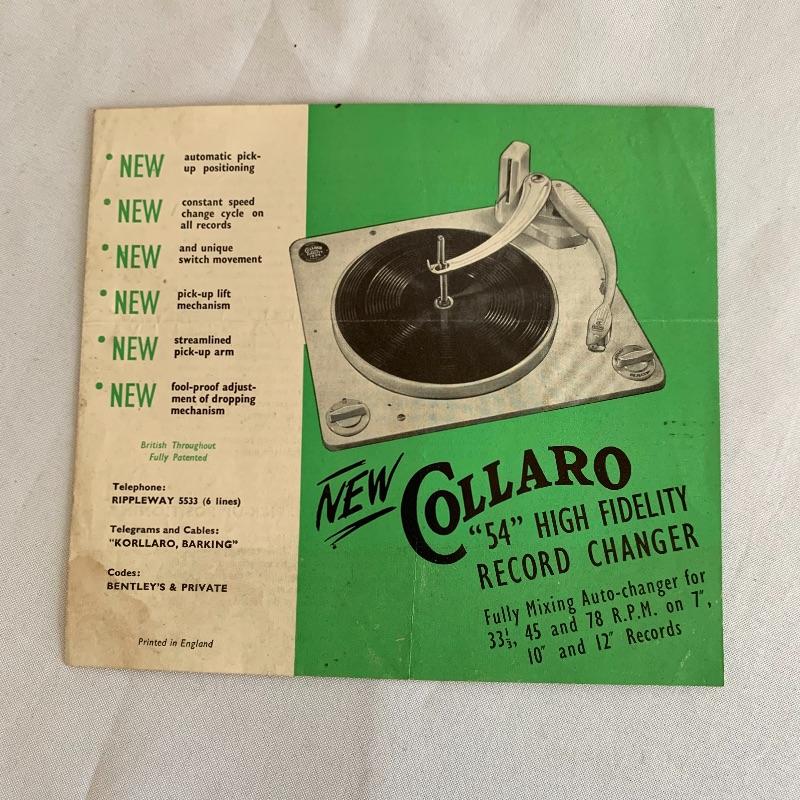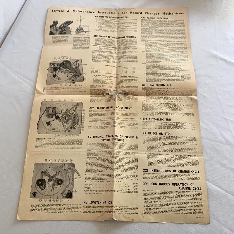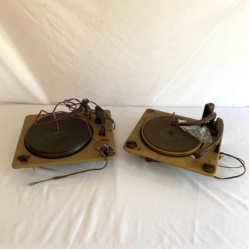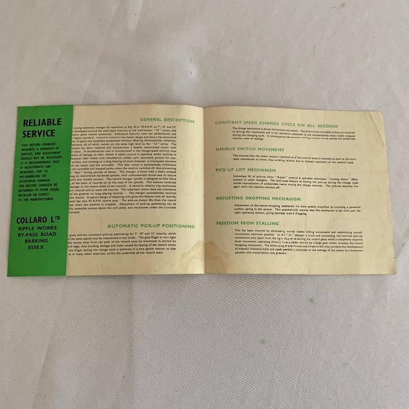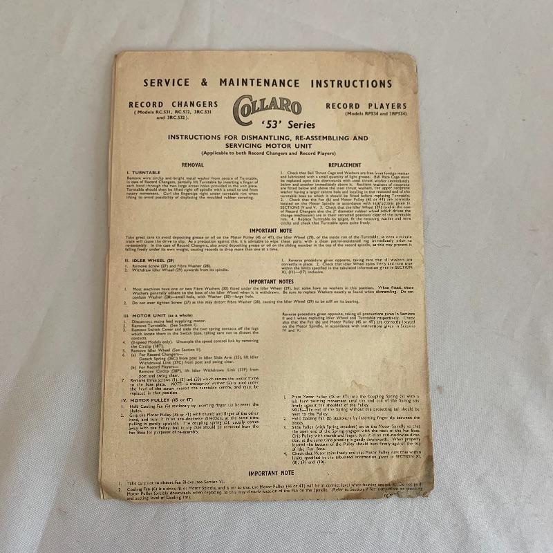 This lot includes two Collaro turntables. One is a four-speed Collaro High Fidelity RC 456. Does not appear to power on when plugged in. The other is a three-speed RC 532 Automatic Record Changer. It comes with Service and Maintenance Instructions. It powers on and spins when plugged in.