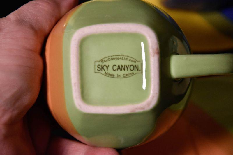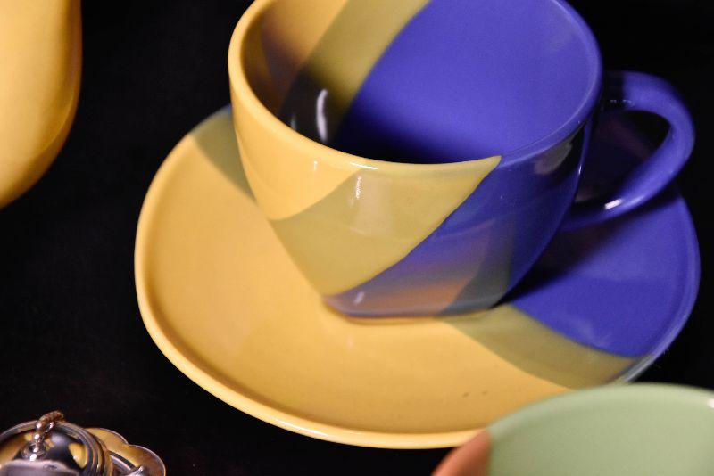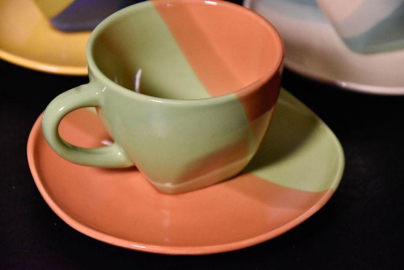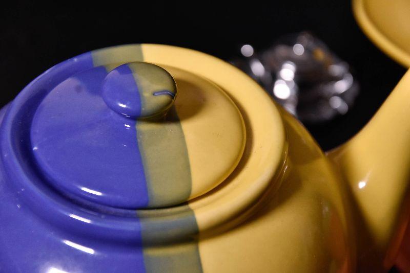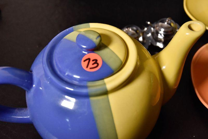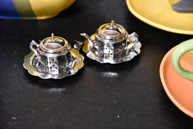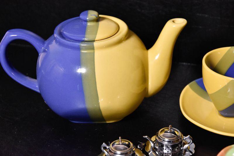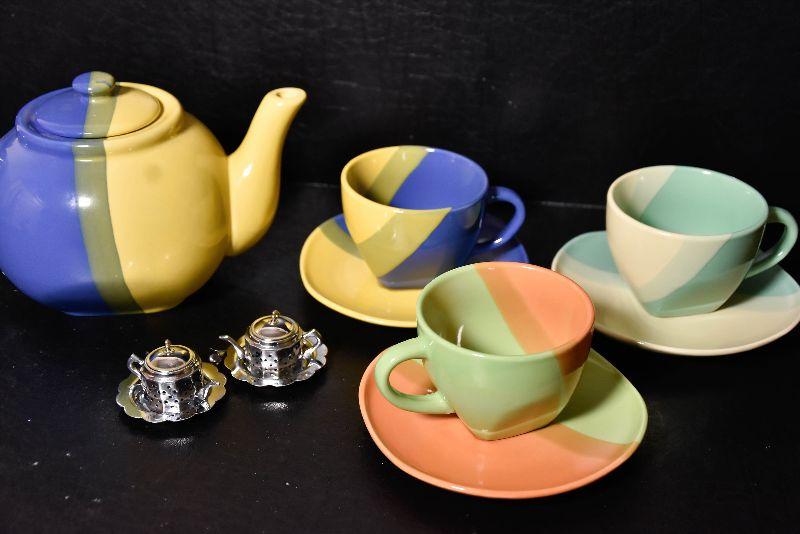 What a fun set with three each cup and saucer and Teapot. Also included are 2 tea strainers.