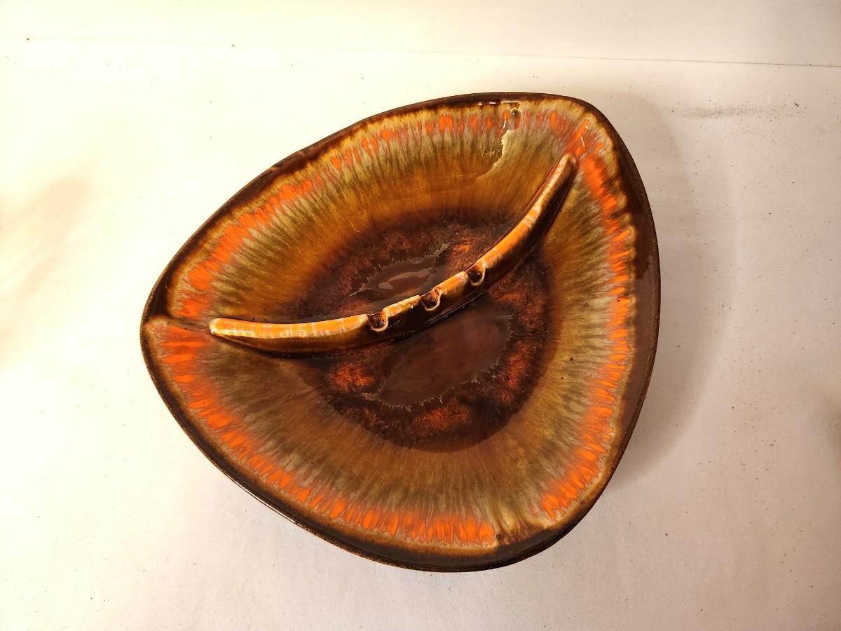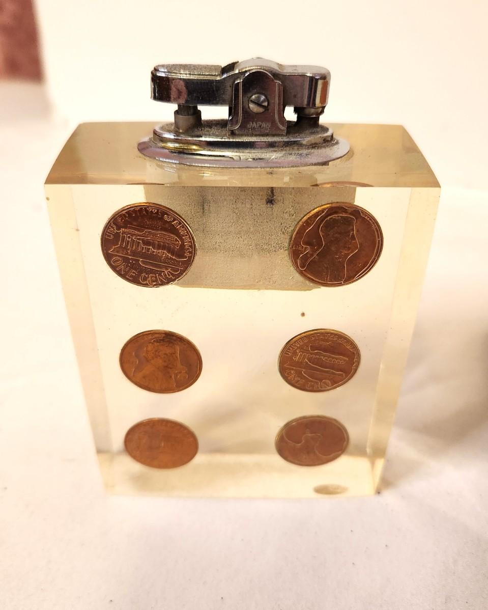 Great combo here - way cool lucite table lighter with floating pennies paired with a groovy pottery Mid Century ashtray. Lighter needs fluid. Ashtray marked "DeForest." Lighter is hard to find.