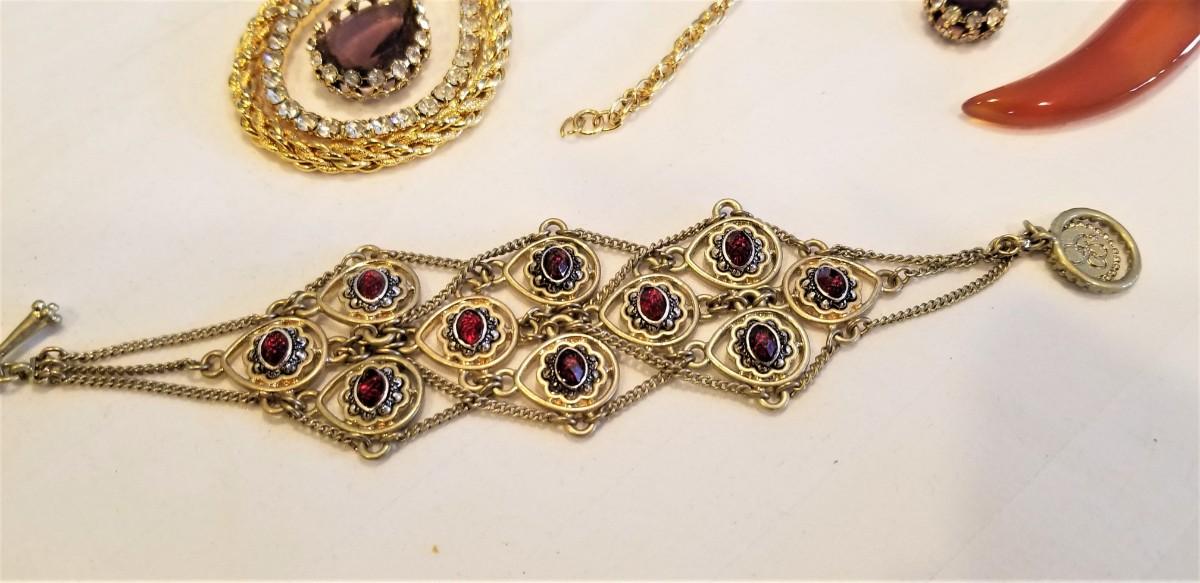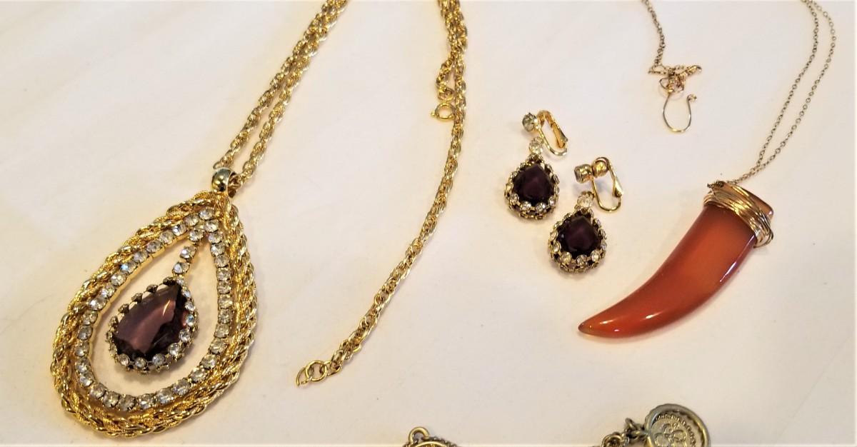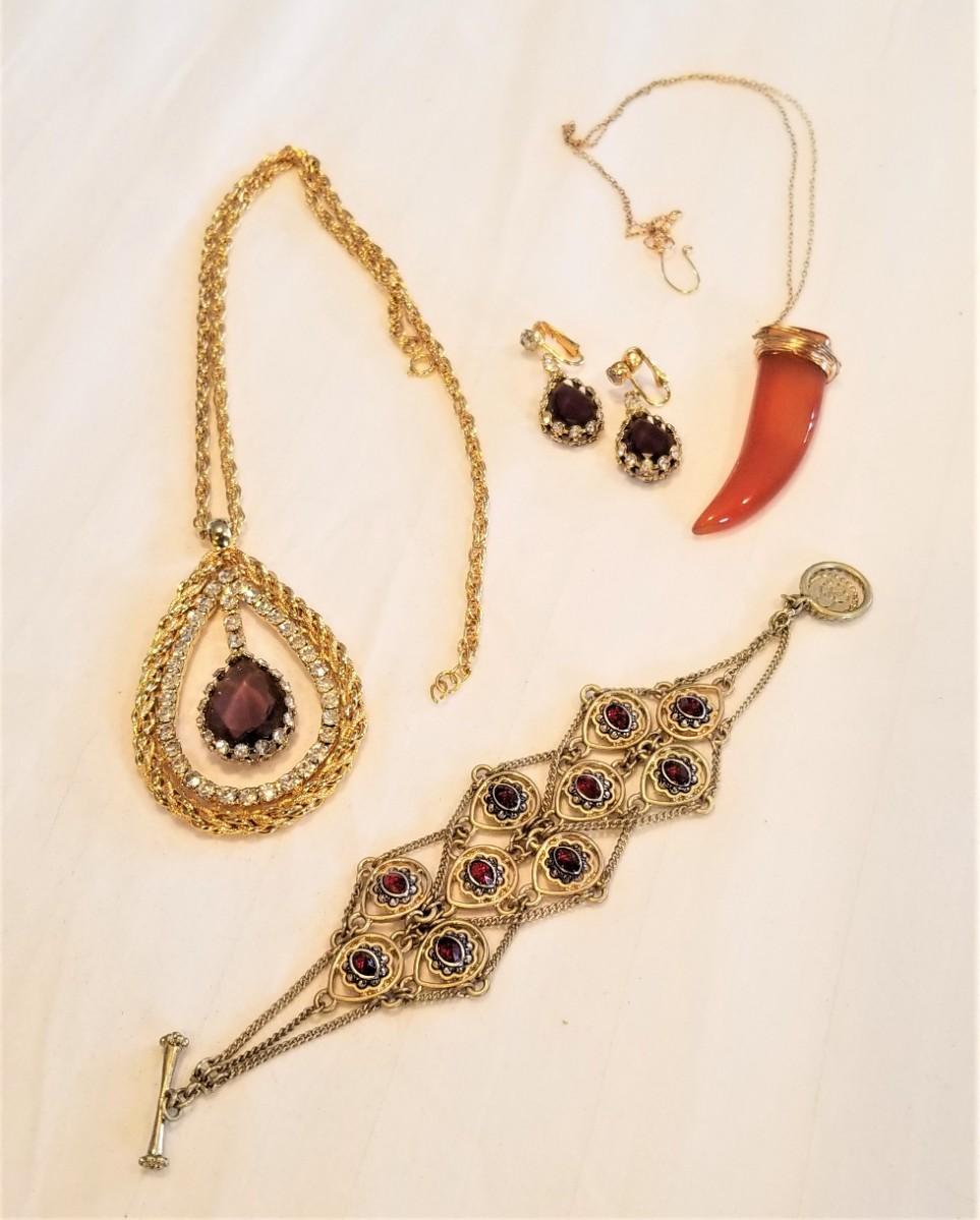 Quality costume jewelry lot - necklace with matching clip earrings (goldtone with rhinestones and "amethyst" stone - necklace is 24" long without pendant), bracelet set with simulated garnets (ethic look), and a wrapped stone necklace on a delicate gold-tone chain - all fun pieces in good condition.
