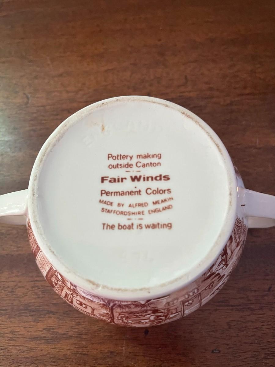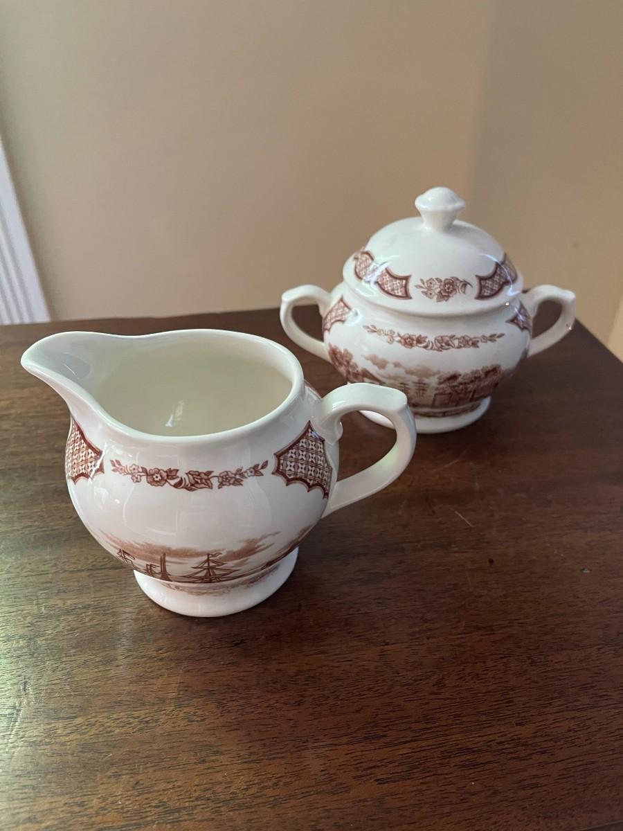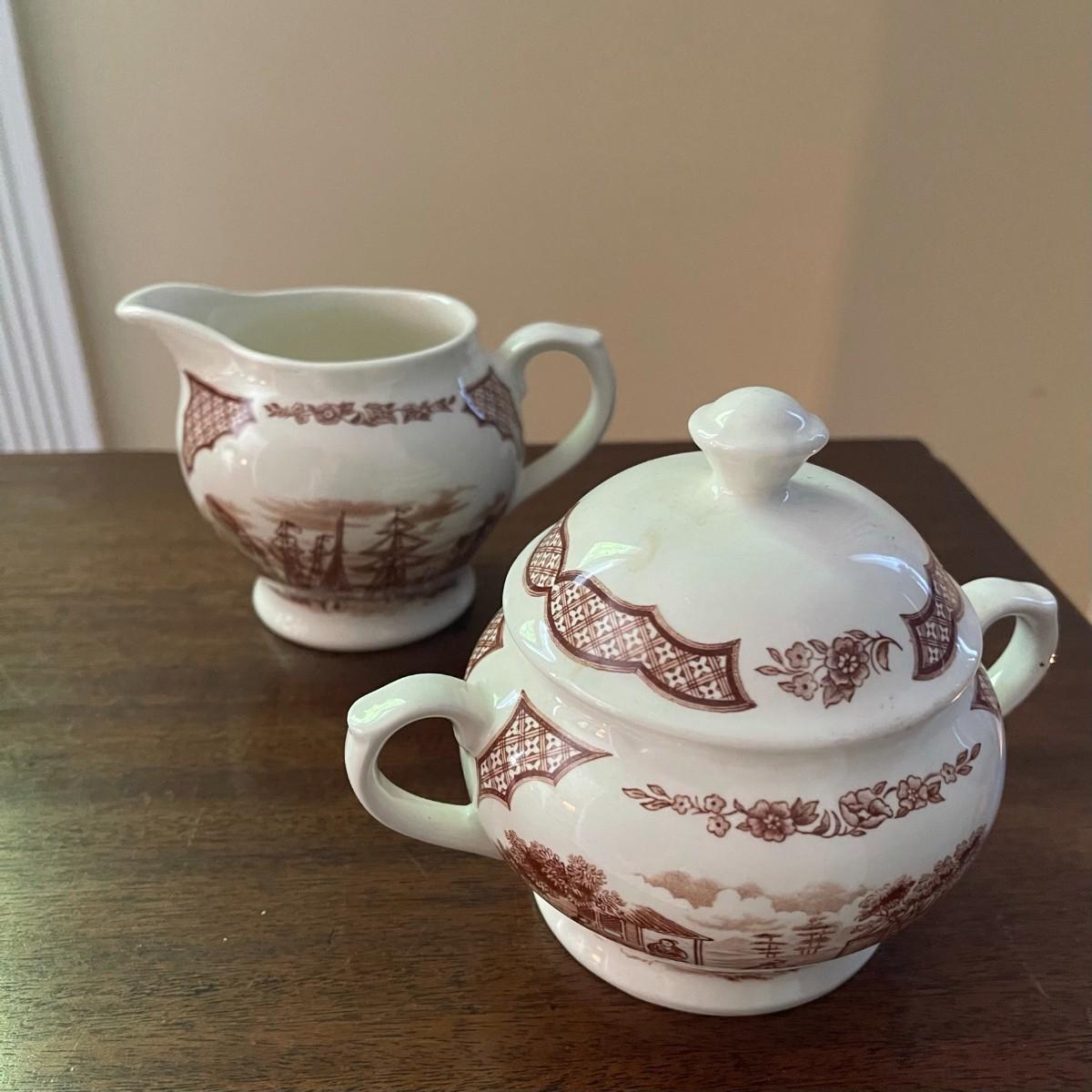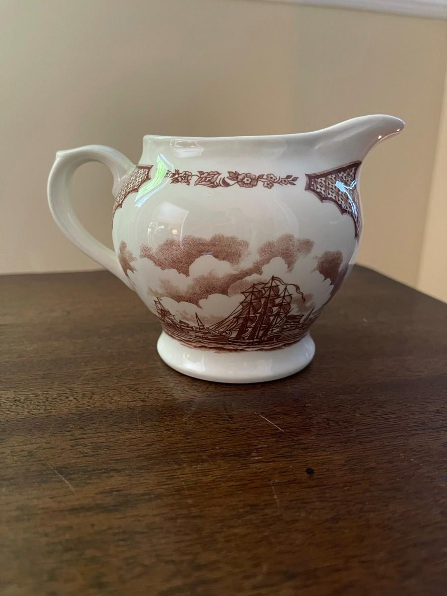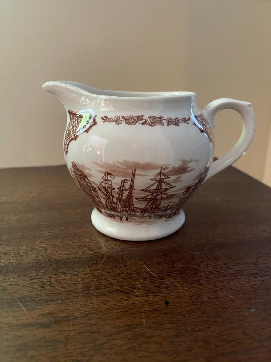 Alfred Meakin, Fair Winds, Brown, Staffordshire, England. Creamer & Sugar Set. Visuals include The Boat is Waiting, Pottery Making outside Canton, USS Delaware at New York and Wall Street Dock.