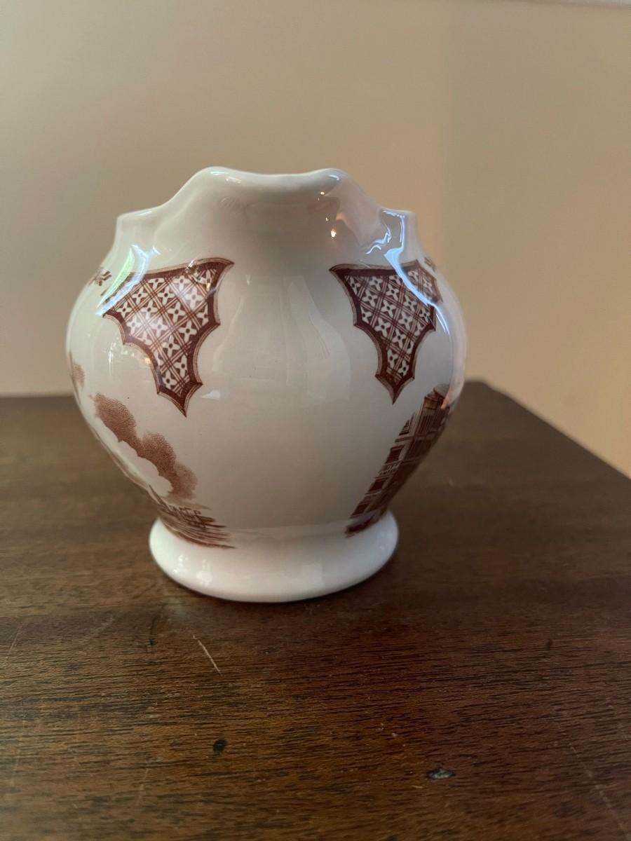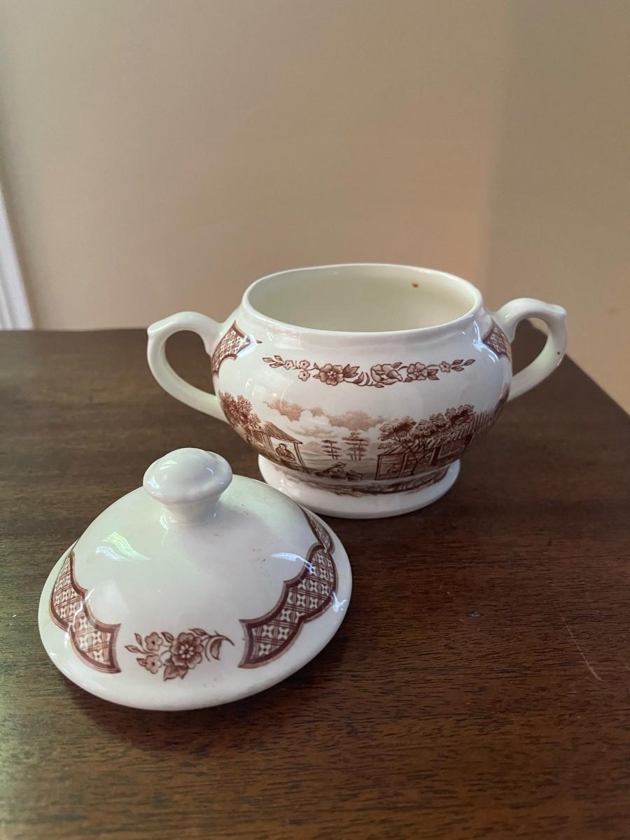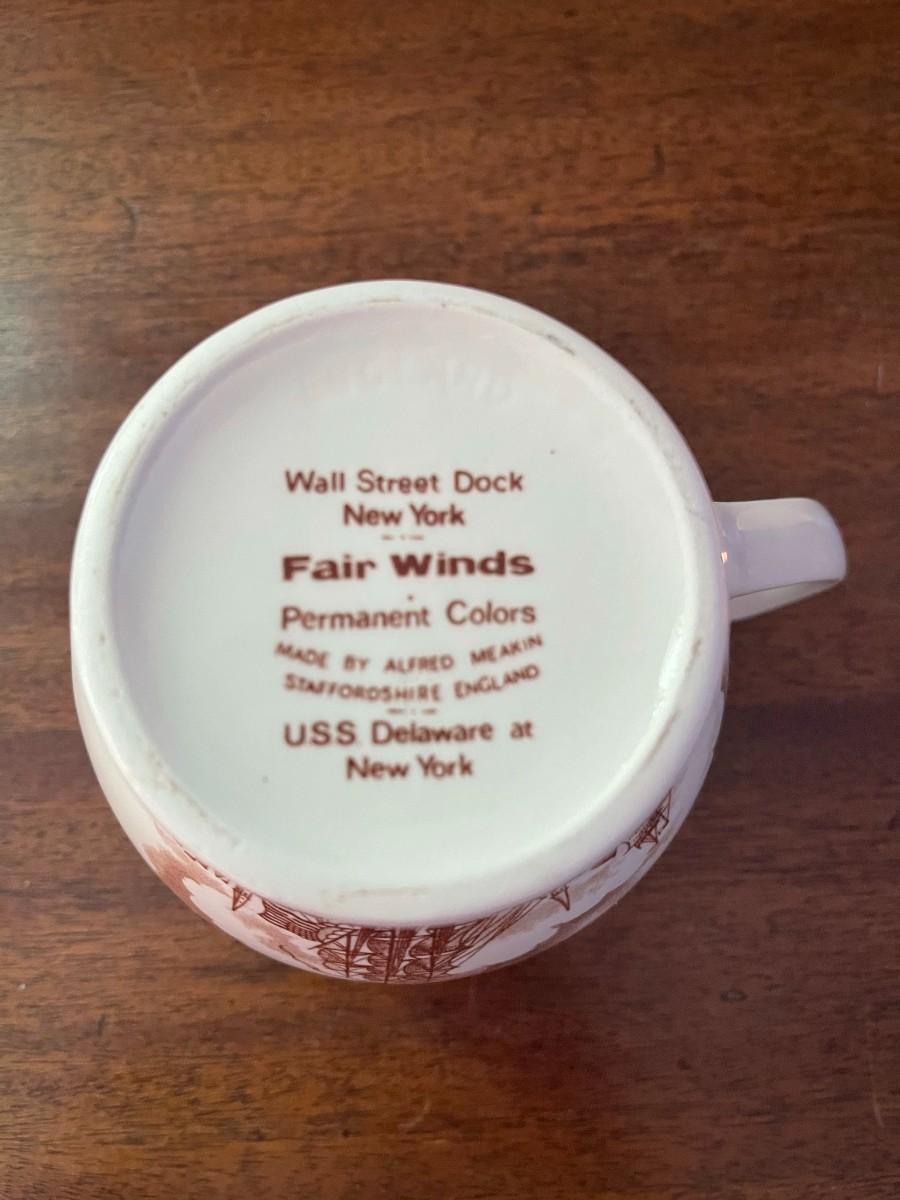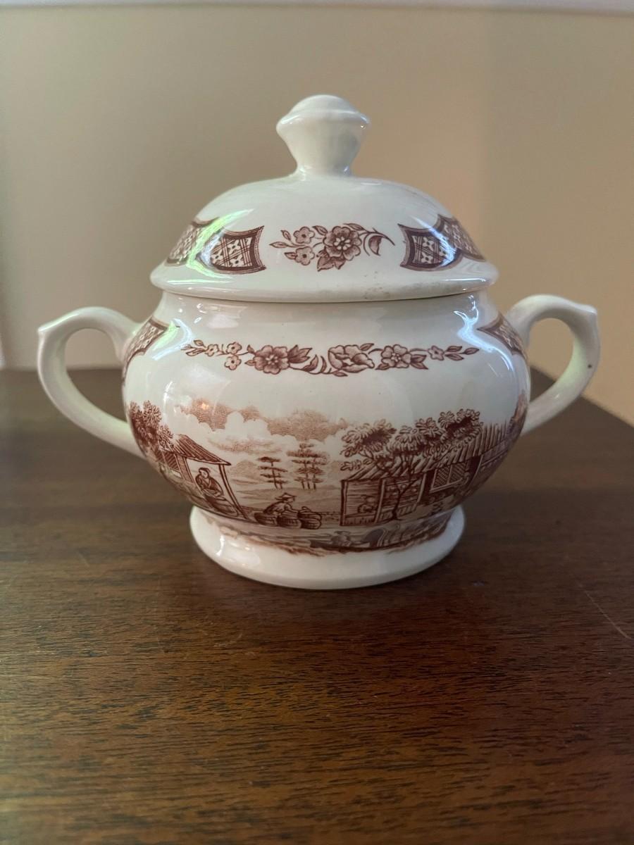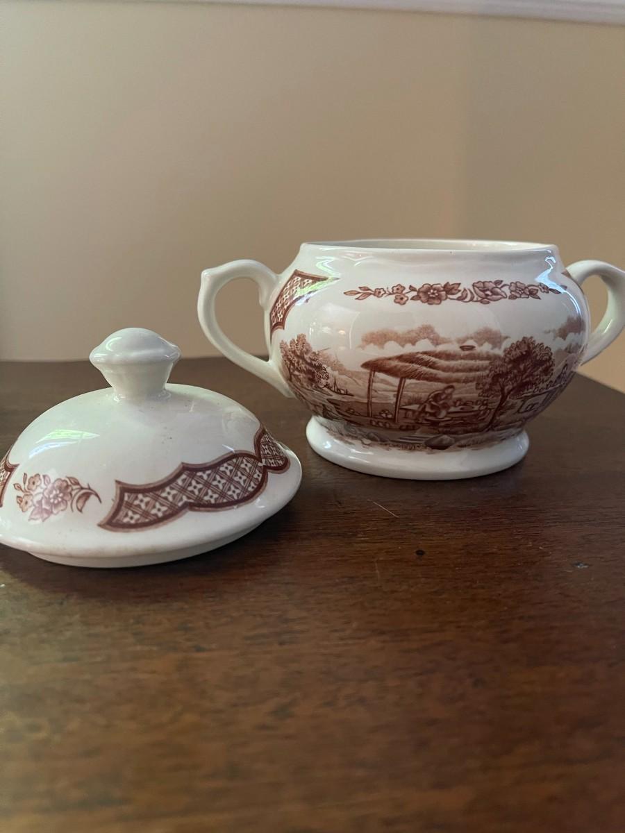 Alfred Meakin, Fair Winds, Brown, Staffordshire, England. Creamer & Sugar Set. Visuals include The Boat is Waiting, Pottery Making outside Canton, USS Delaware at New York and Wall Street Dock.