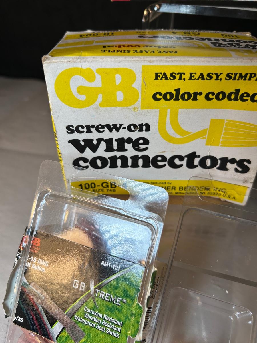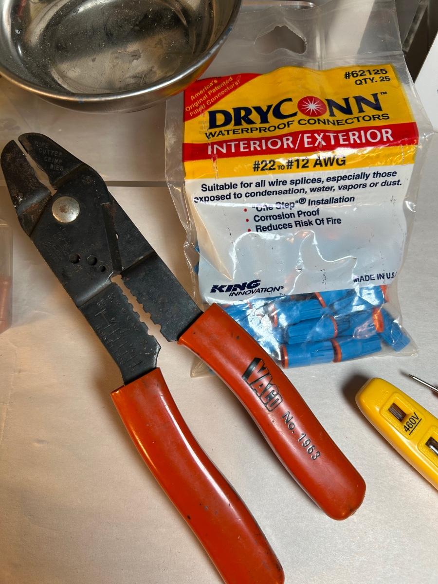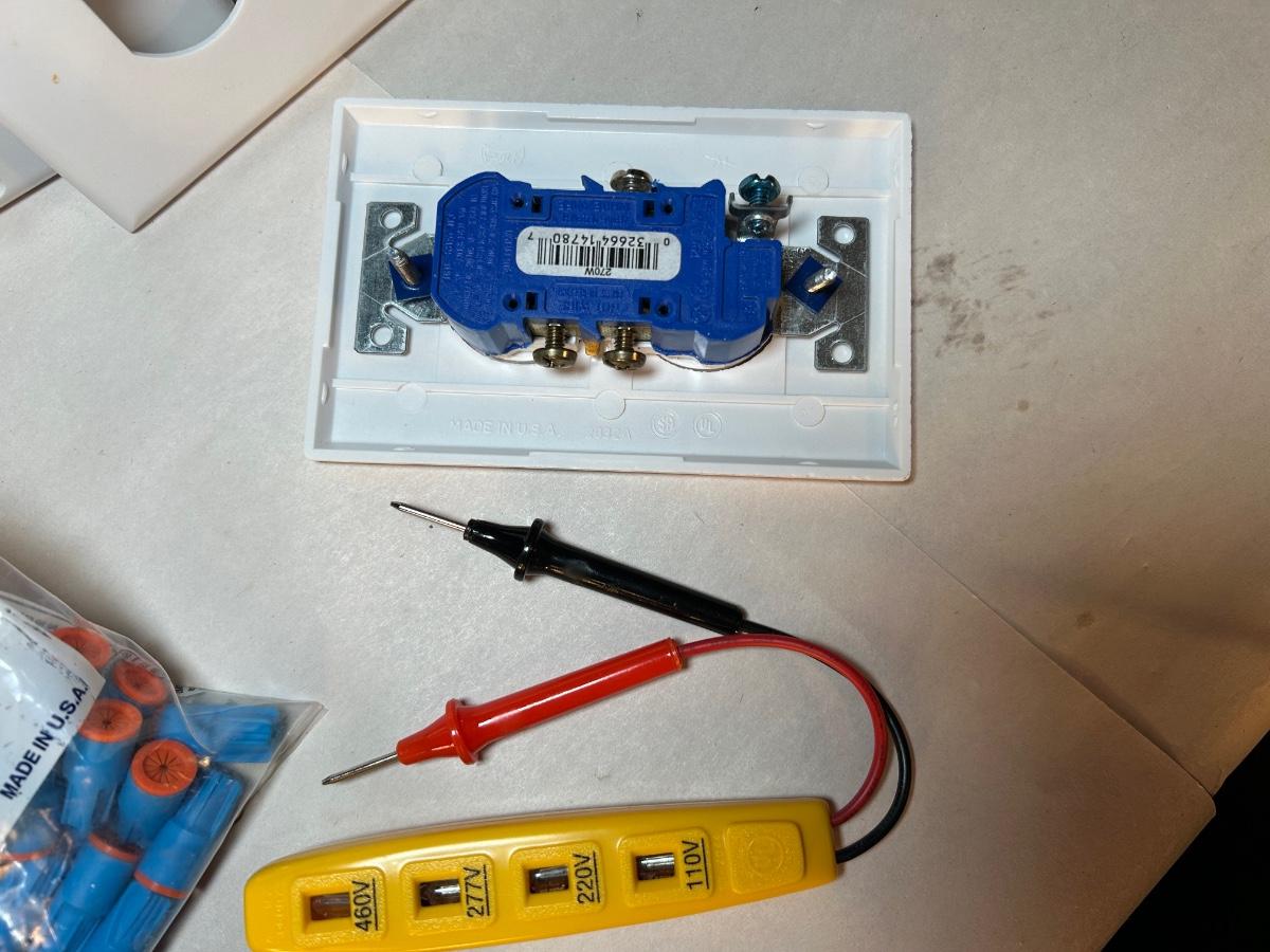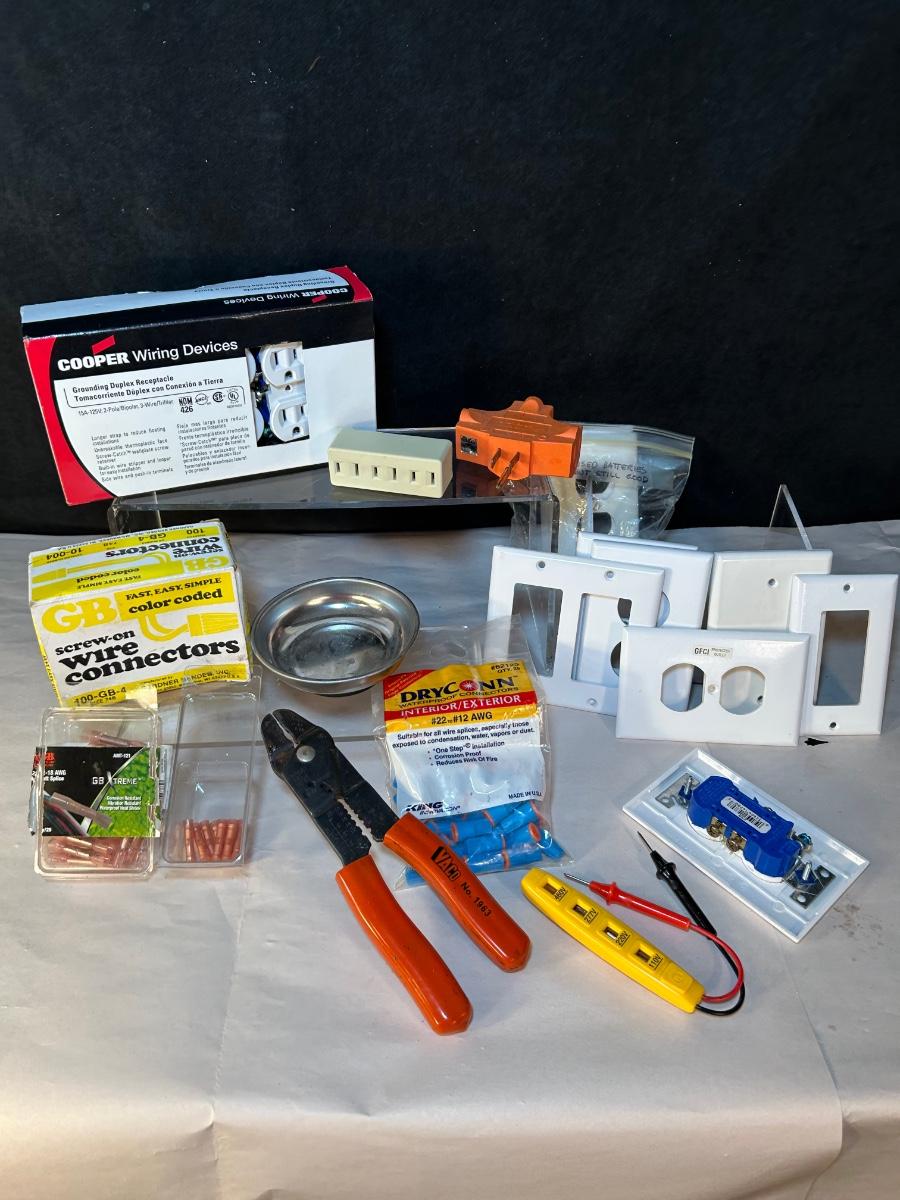 Wire stripper, voltage tester, switchplate covers, pack of duplex outlets, magnetic dish, asset's connectors