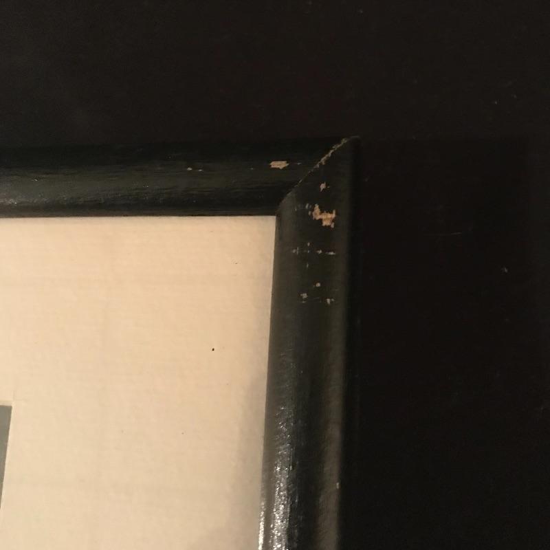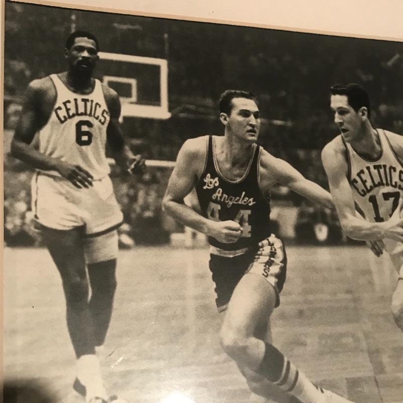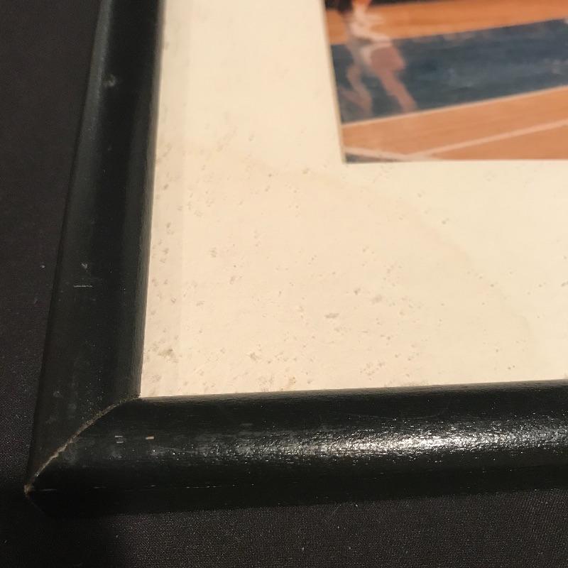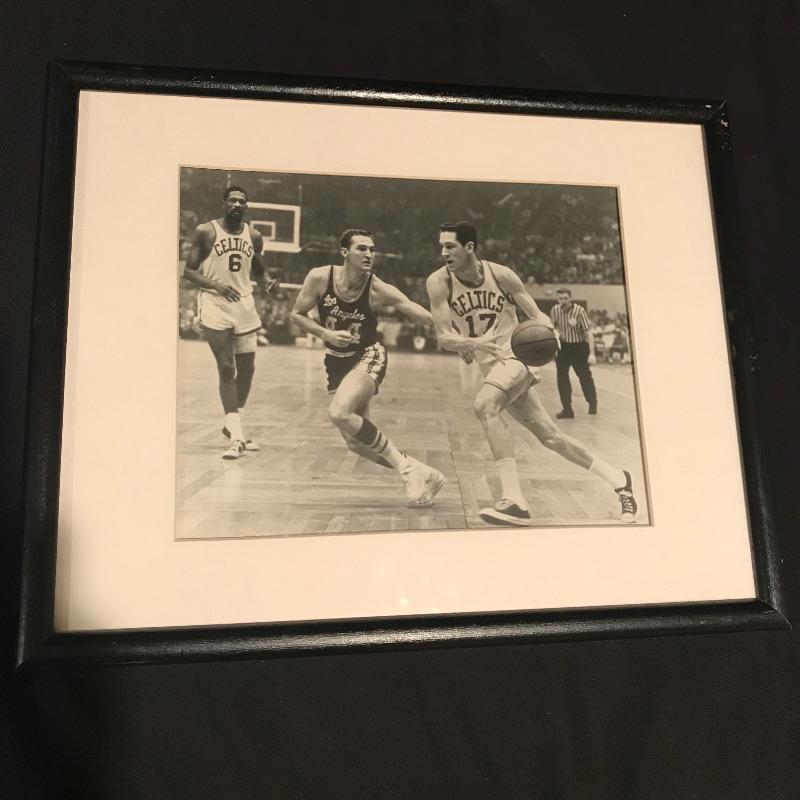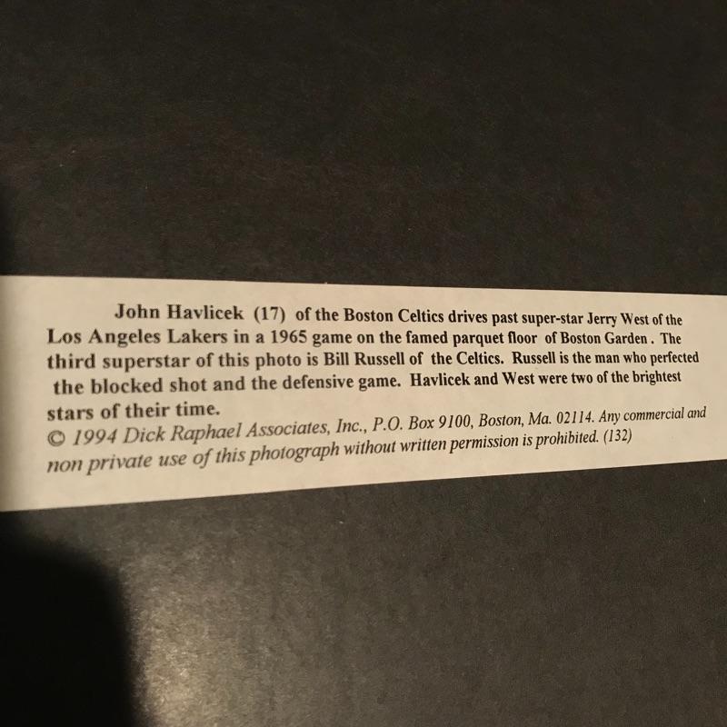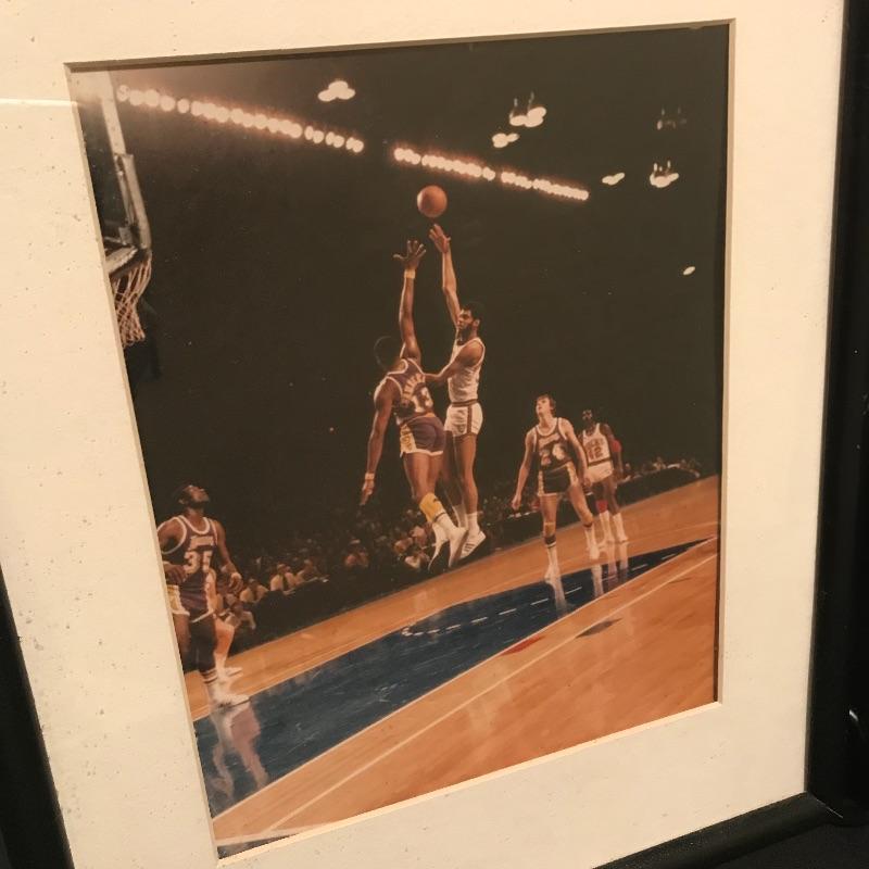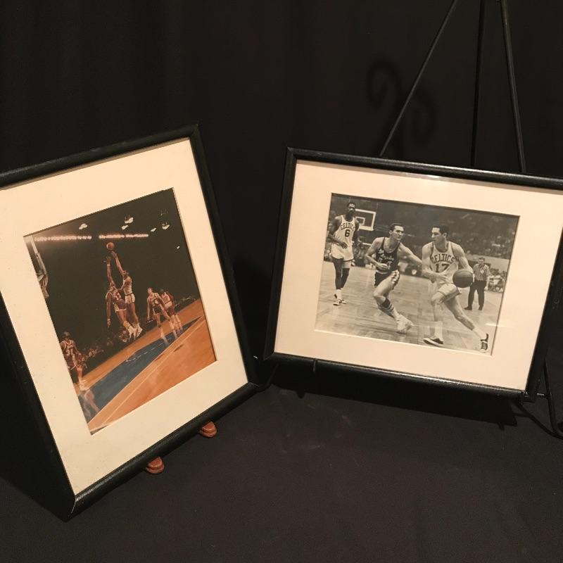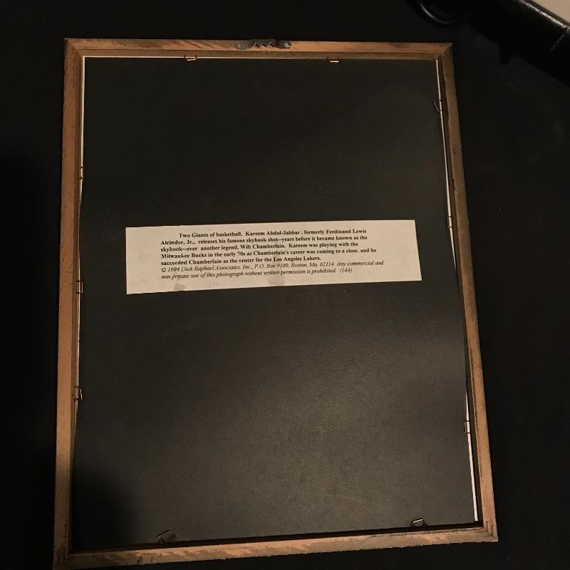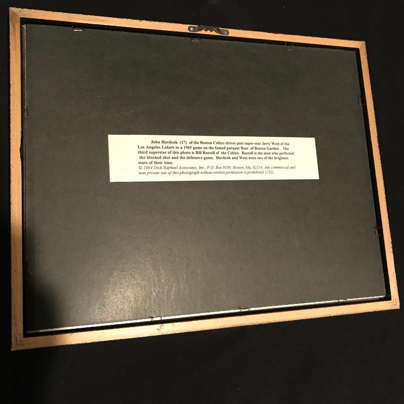 Amazing shot of Kareem Abdul-Jabbar releasing his not yet famous “Skyhook shot” over legend Wilt Chamberlain. Photo is matted and placed in a black wooden frame measuring approximately 12” x 15”. Description is matted on backside with copyright information. Another amazing photo in a matching black wooden frame- superstars John Havlicek, Jerry West, and Bill Russell in action. Frames are identical in color and size with some tiny blemishes are noted in photos. Shipping available. Please call UPS at 828-252-6930 for shipping quote prior to bidding.