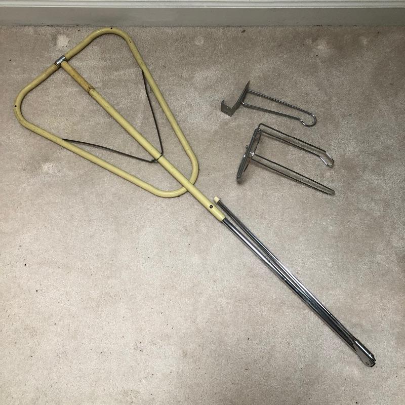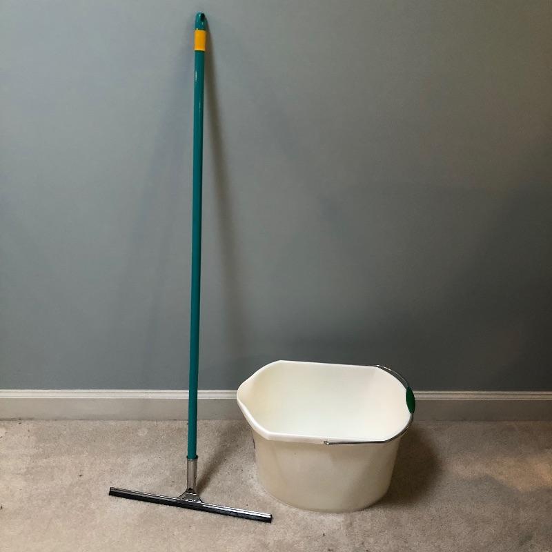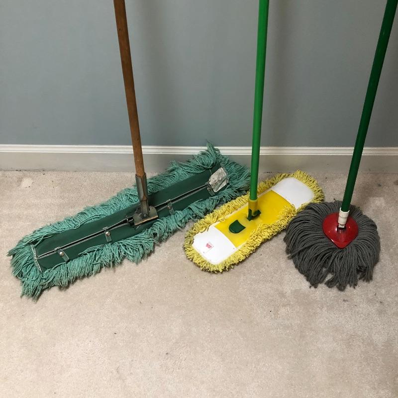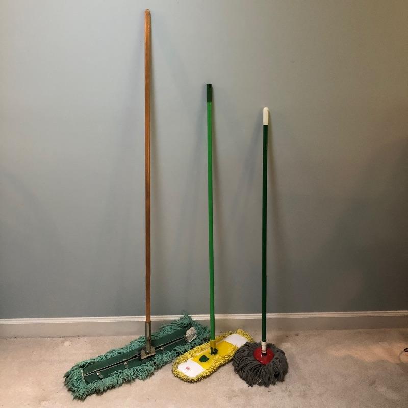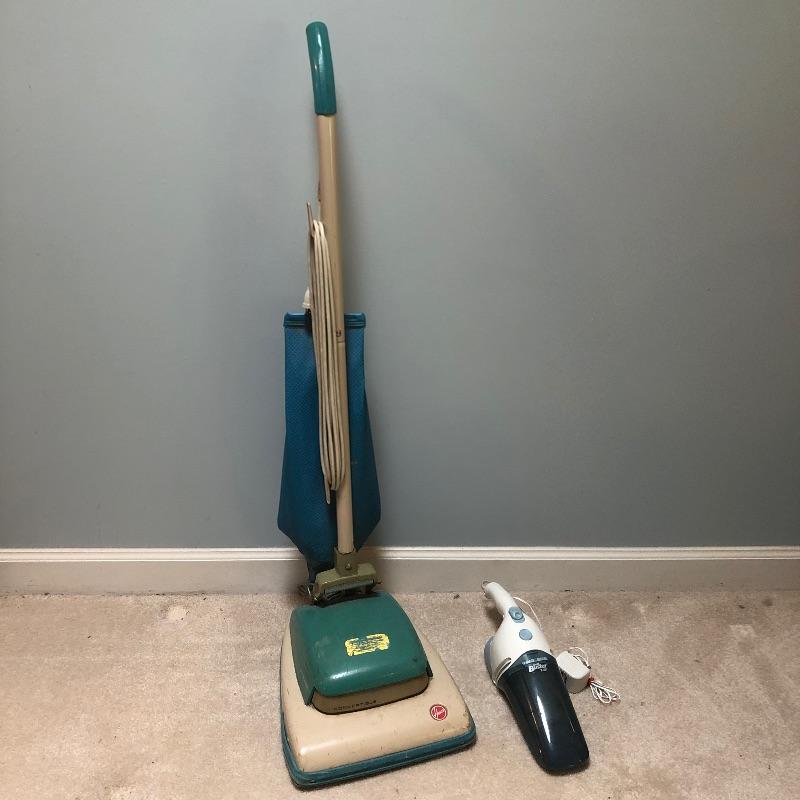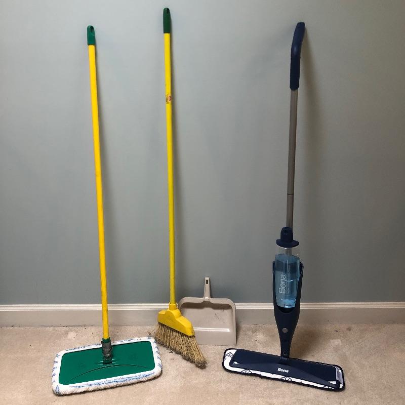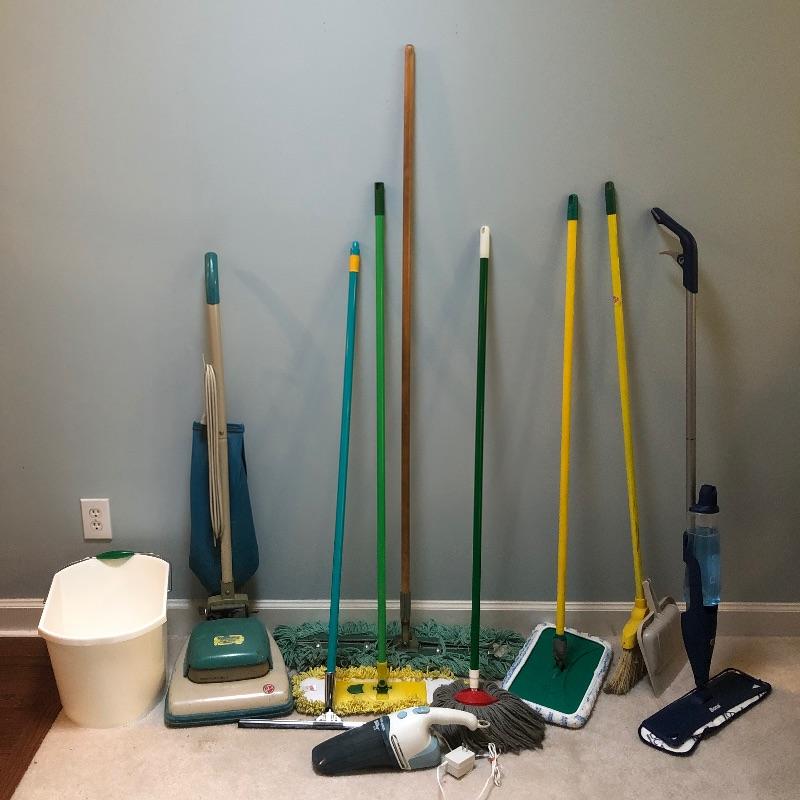 Everything you need to make your house shiny and sparkling! We'll start you off with a large mop bucket, an older model Hoover vacuum that works! They don't make them like they used to! Next is a floor squidgy, two floor dust mops that are removable and washable pads, a yarn mop, another sweeper with another removable/washable cloth, a broom and dust pan, a Bona floor cleaner with removable/washable cloth pads, and a Black and Decker Dust Buster with a power cord for charging and is charged up and working. Finally, to smooth everything out, a Shark iron, that is in excellent condition and works and an older model ironing board.