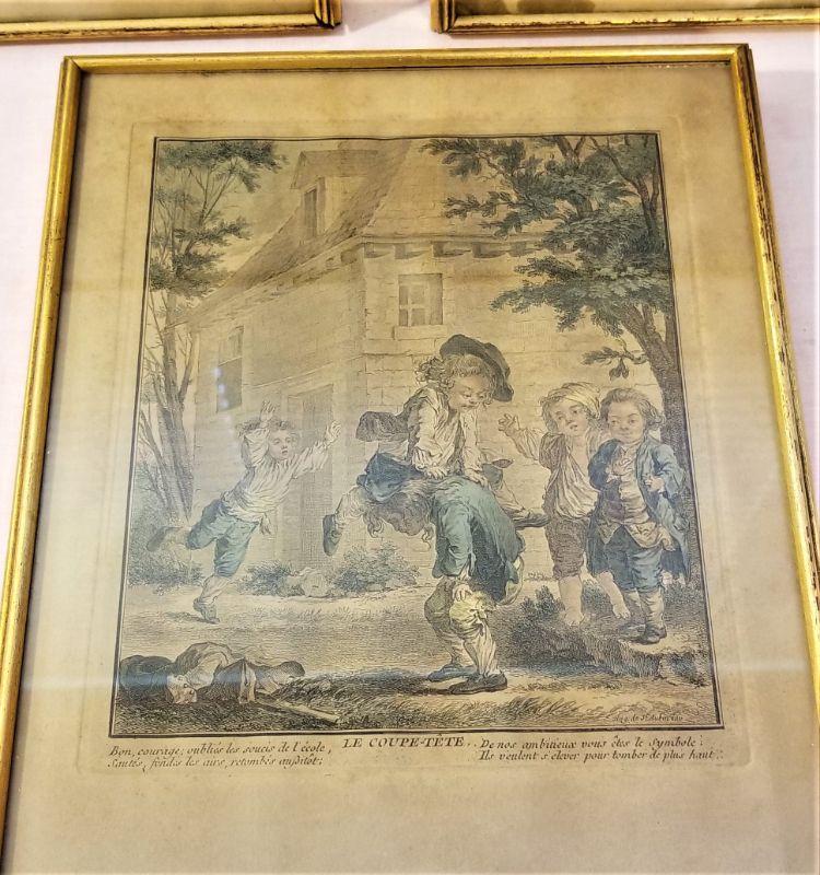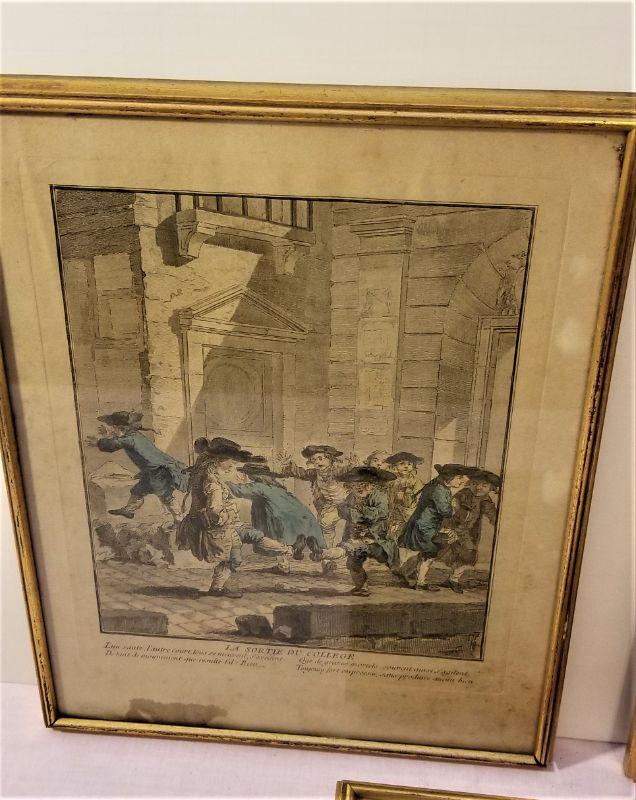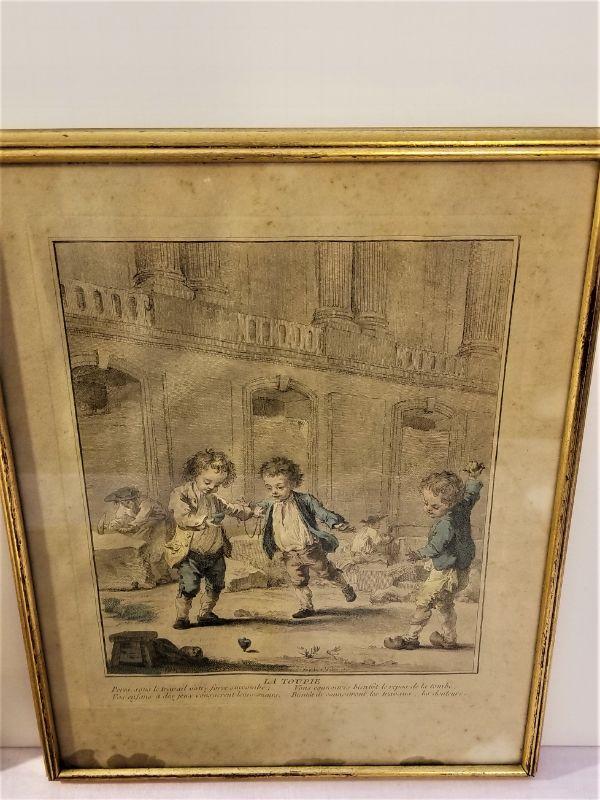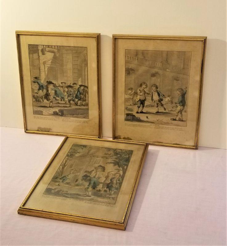 These three engravings are quite interesting - all executed by noted French engraver Auguste de S'Aubin, born 1736 in Paris, died 1807. He was active as an engraver from 1752 until 1800. These are not prints - they are original hand colored engravings, in French, that I believe are an allegory for the French Revolution, so this would date them to the early 1790's. Each engraving shows a different scene of French children playing around - one in a churchyard, another amidst tomb builders/monument makers, and another outside a church. The first is called "La Toupie" or THE TOP and shows boys playing with a top in a churchyard - the next "Le Coupe-Tete" or I cut off his head obliquely refers to the guillotine. The last "La Sortie du college" or Leaving the college refers the toe French aristocrats fleeing the country. August du S'Aubin was the official engraver for the Royal Library and came from a long line of distinguished French designers and engravers. Framed, these measure 9" x 11.5" each. Antique condition.