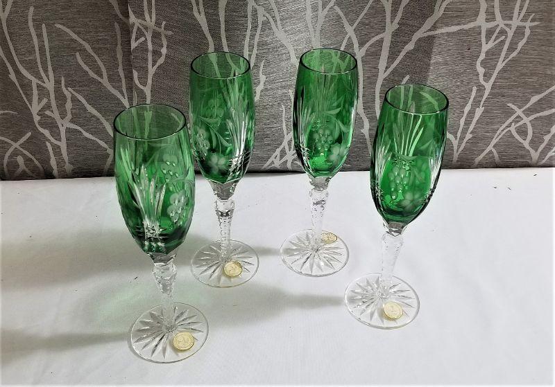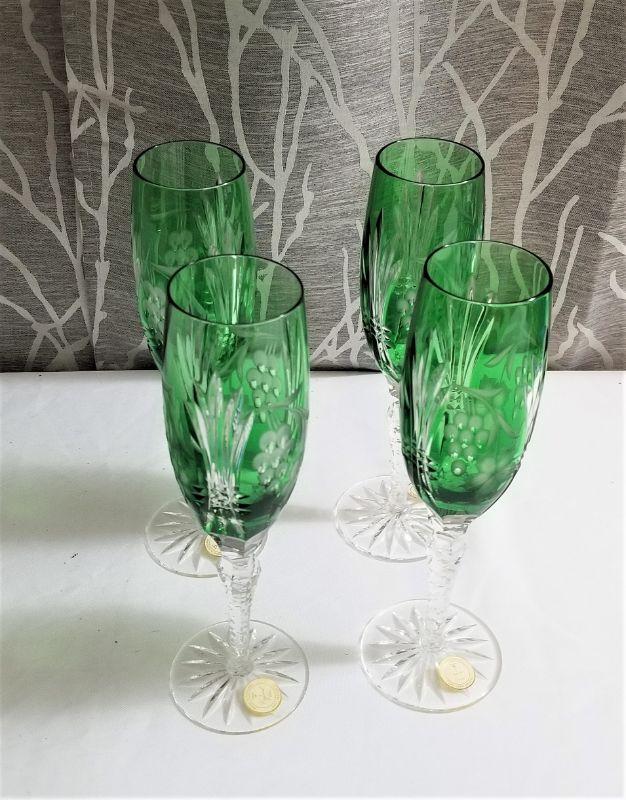 Lovely green cut to clear champagne/wine flutes - made in Hungary - each stands 9" tall.
