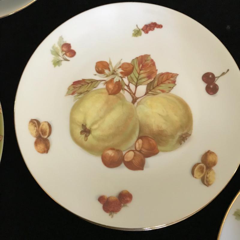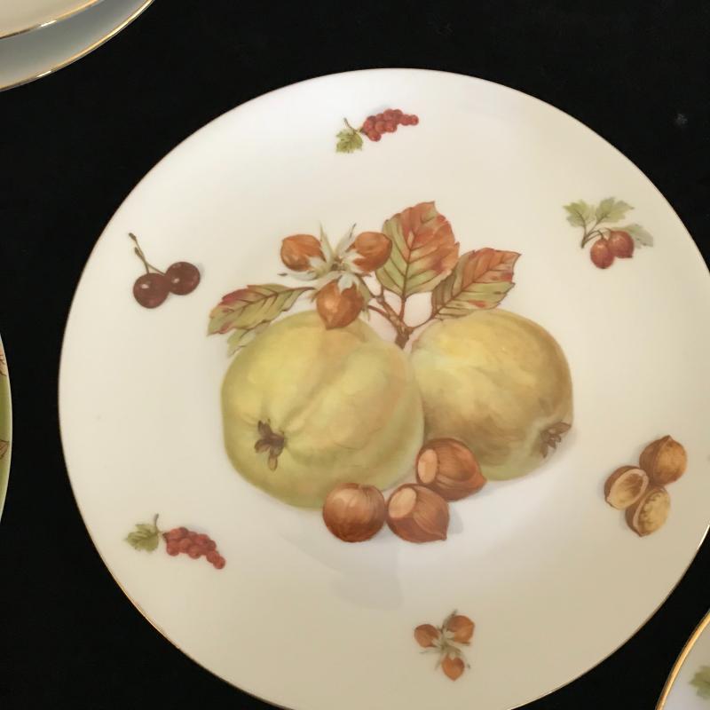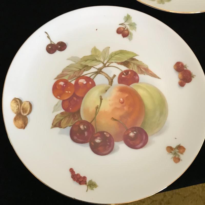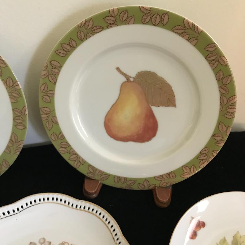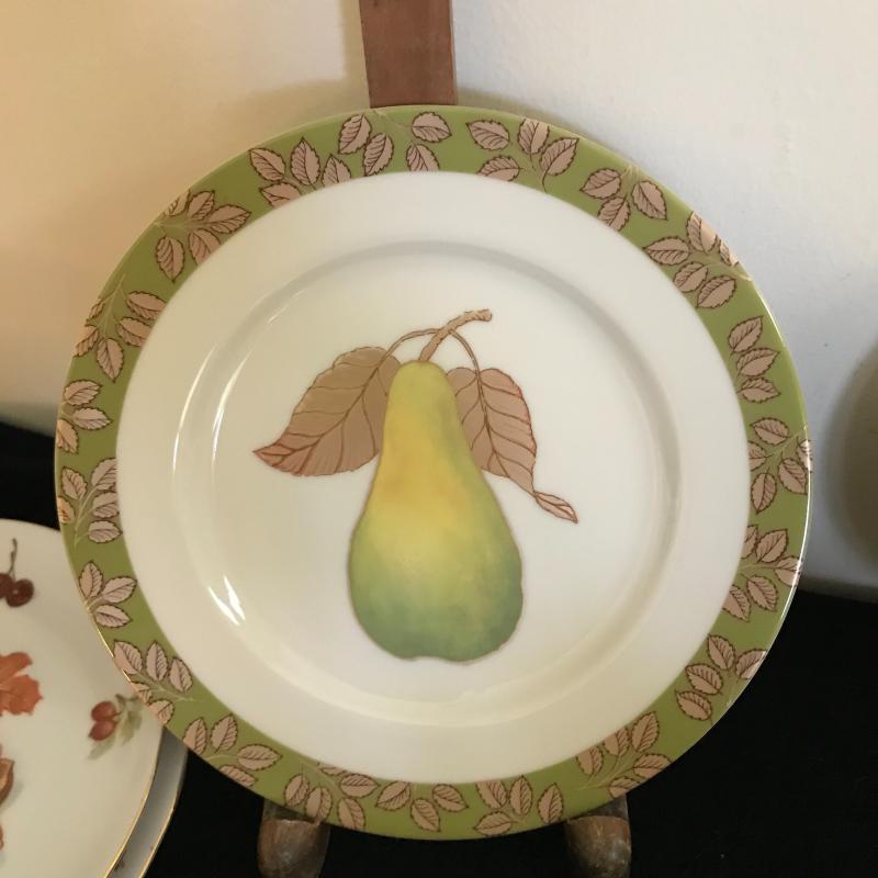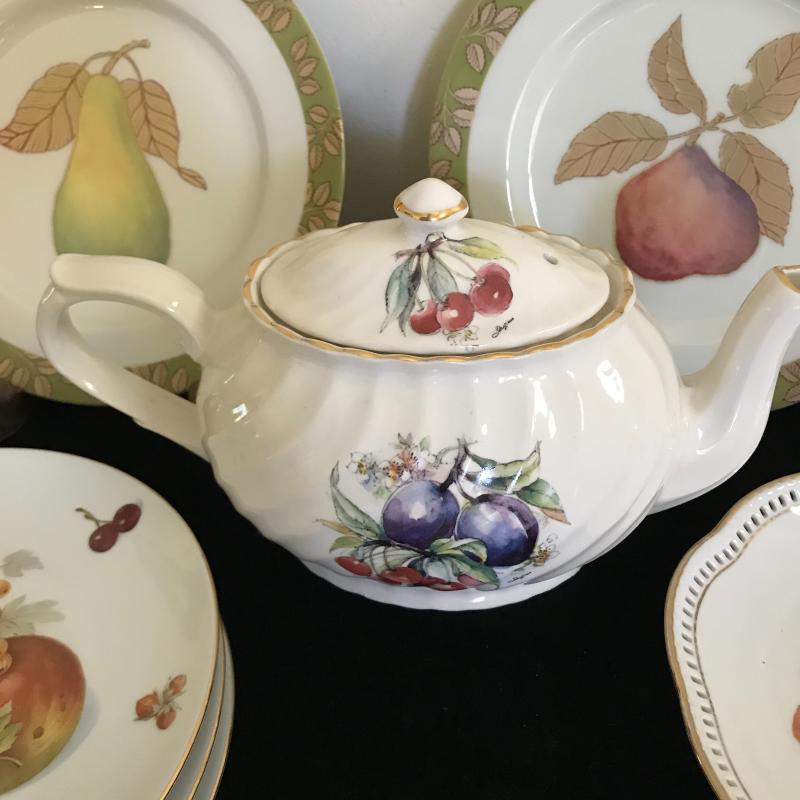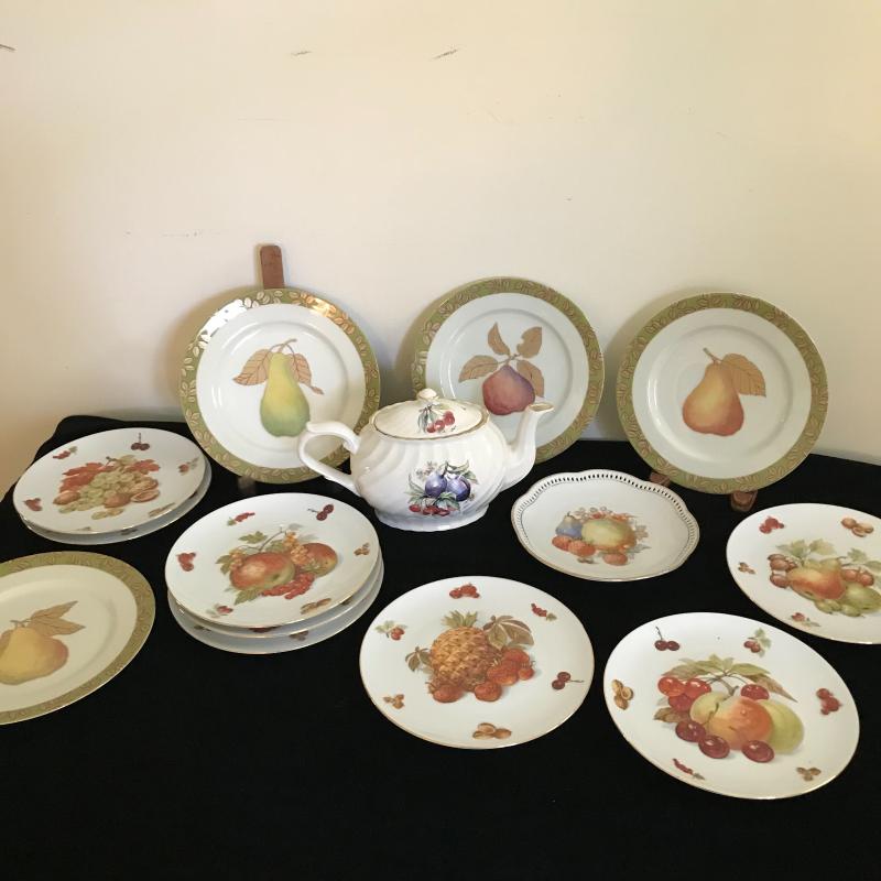 Lot includes 13 plates and one signed teapot, all with fruit prints. Markings are Prince Kensington, Schumann Arzberg Germany, Feltmann Weidew western Germany, and Crate and Barrel. No shipping available. Local pickup only in Hendersonville, NC.