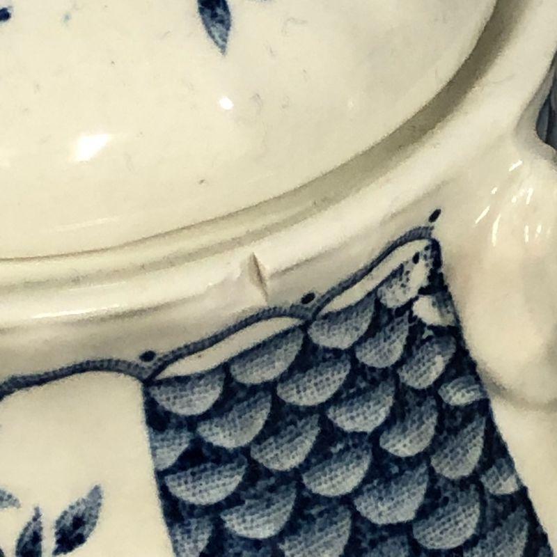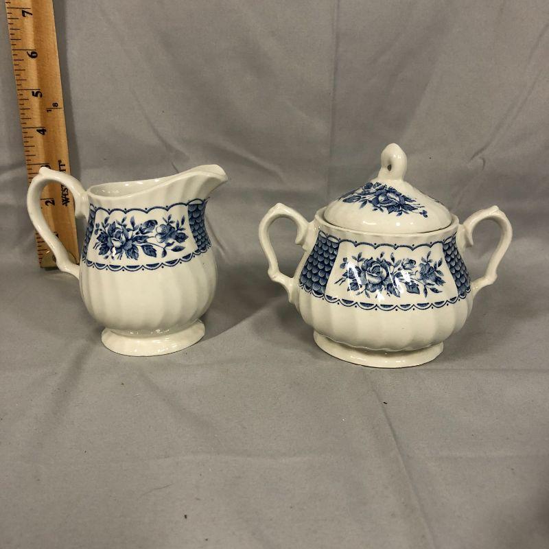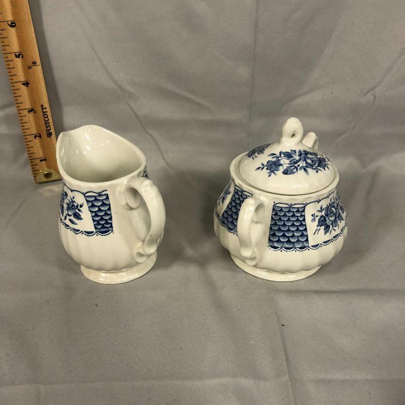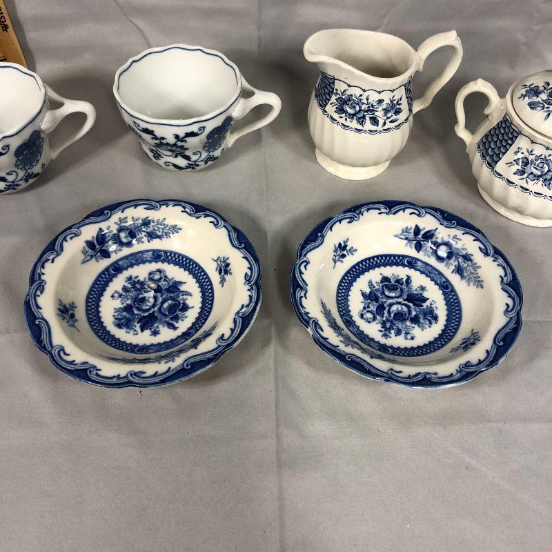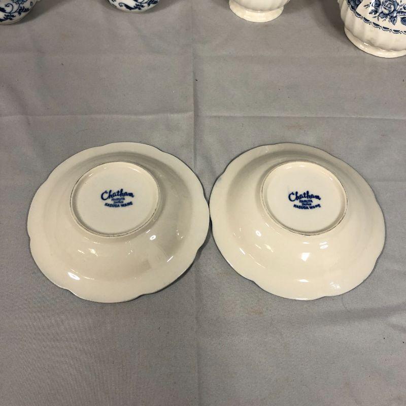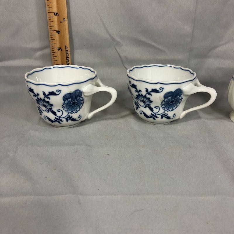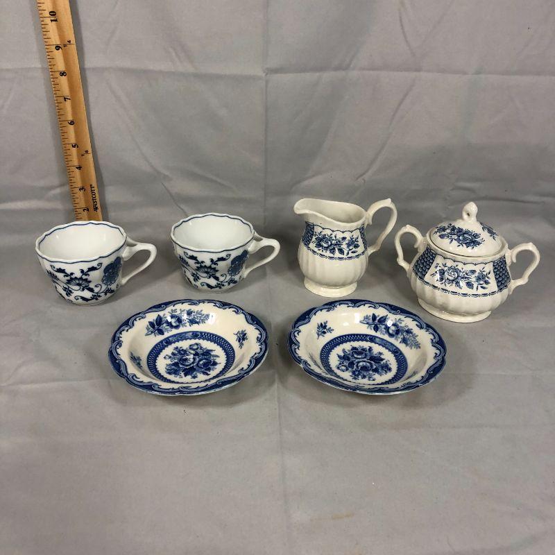 All of the pieces are in excellent shape with no issues except for the sugar bowl - it has a small chip on the rim by the handle. The two small berry bowls are Chatham Maruta of Japan Kasuga Ware. The two cups are Blue Danube in the blue onion pattern and one has an older stamp than the other. The creamer and sugar are the Melody pattern by Myott and made circa 1989.