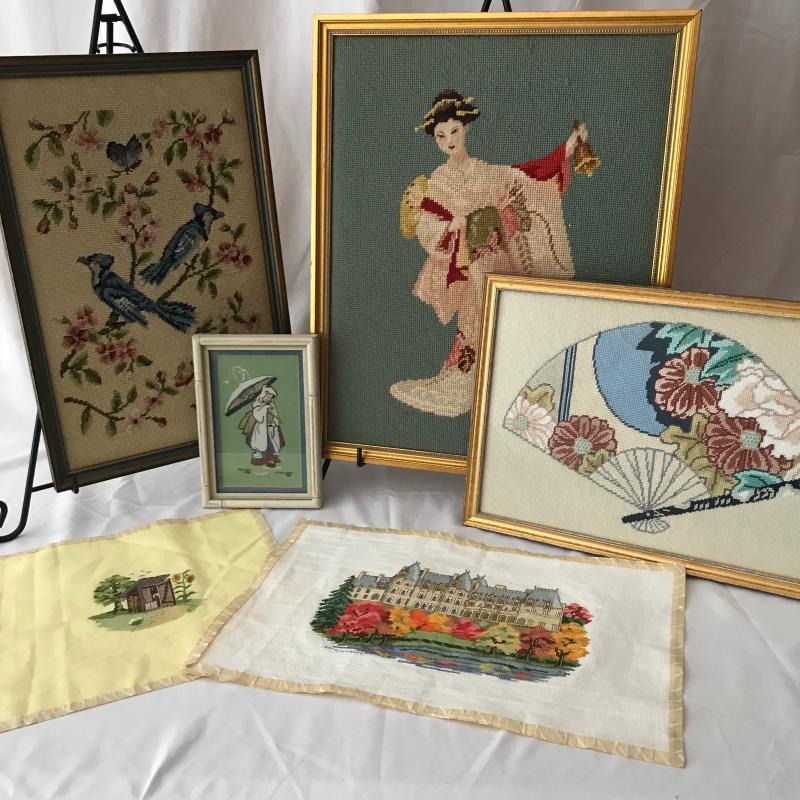 This lot contains 6 beautifully sewn art pieces. Four are framed, two are unframed. Largest piece is approx. 21” x 17”. See pics for markings and details. Shipping available or local pickup in Asheville, NC. Please note that shipping artwork can be expensive.