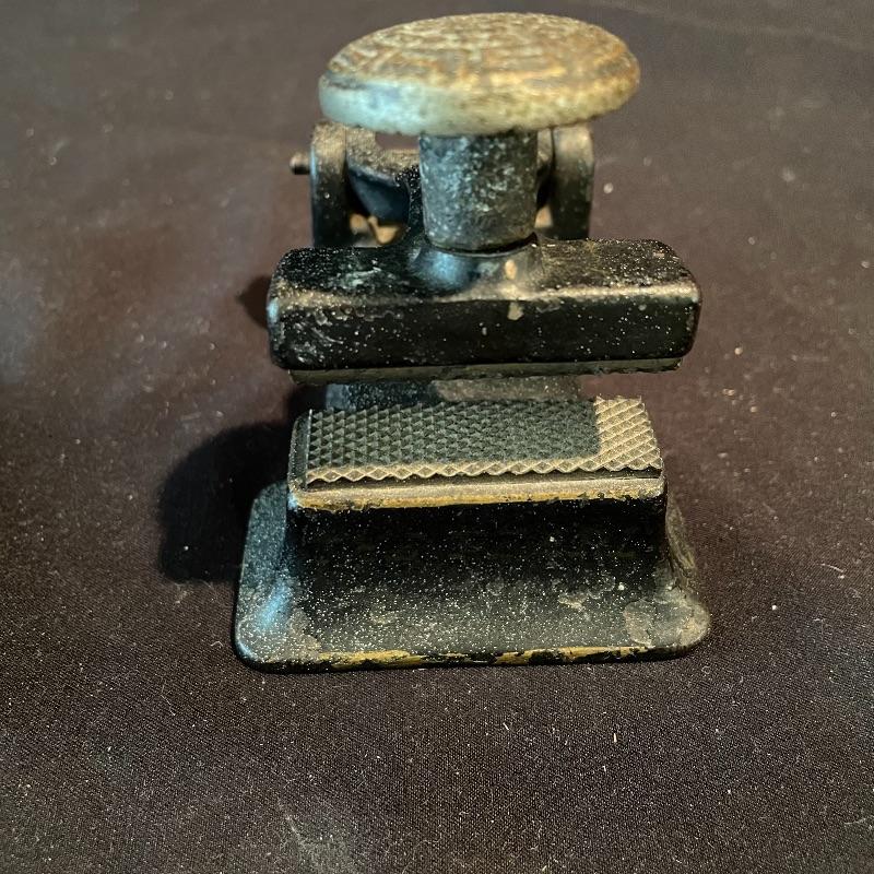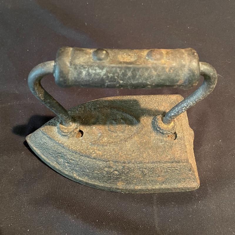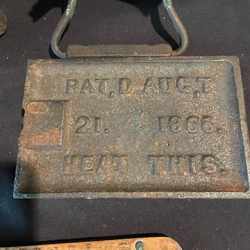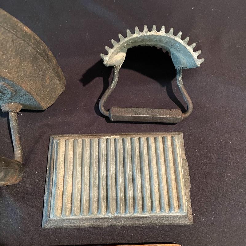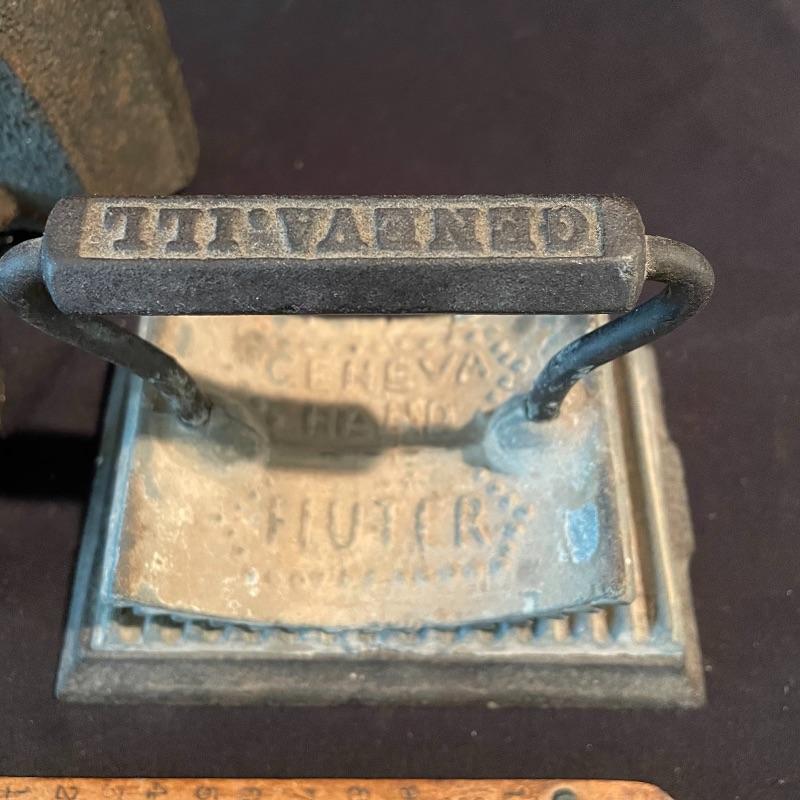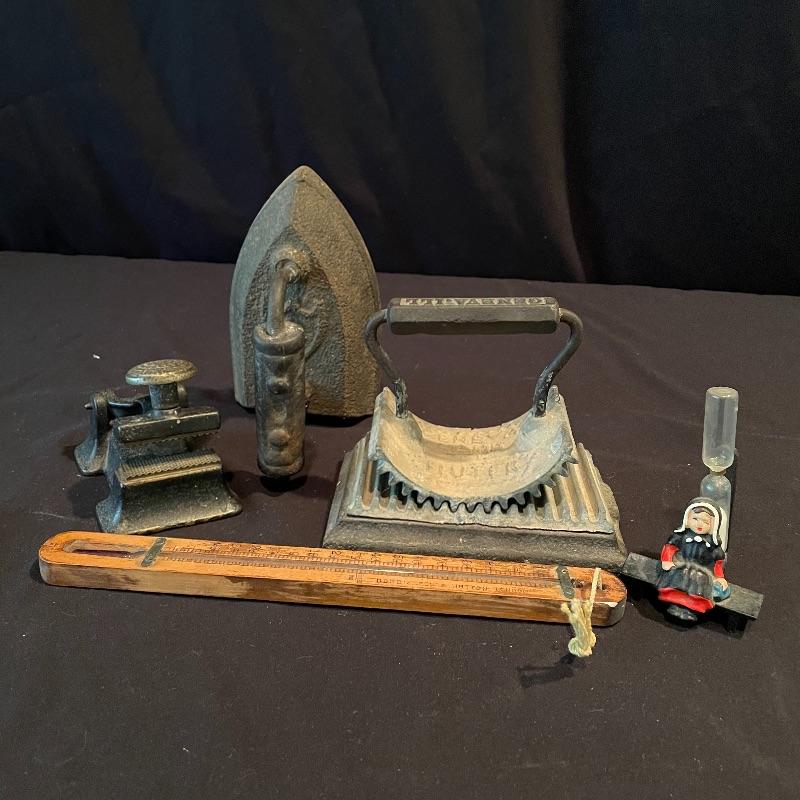 Perfect for the farmhouse or antique enthusiasts. Geneva Hand Fluter, full metal iron, unique metal press and adorable metal decor with about a 4 minute hourglass timer. The iron measures approximately 7” x 4” x 5.25”. Lot also features a wooden encased thermometer. Shipping available, please note these items are heavy. Please call UPS at 828-252-6930 for a quote prior to bidding.
