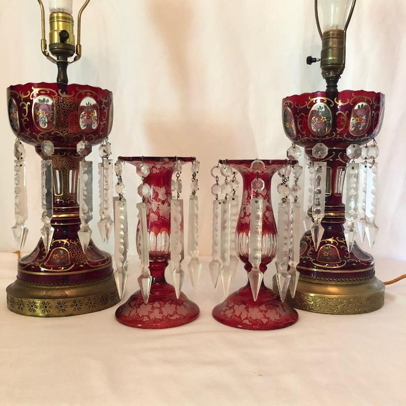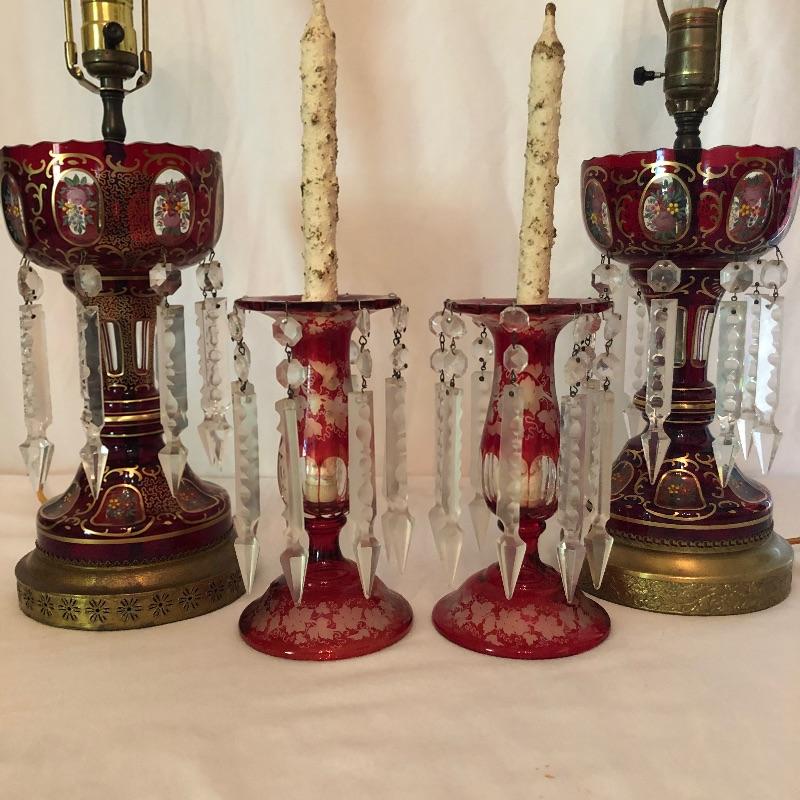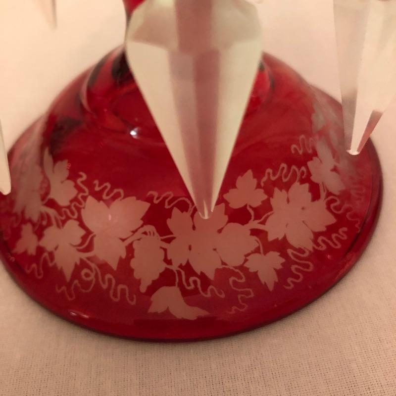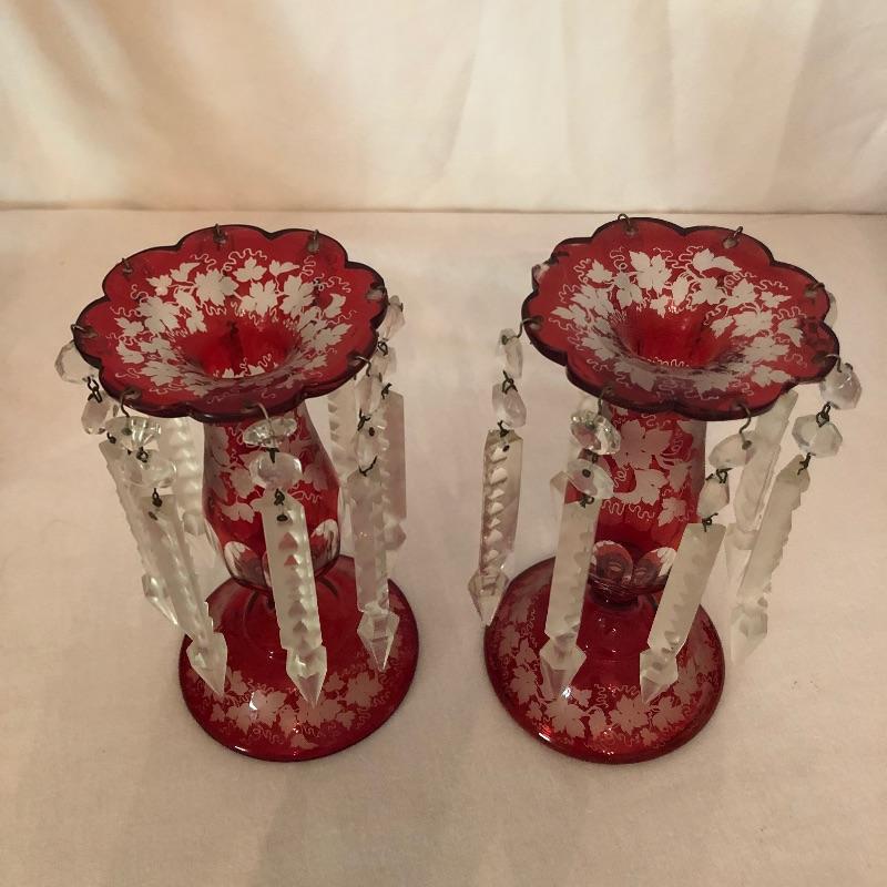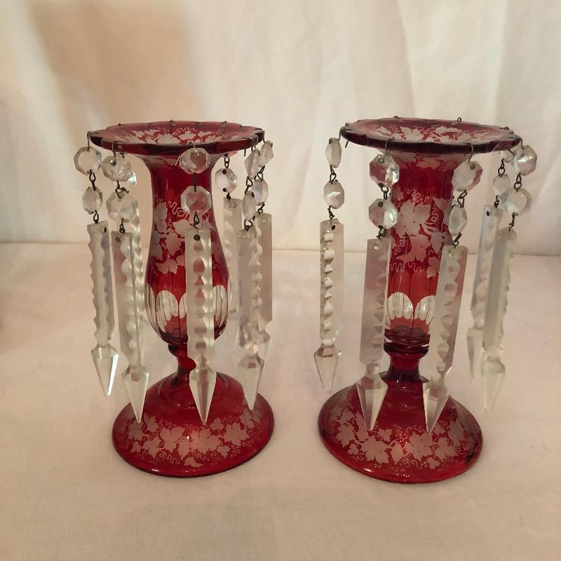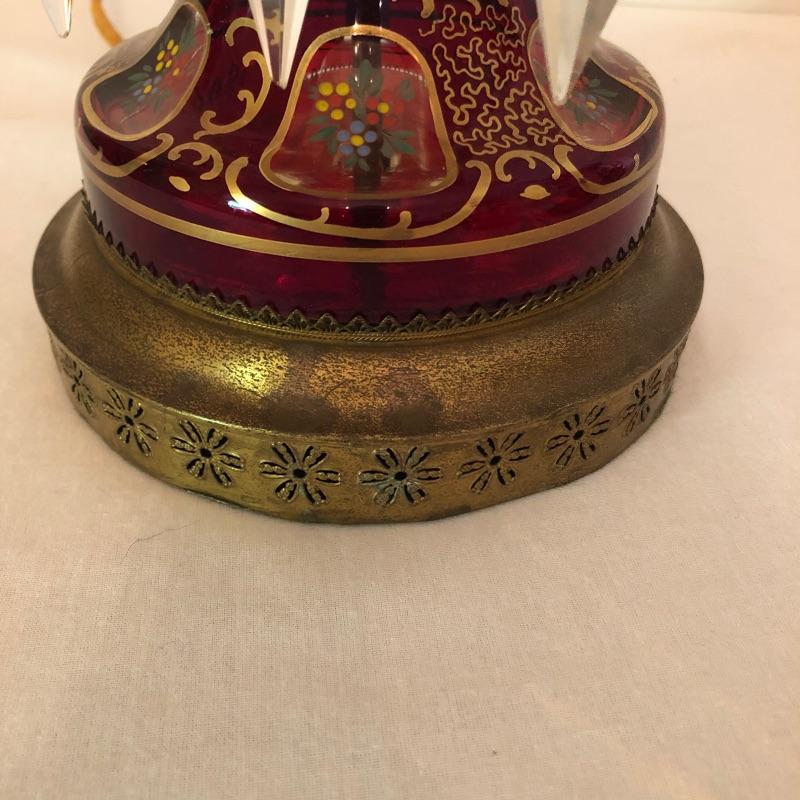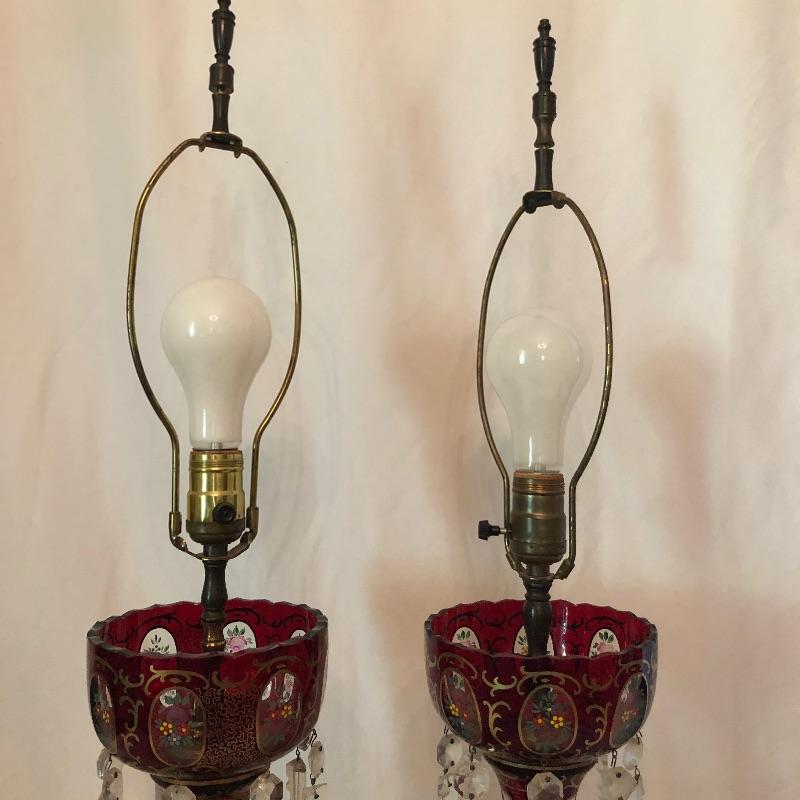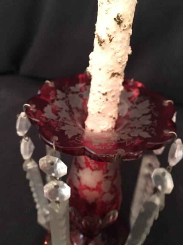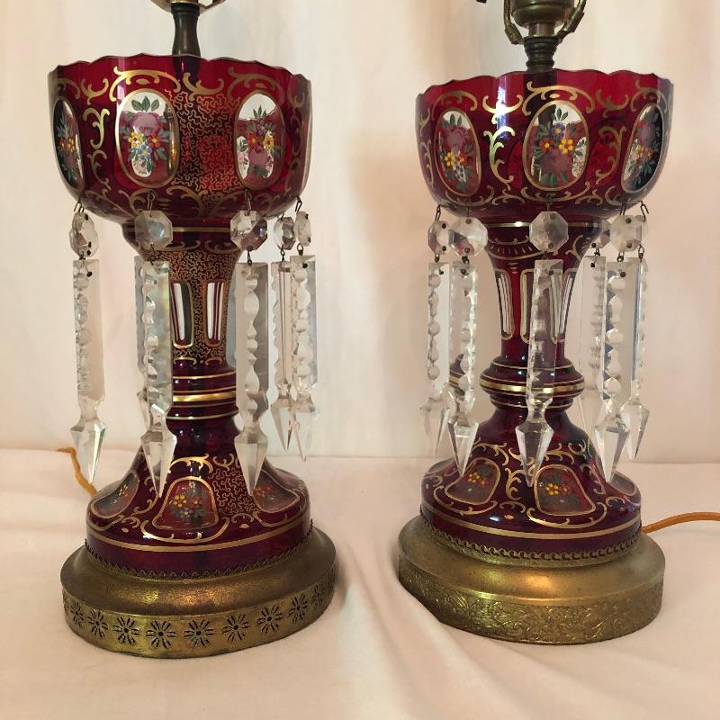 Ruby red glass with clear glass cut spears make up these decadent lamps with brass or brass colored bases and hand painted flowers. Each lamp has 8 hanging cut spears that catch the light as they sway when touched. It’s high time these beauties were given shades worthy of them; lampshades are however included. Notice in images that the bases are ever so slightly different to on another. Lot also includes two candlesticks that are a lighter red glass with a leaf design. Unfortunately, a small chip has made it impossible to hang one of the cut spears, see image. It will not be possible to recreate a hole, but it would be possible to glue the hook in place.