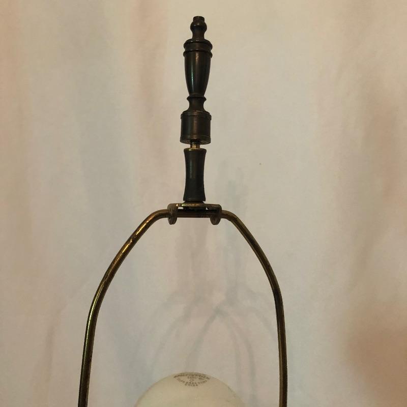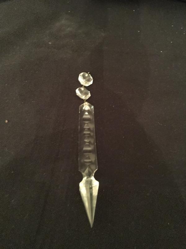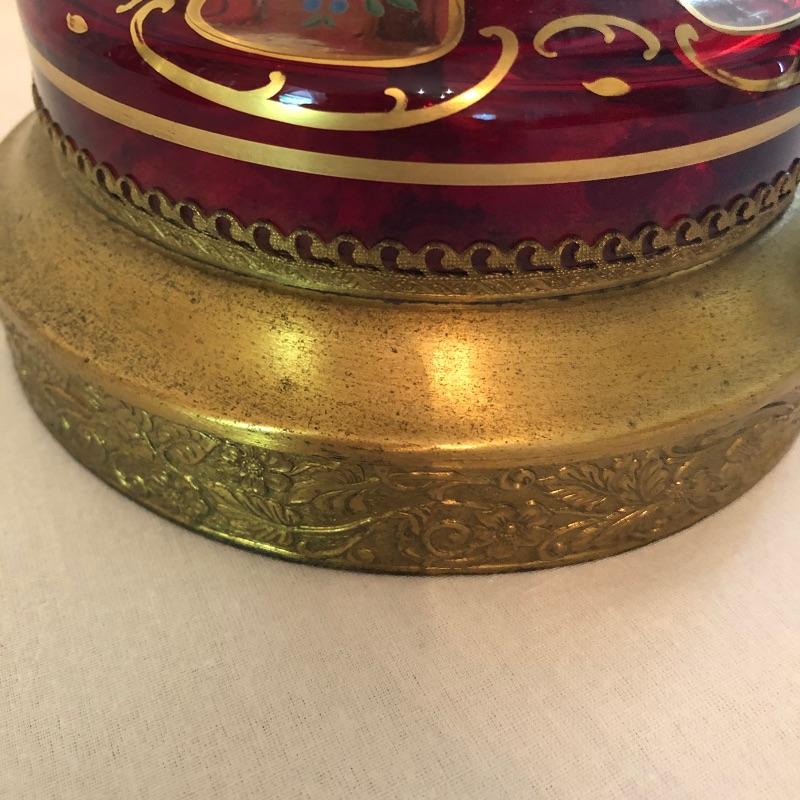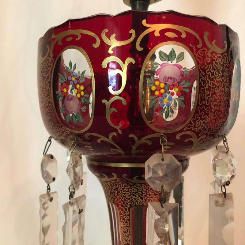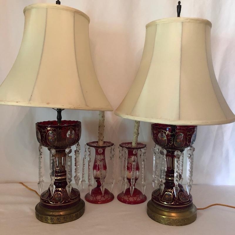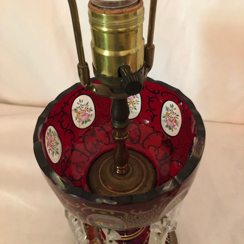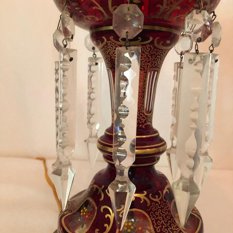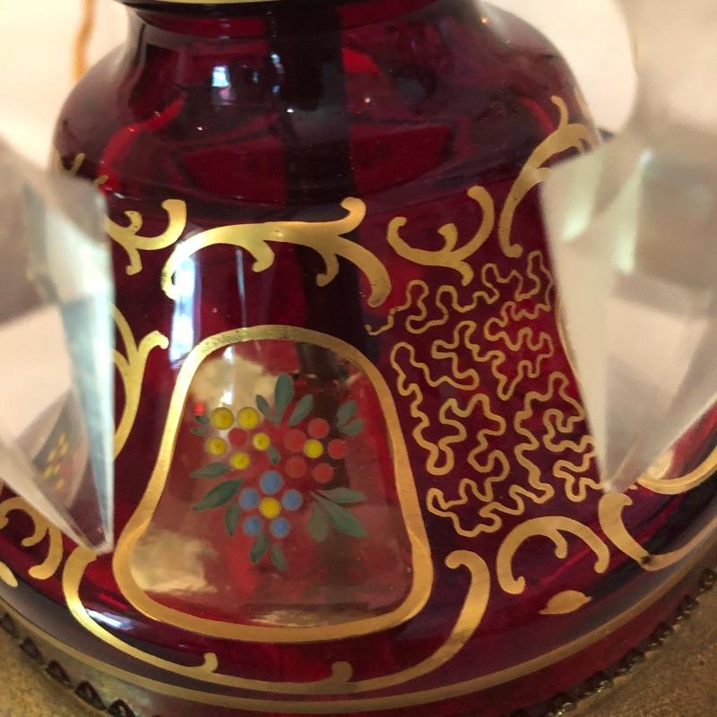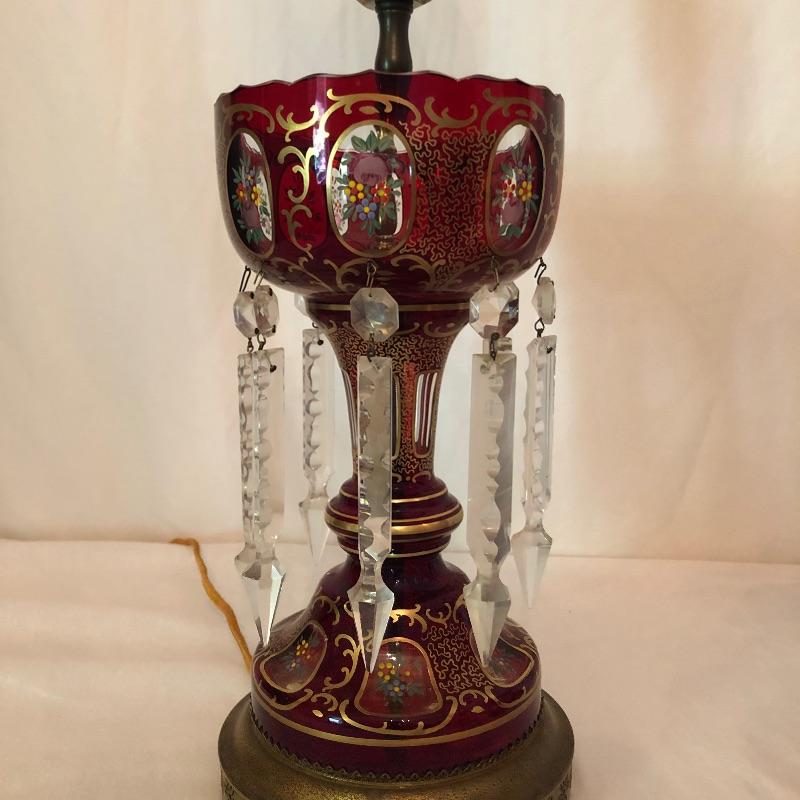 Ruby red glass with clear glass cut spears make up these decadent lamps with brass or brass colored bases and hand painted flowers. Each lamp has 8 hanging cut spears that catch the light as they sway when touched. It’s high time these beauties were given shades worthy of them; lampshades are however included. Notice in images that the bases are ever so slightly different to on another. Lot also includes two candlesticks that are a lighter red glass with a leaf design. Unfortunately, a small chip has made it impossible to hang one of the cut spears, see image. It will not be possible to recreate a hole, but it would be possible to glue the hook in place.