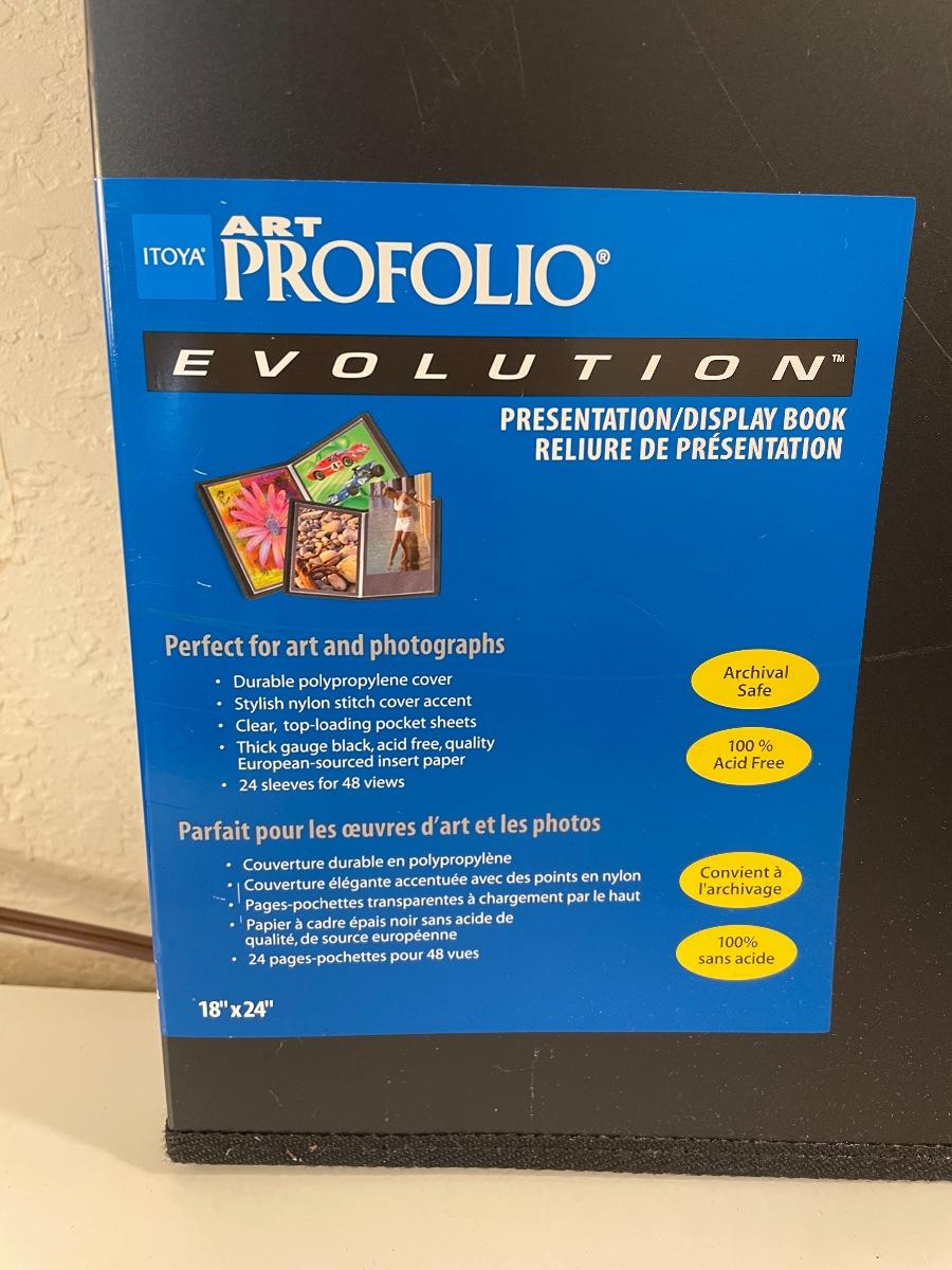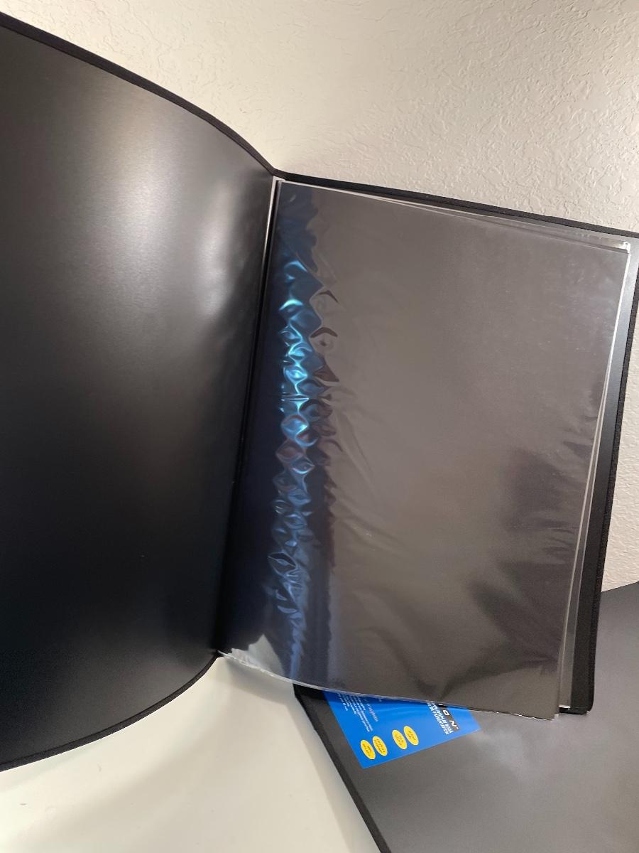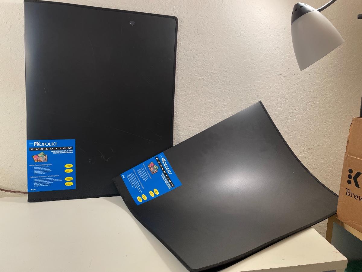 Vinyl carrying cases filled with plastic sleeves for transporting and storing art. Sleeves measure 16" X 24"
