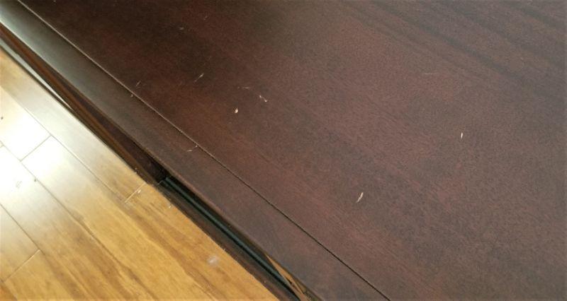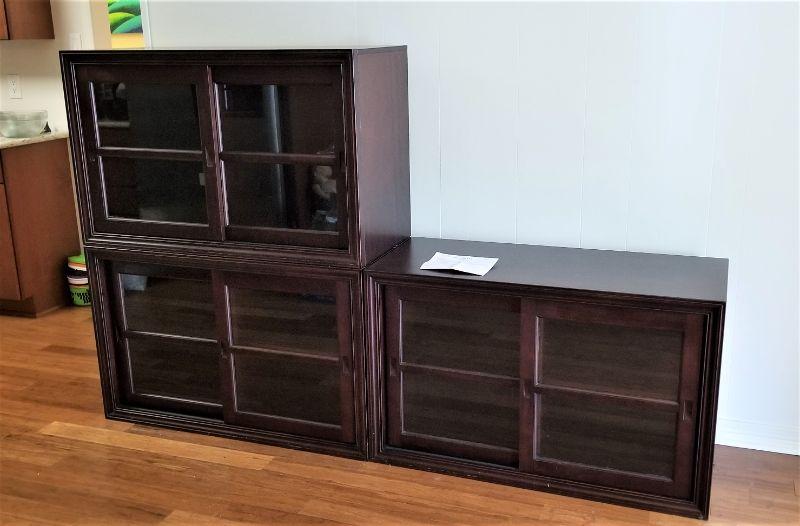 Three piece media center from Pottery Barn (paperwork included) - each unit 42" across, 18" wide, 26.25" tall. Glass doors can be removed if you prefer open shelving and units can be stacked in any configuration. One has a few minor boo-boos (as shown). Dark Brown color. This was an expensive set.