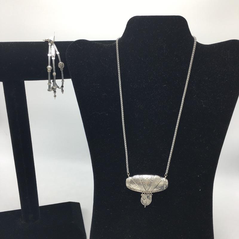 Silpada lot includes Haiku bracelet trio in sterling silver and cubic zirconia that measures 8” long and a Party Perfect necklace of etched sterling silver that measures 22”.