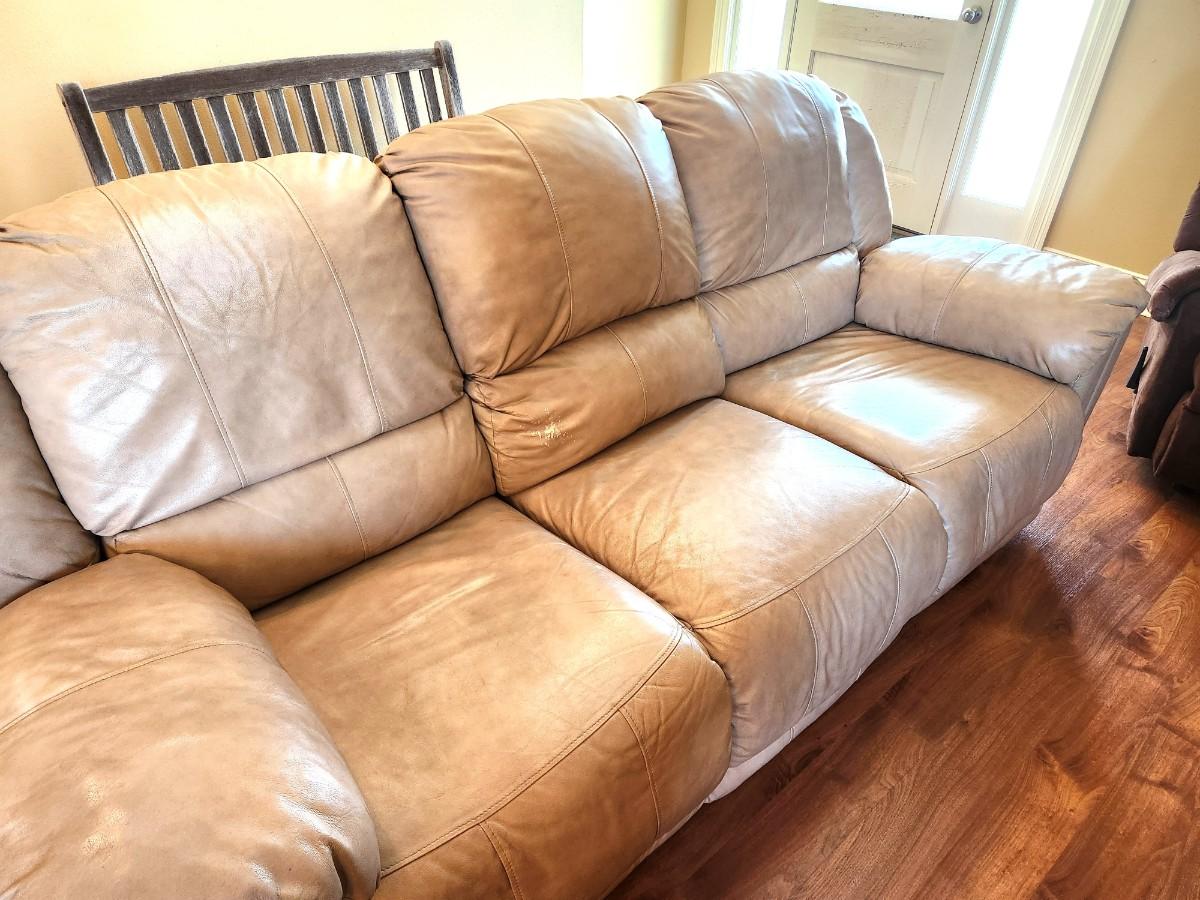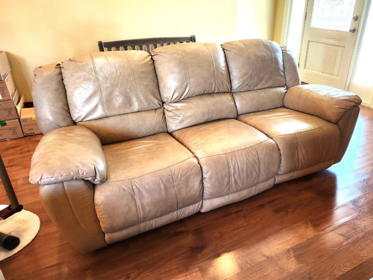Decent used condition - sofa/double recliner (end pieces) - 1 worn spot (has paint flecks that can be removed). 33" deep, 40" tall, 7 feet across. This item is upstairs. Perfect for 1st apartment - man cave - pool house - deer/fishing camp.