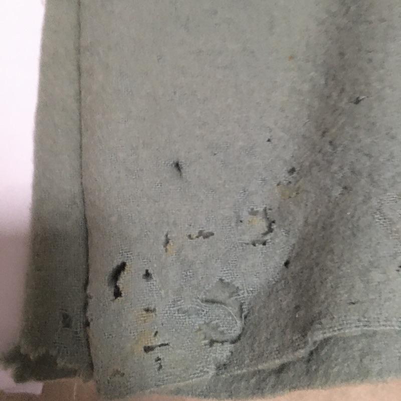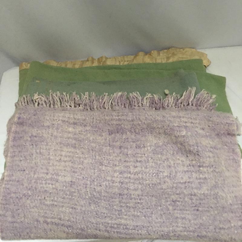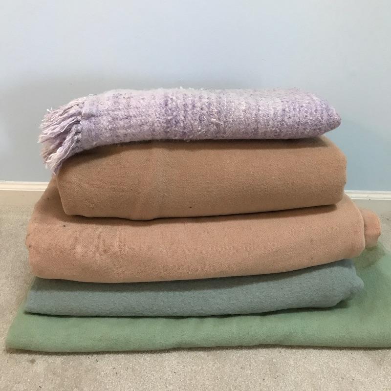 Five wool blankets. Some blankets have stains and moth damage but are still warm! Great for all your crafting needs, your pets or to keep warm this winter. 2 brown, 2 green and one purple.