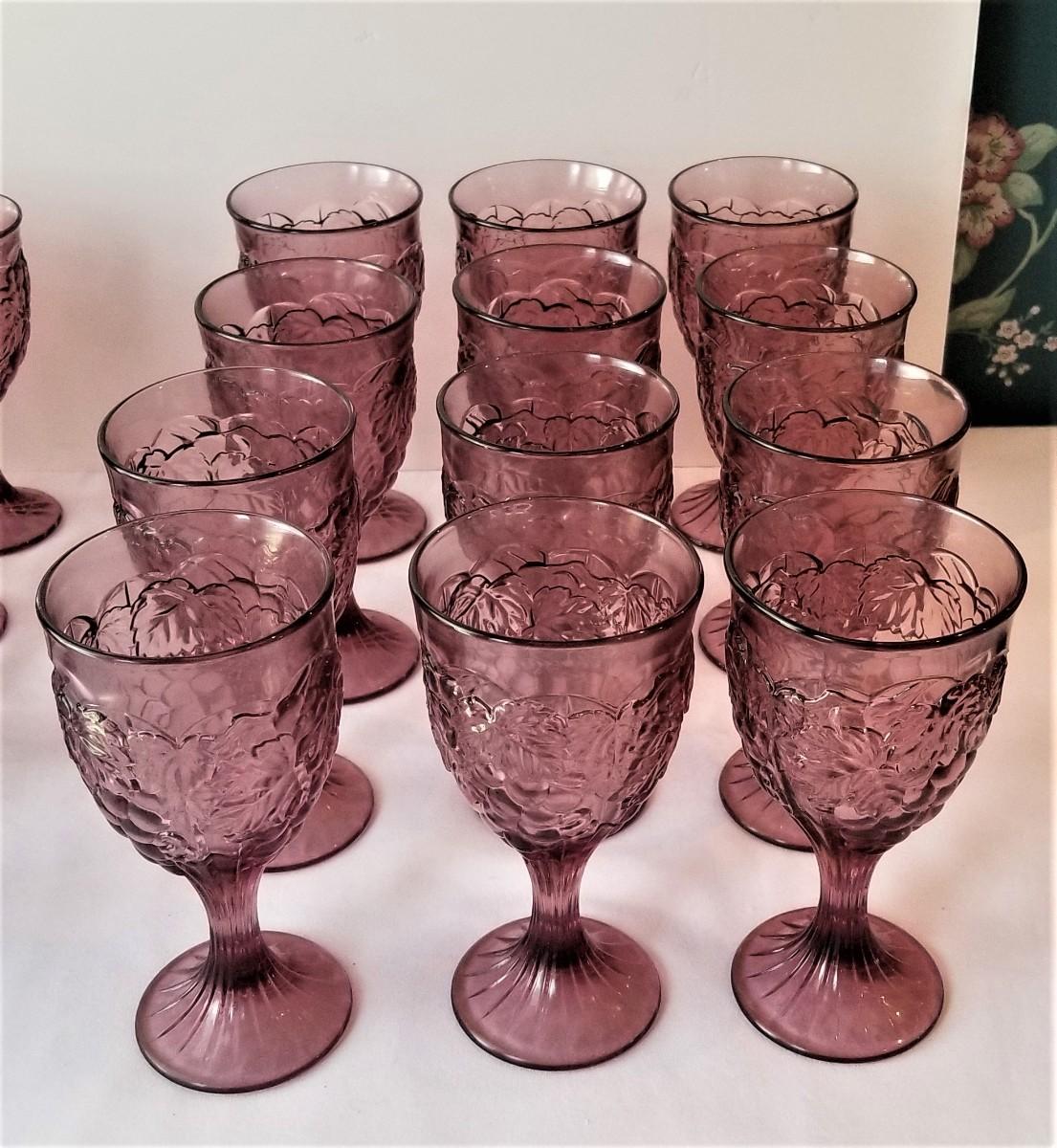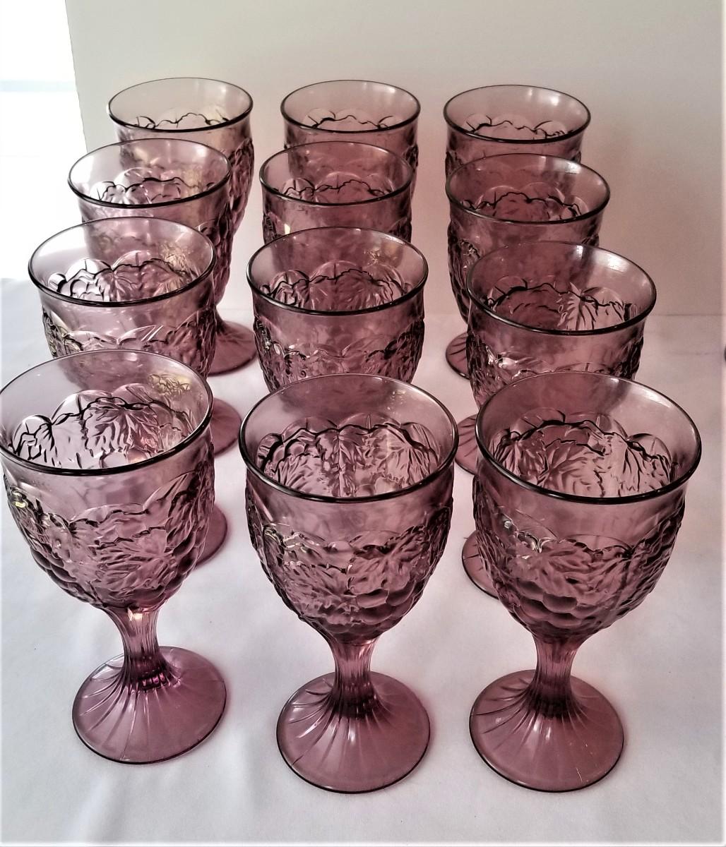 Two sets of 12, as shown. The smaller set is 6.5" tall, the larger 7.5" tall. Pressed glass with a purple cast. Good condition.