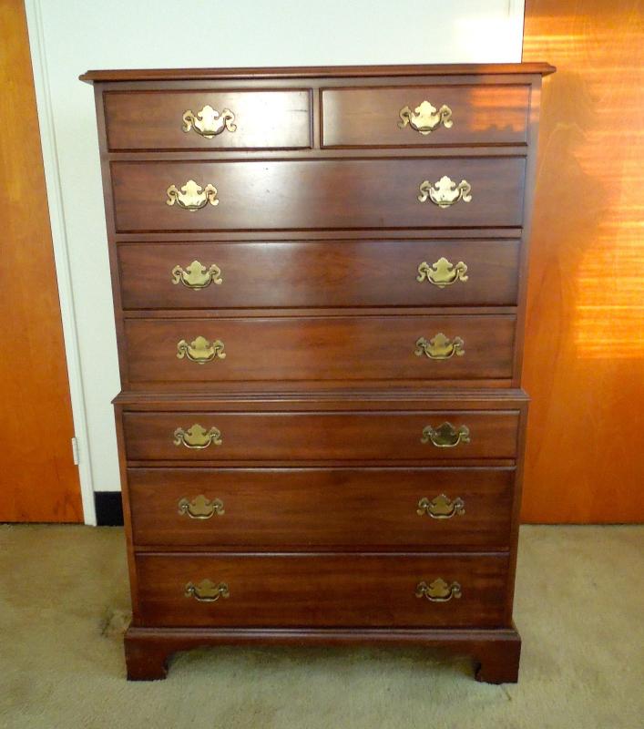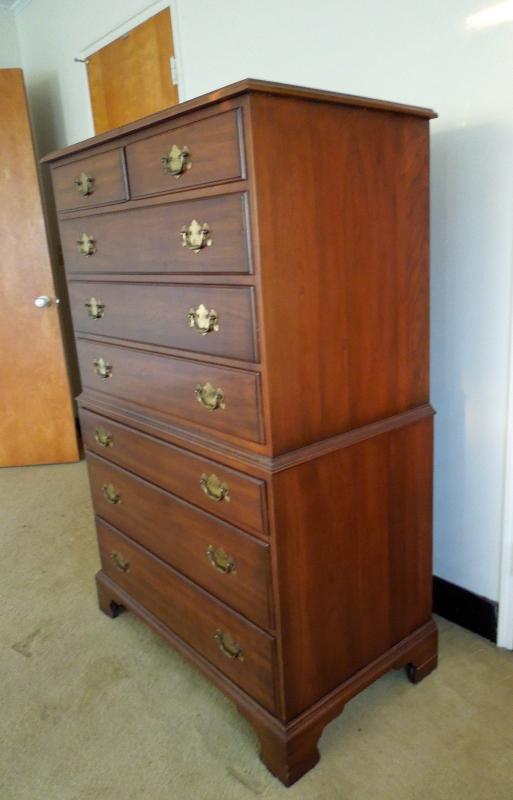 Made in Virginia of Black Cherry. Batwing brass hardware. Chippendale early american style. Dovetailed drawers. Minimal surface scratches. 36" L x 21" W x 55" H. 8 drawers.