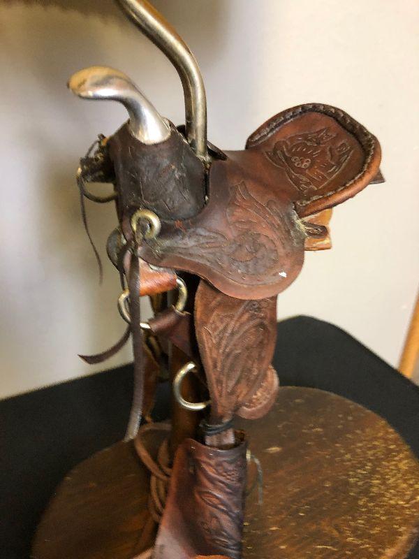 23" Tall used! Show wear but in usable condition with real miniature hand tooled leather saddle
