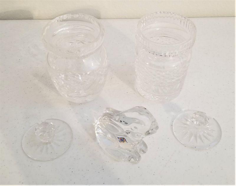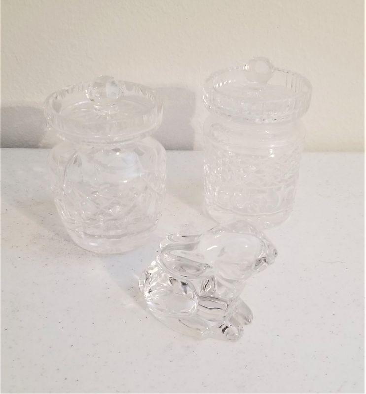 3 pieces of Waterford Crystal - 2 slotted Jam jars - each 4" tall, and a Waterford Rabbit/Bunny figurine, 2.5" tall x 3.5" long. Good condition.