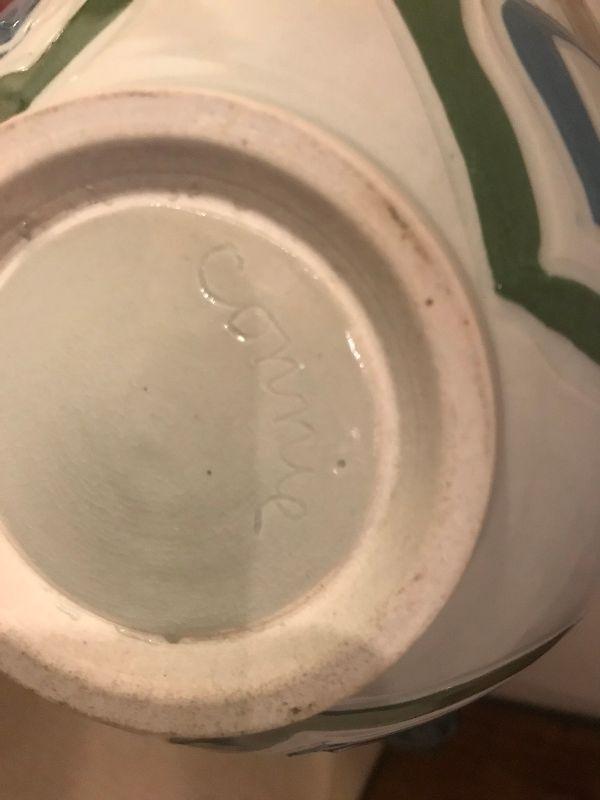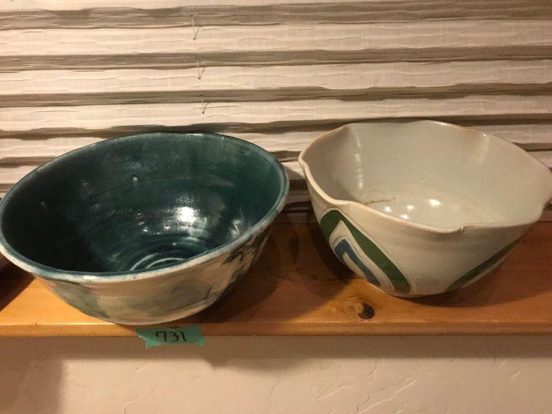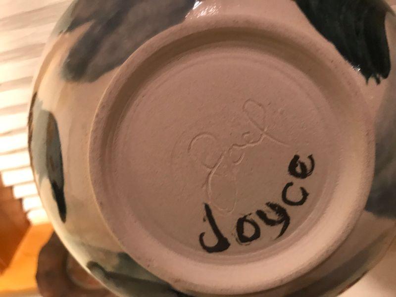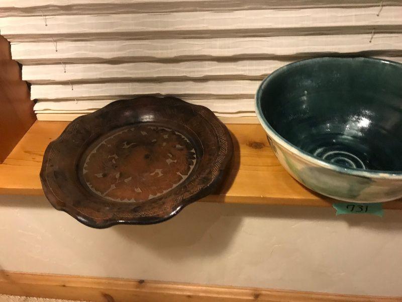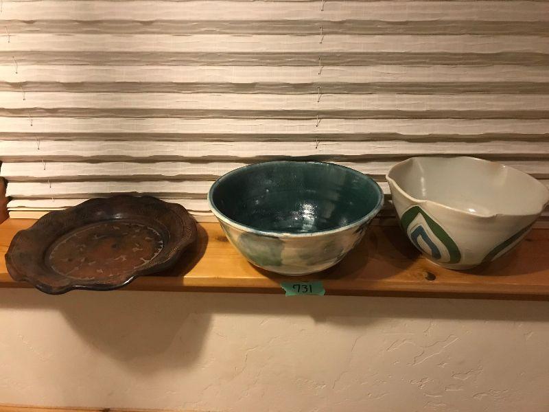 2 bowls, 1 plate 1) Green bowl 10" diam x 5" Pottery signed "Joyce" 2) Bowl 8.5" diam x 5" White Pottery, 3) 11" diam